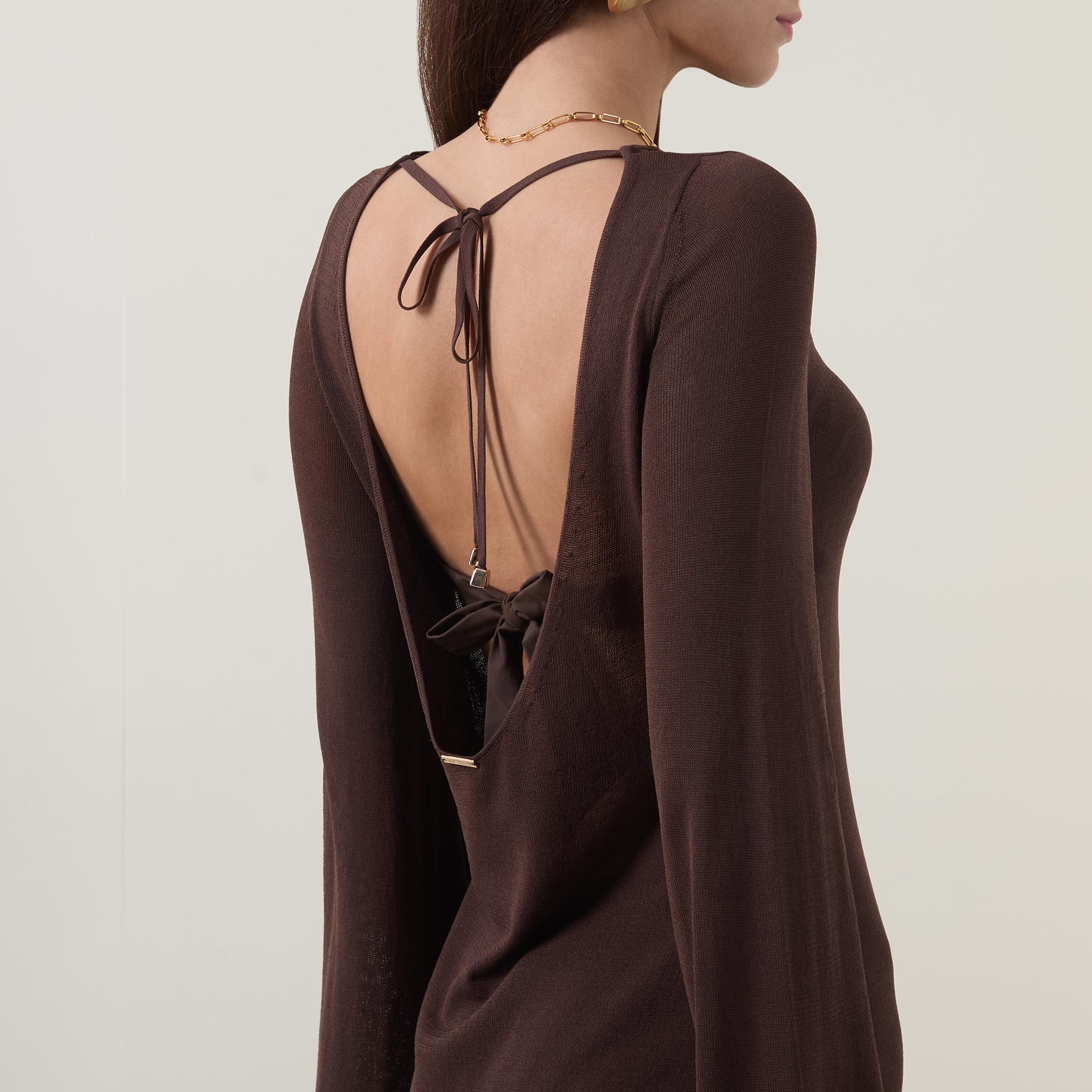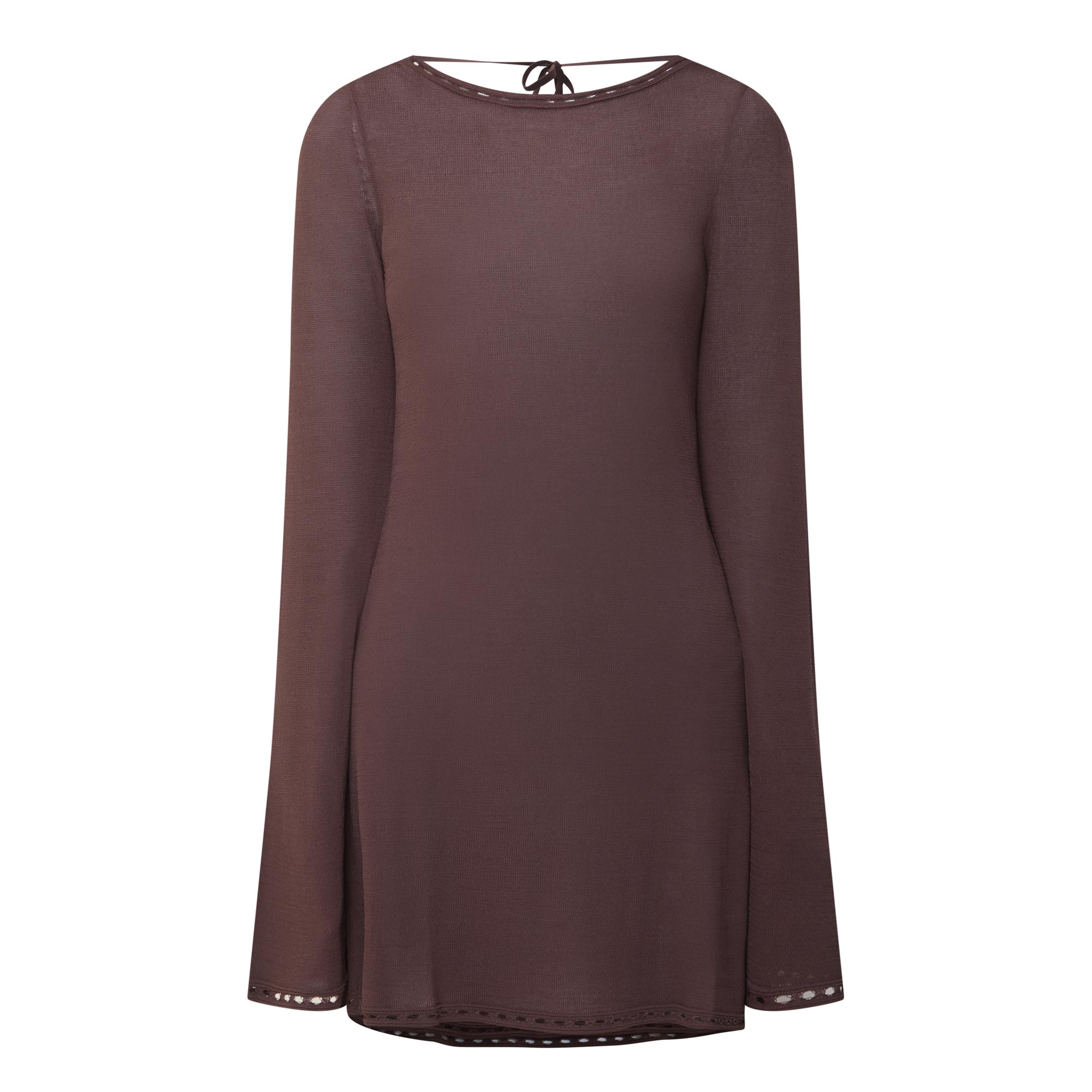 - Round neckline, low back, self-tie fastening, short length, long sleeves, crochet structure, semi-sheer finish