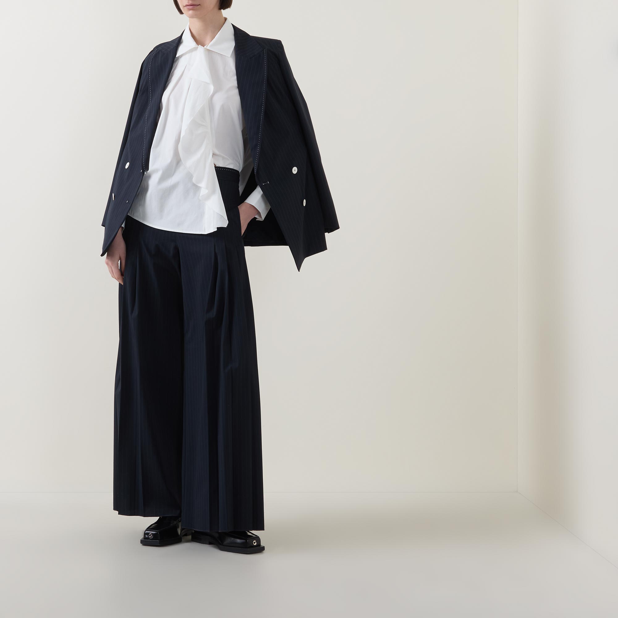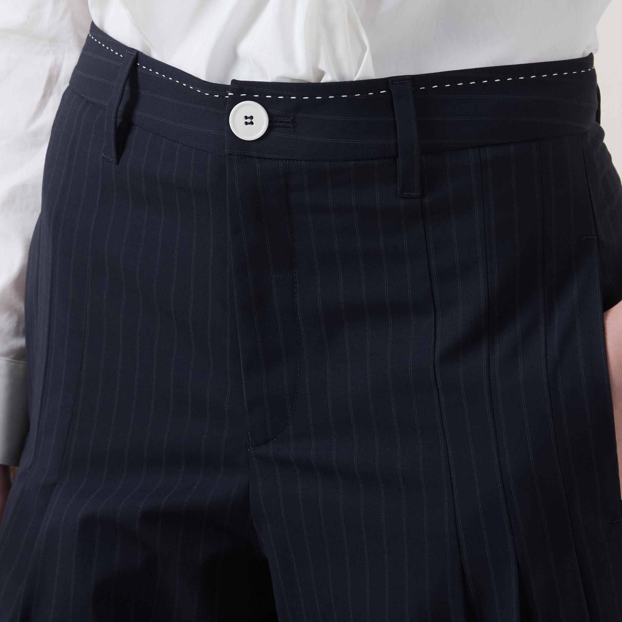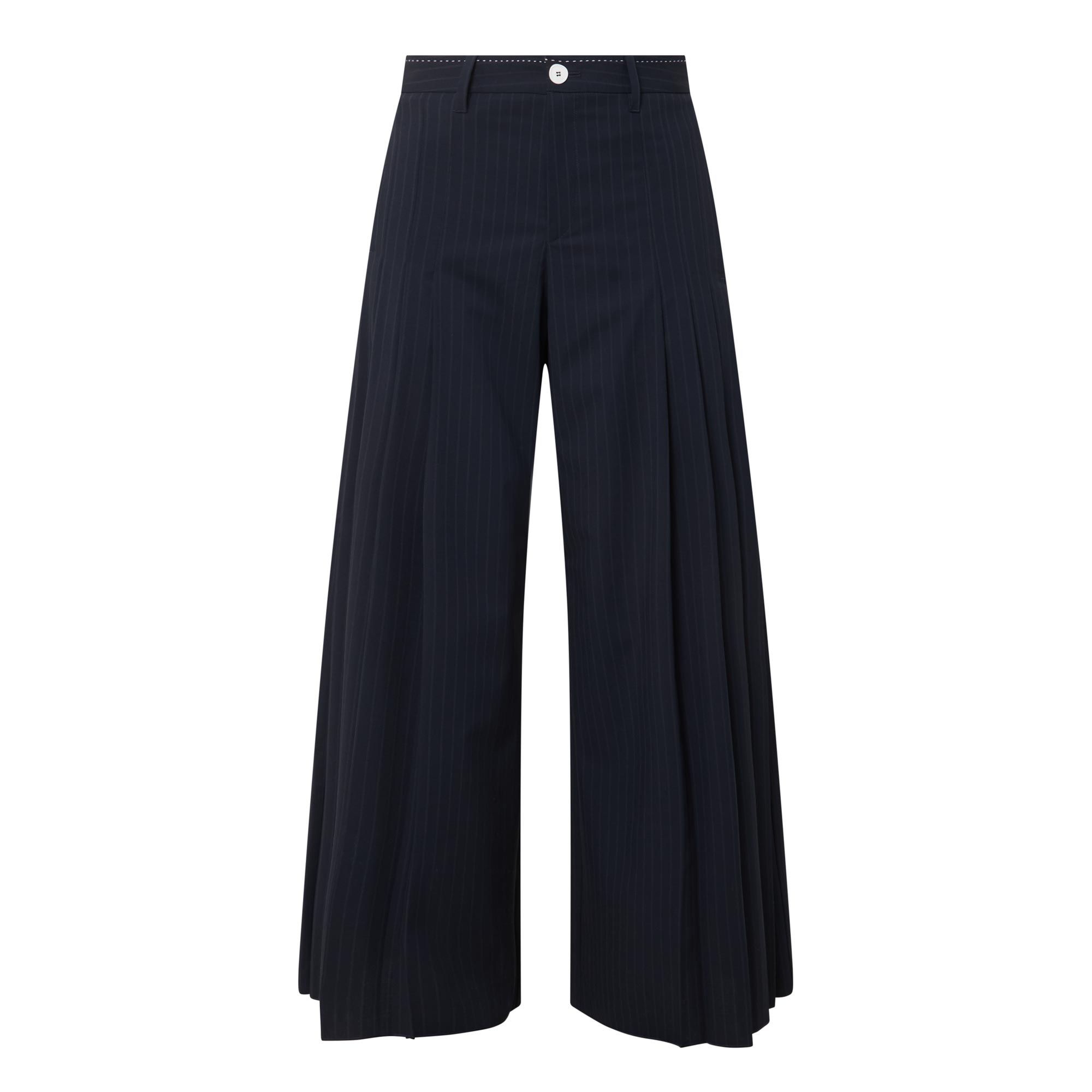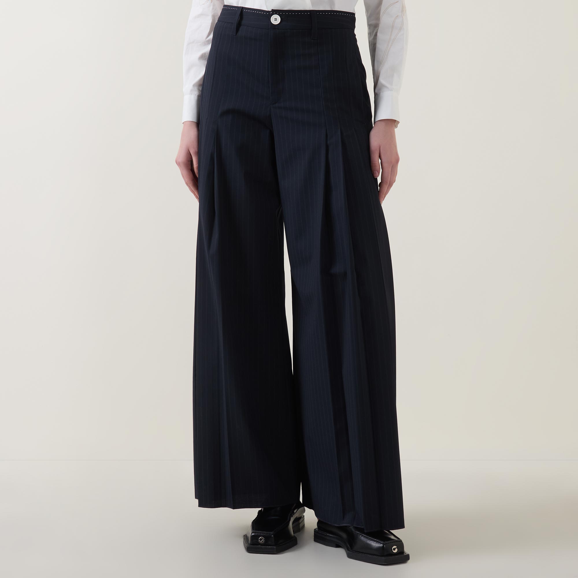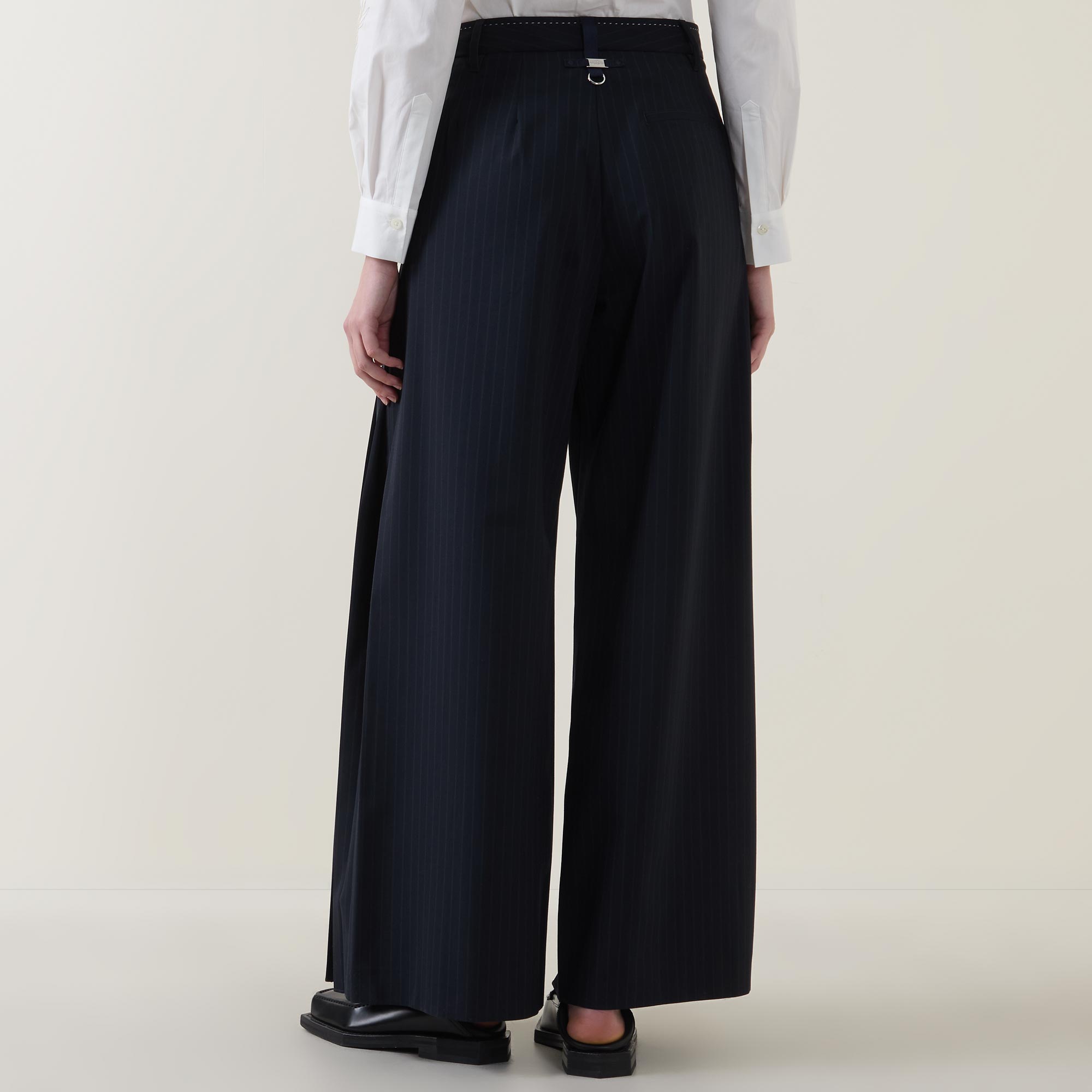 • Zip-fly and button fastening, belt loops, contrast top stitching, two side in-seam pockets, rear D-ring detail, pinstripe pattern, high-rise, wide-cut leg, pleating, smooth fabric