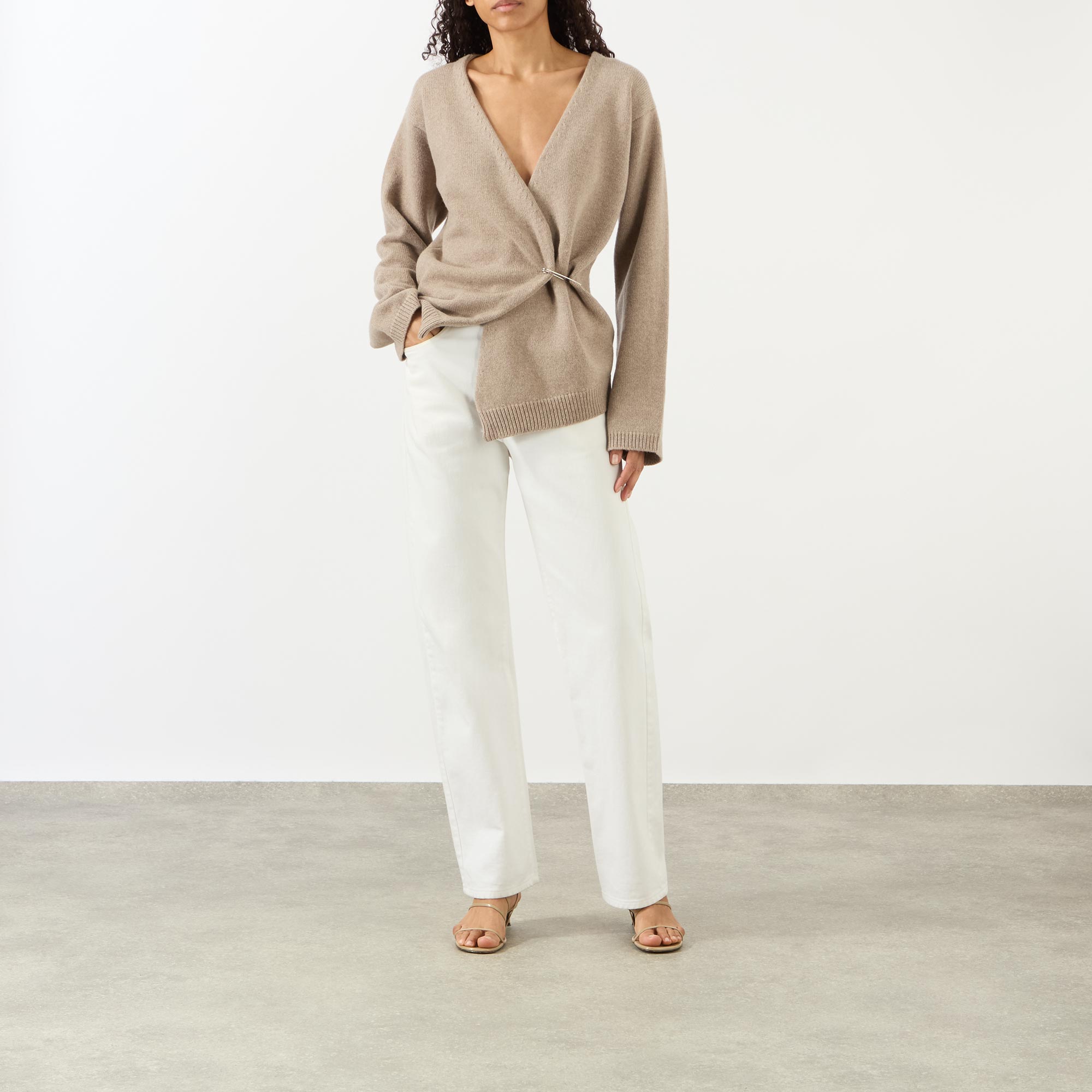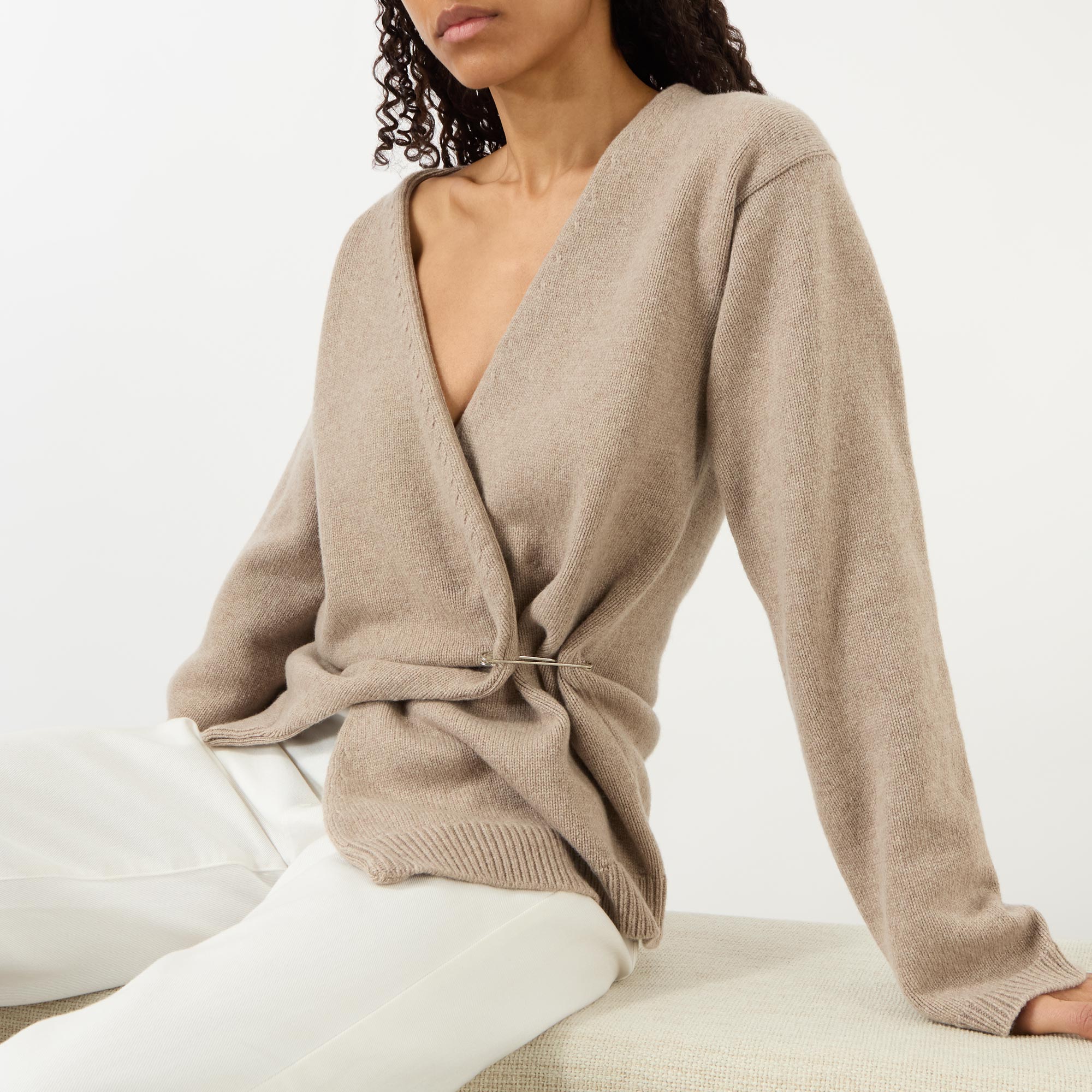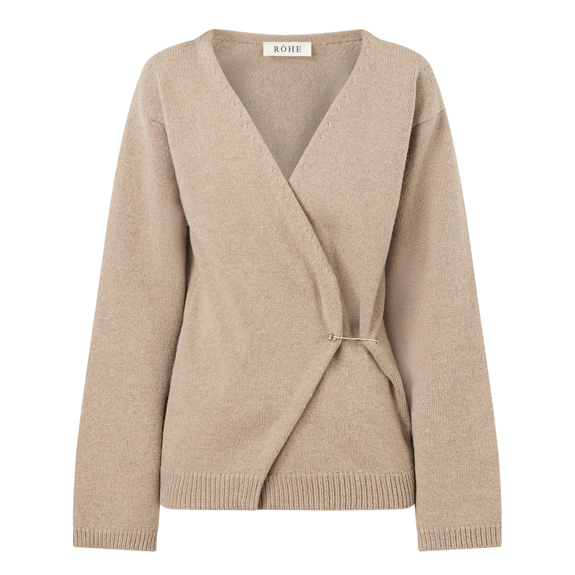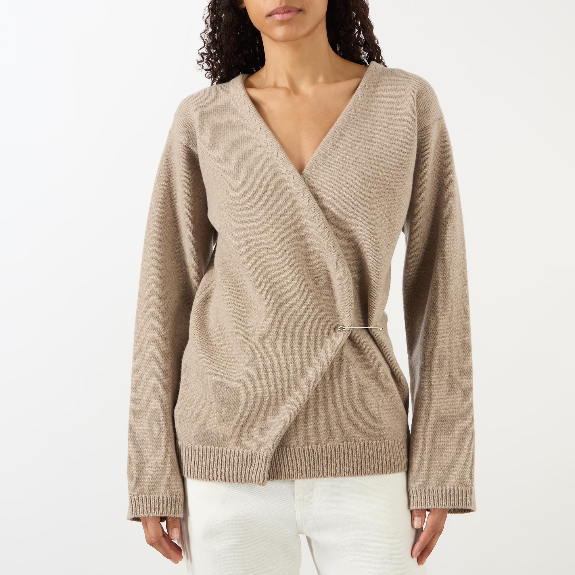 - V-neckline, long sleeves, dropped shoulders, can be worn off the shoulder, wrap front secured by a metal pin, ribbed trims, knitted finish