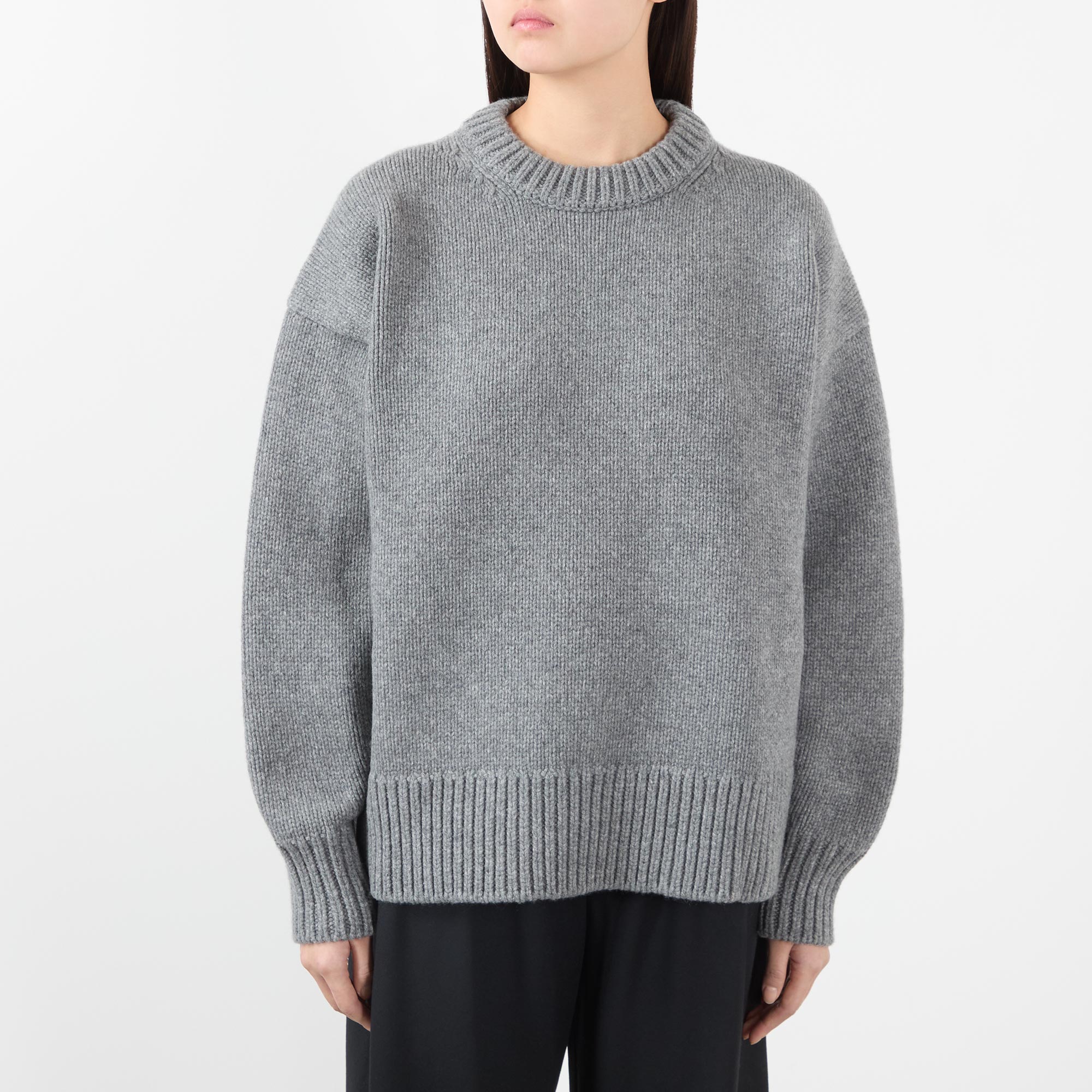 - Crew neckline, long sleeves, dropped shoulders, ribbed trims, heavyweight knit structure