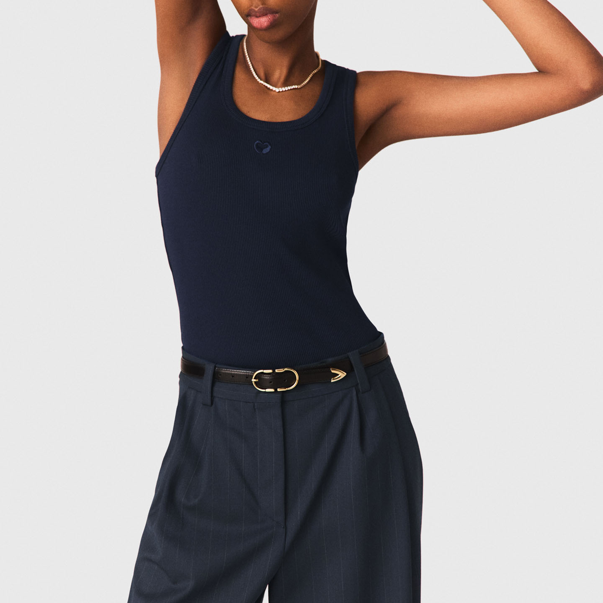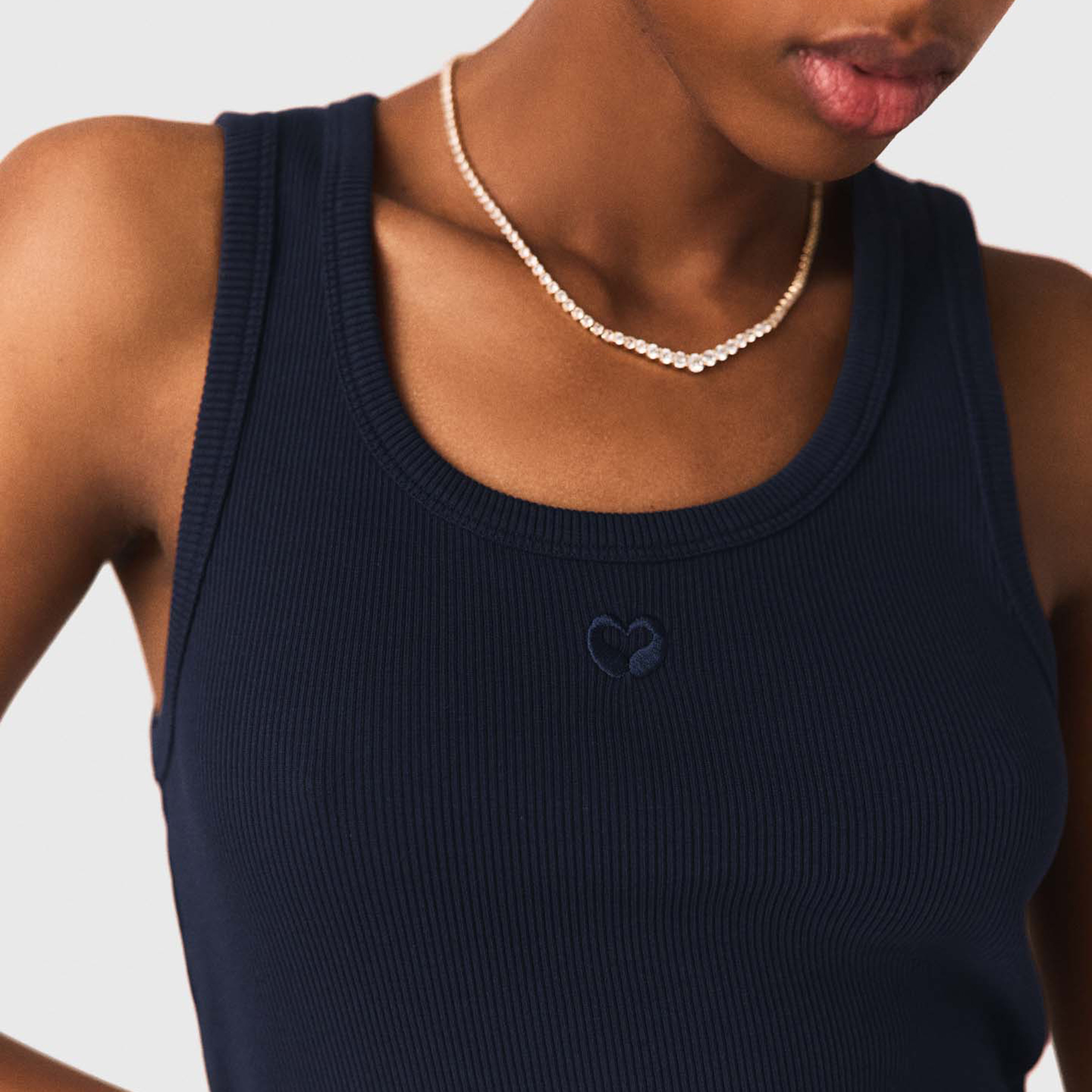 - Ribbed knit fabric, wide straps, signature logo embroidery, scoop round neckline