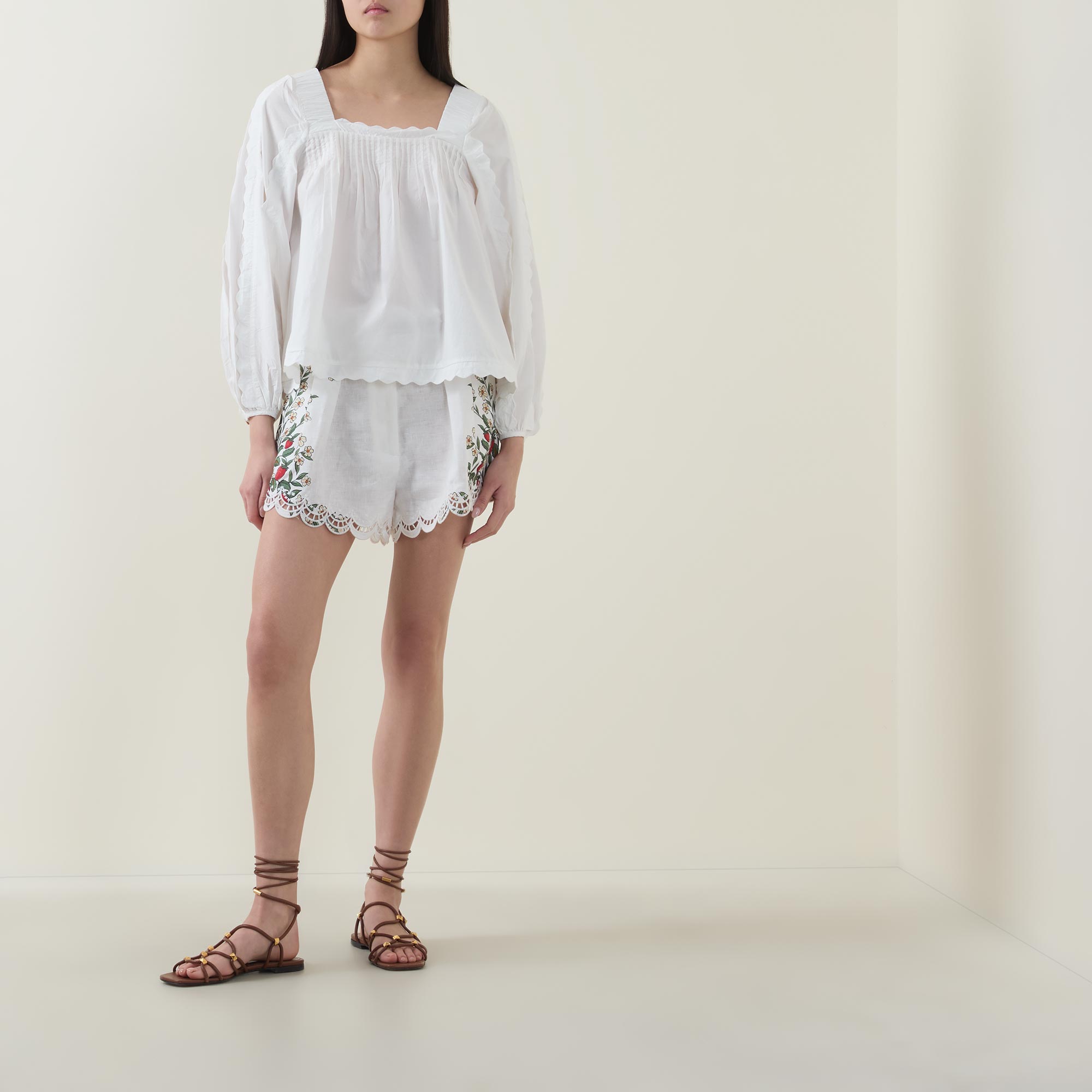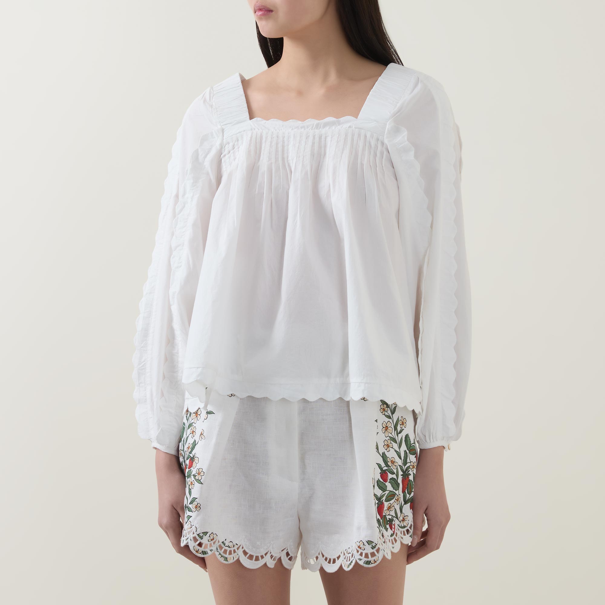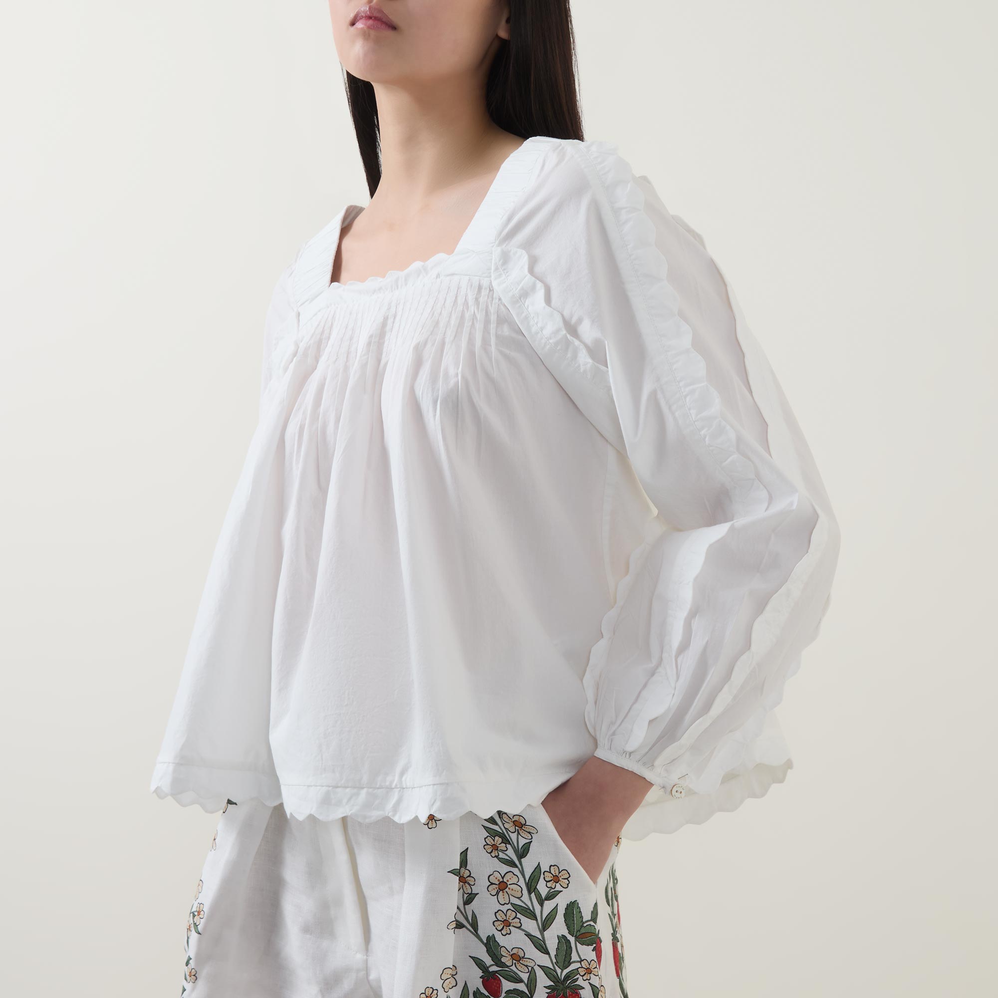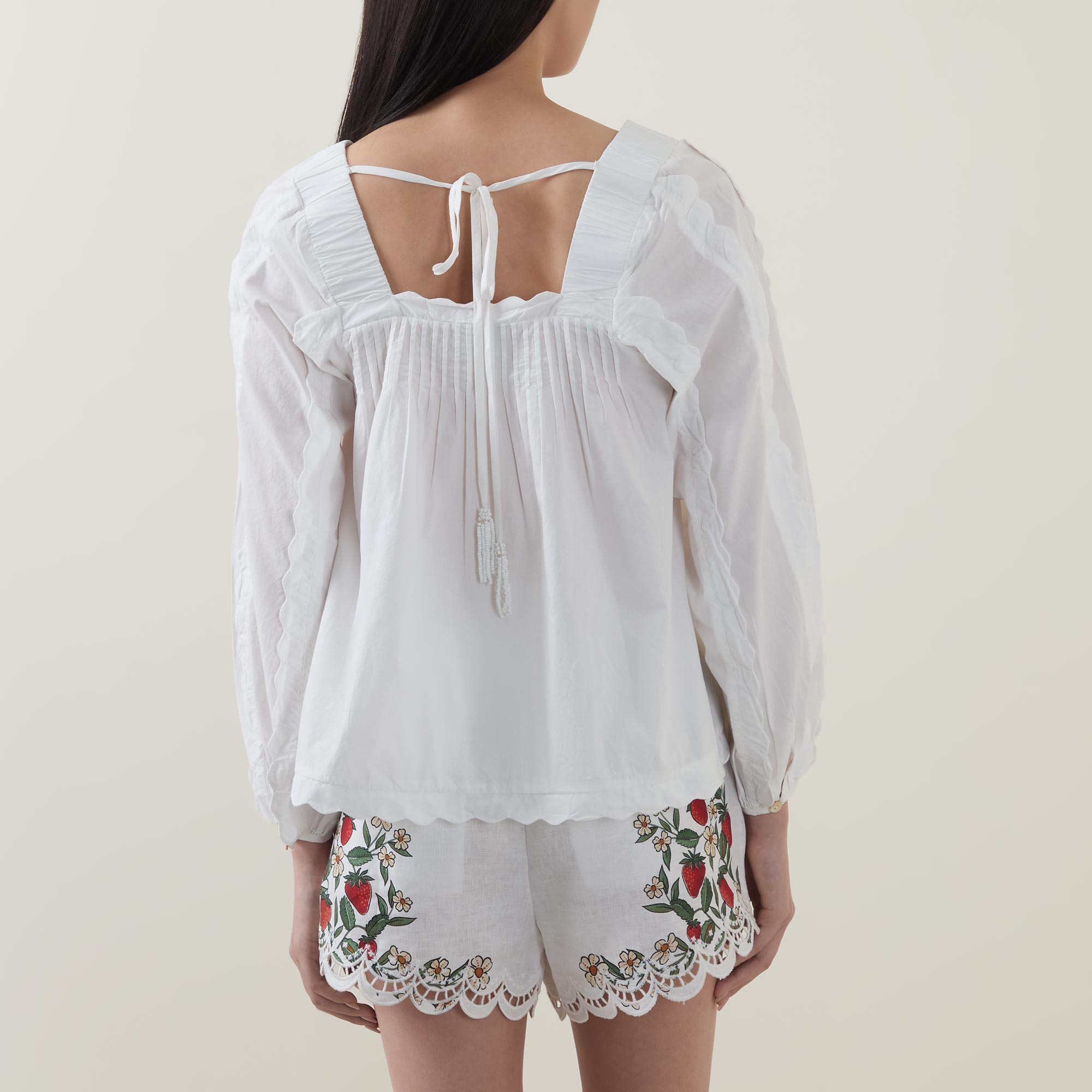 - Long sleeves, buttoned cuffs, square neckline, scalloped trims, square back, rear tie fastening, pleated detailing, flared silhouette