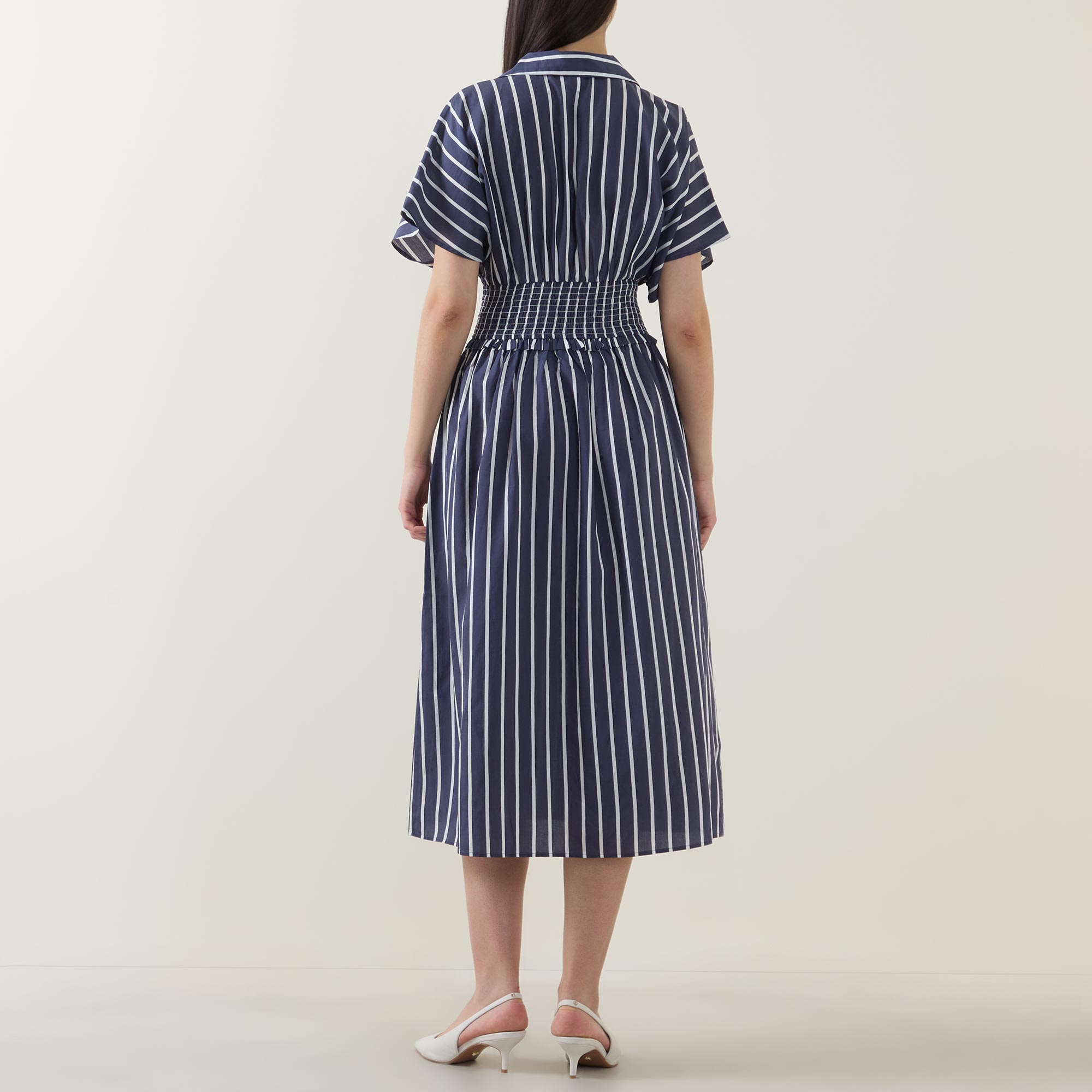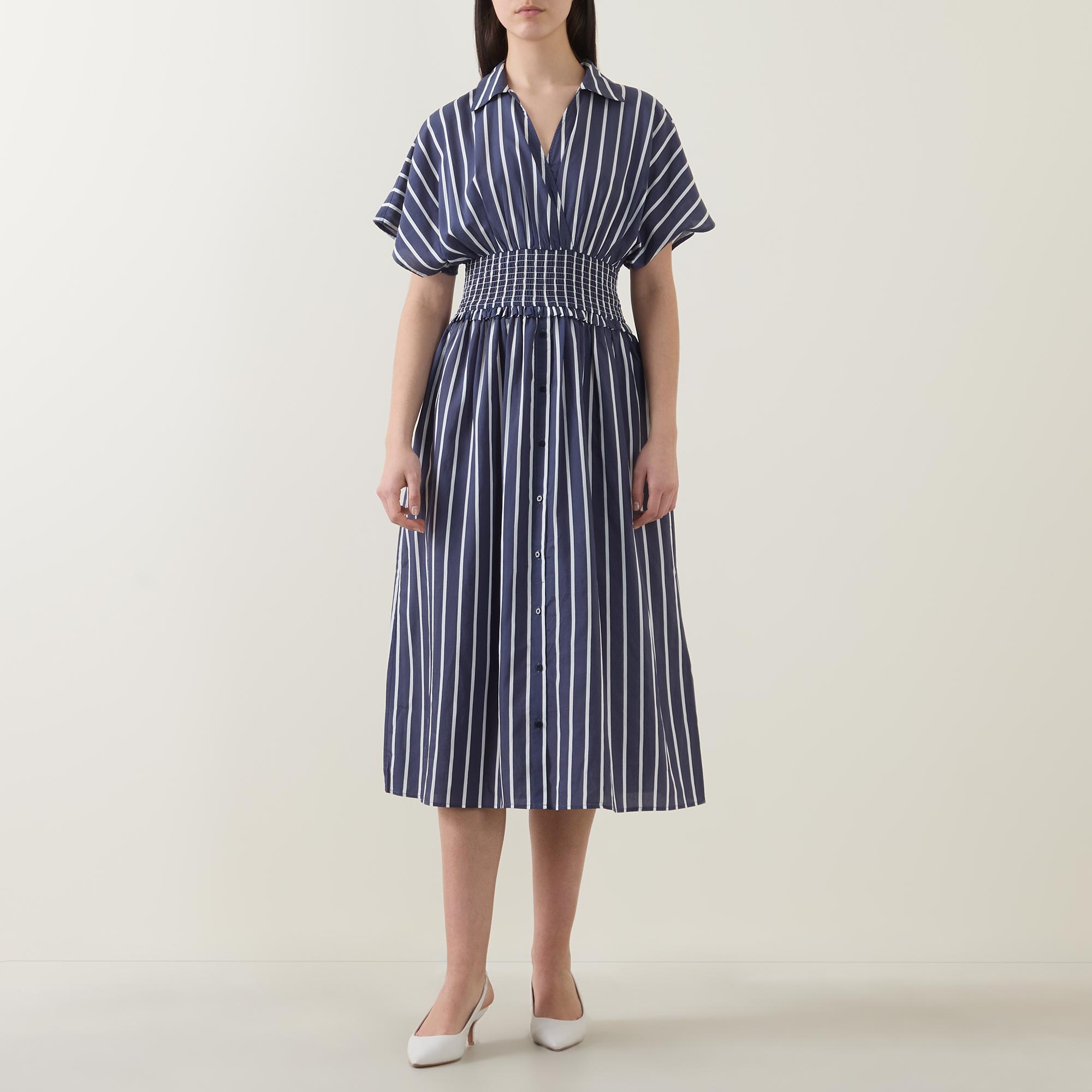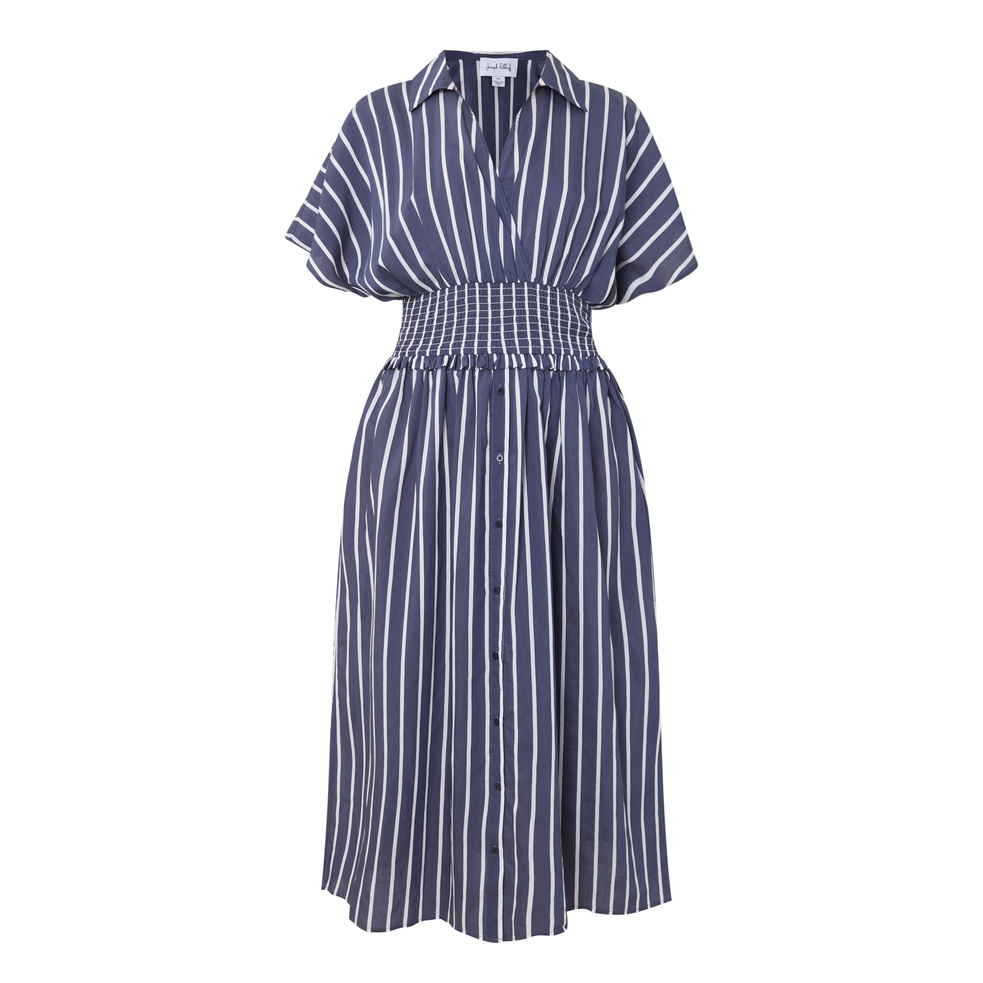 - Stripe print, midi length, wrap neck, shirt collar, short dolman sleeves, smocked waist, fit and flare shape, button details