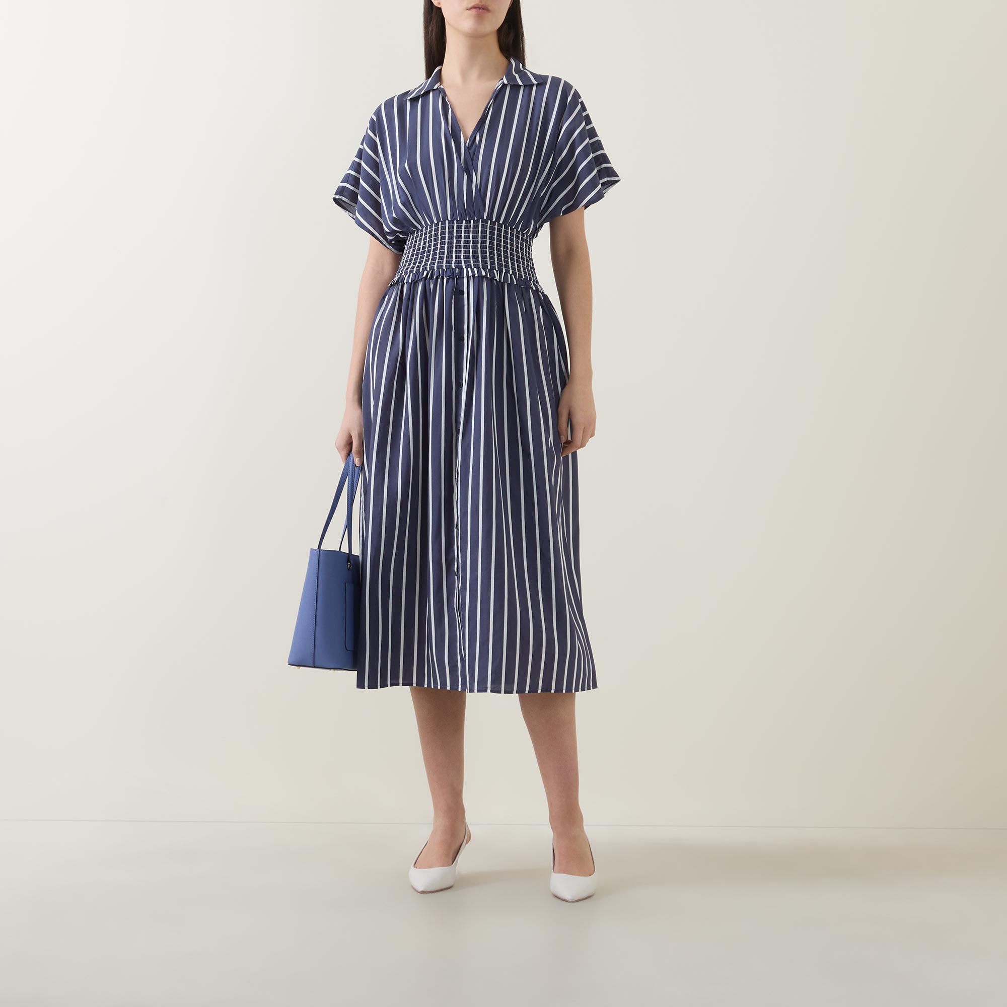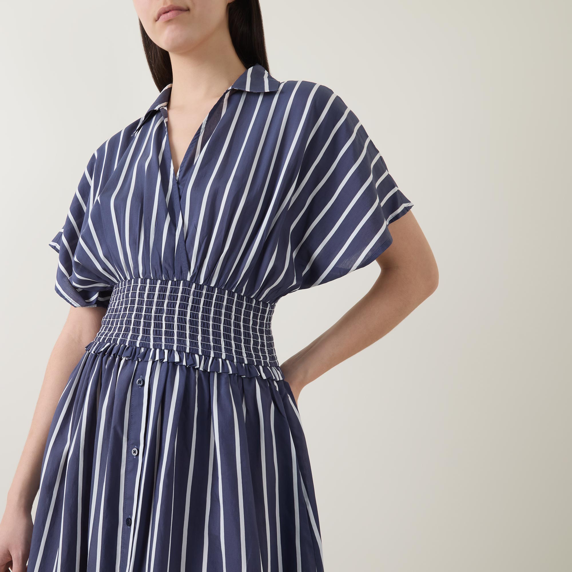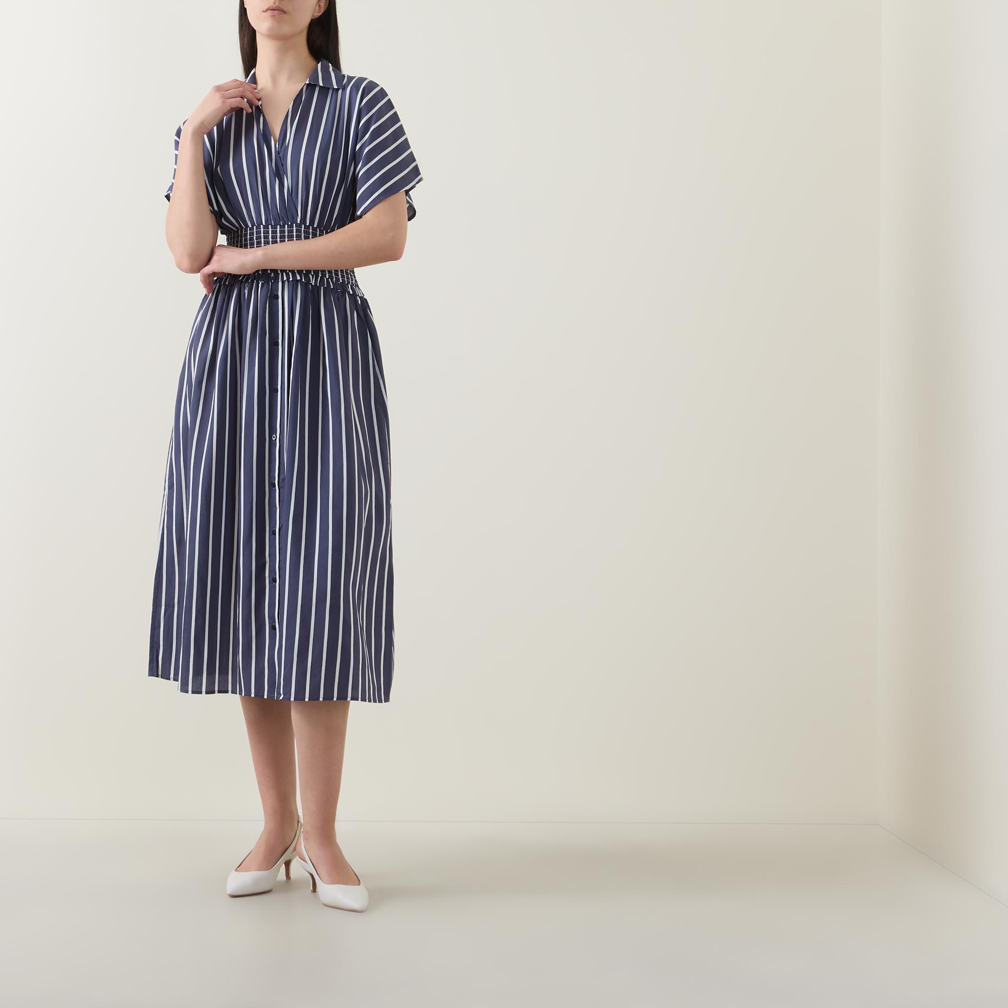 - Stripe print, midi length, wrap neck, shirt collar, short dolman sleeves, smocked waist, fit and flare shape, button details