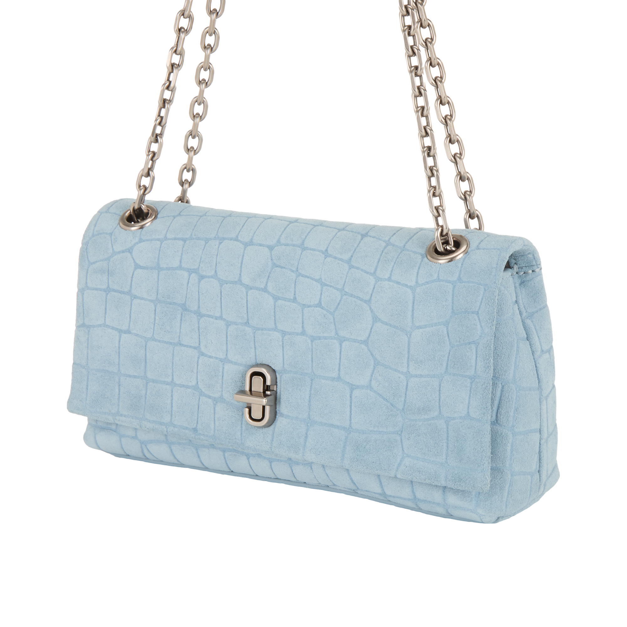 - Top carry handle, chain strap, turn-lock closure, croc-embossed finish, silver-tone hardware, logo details