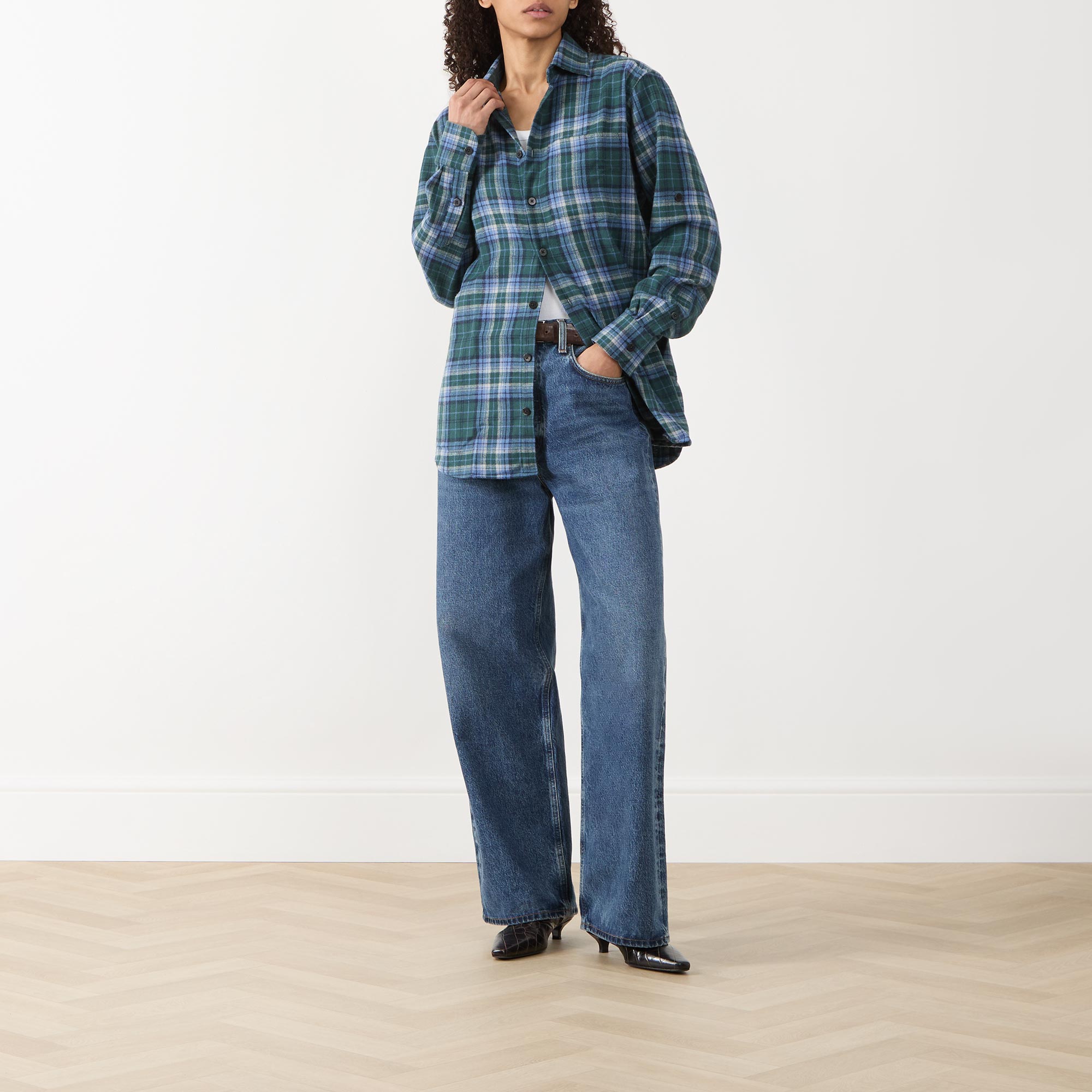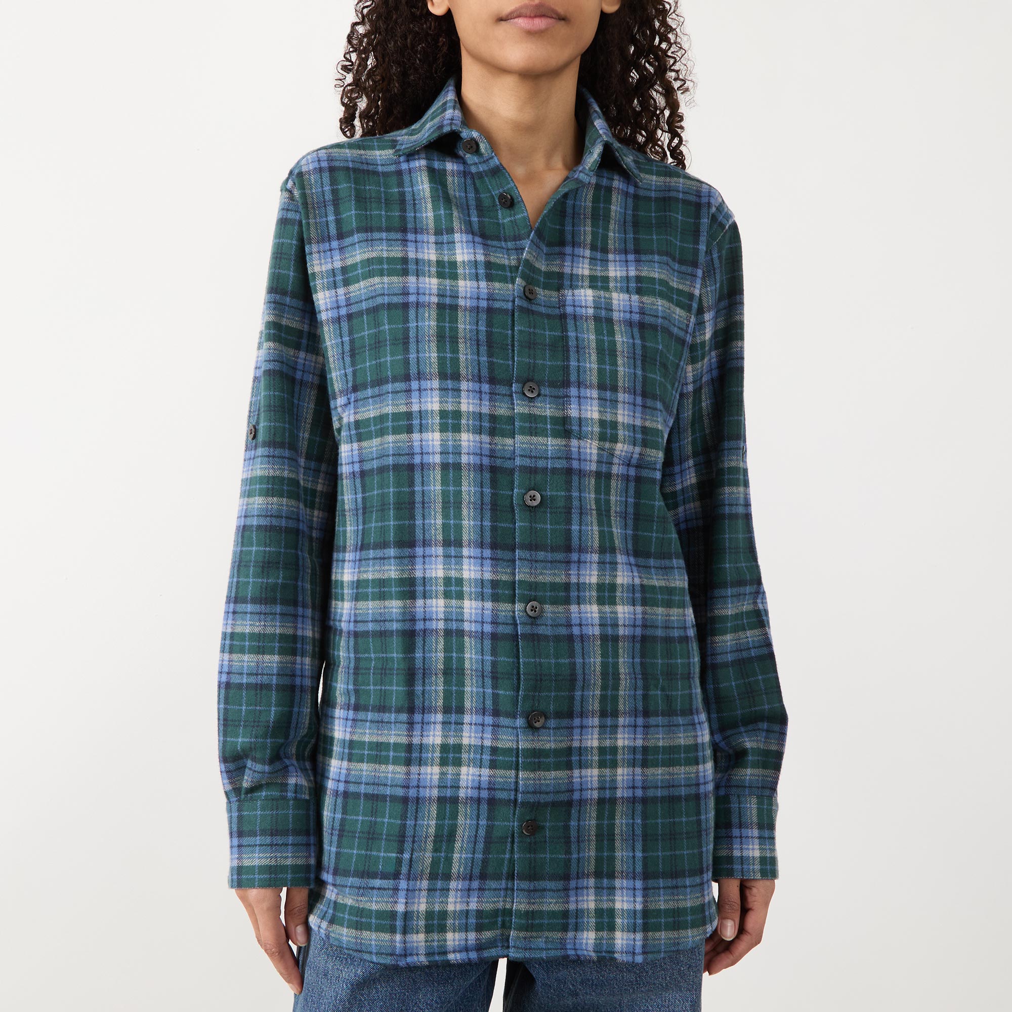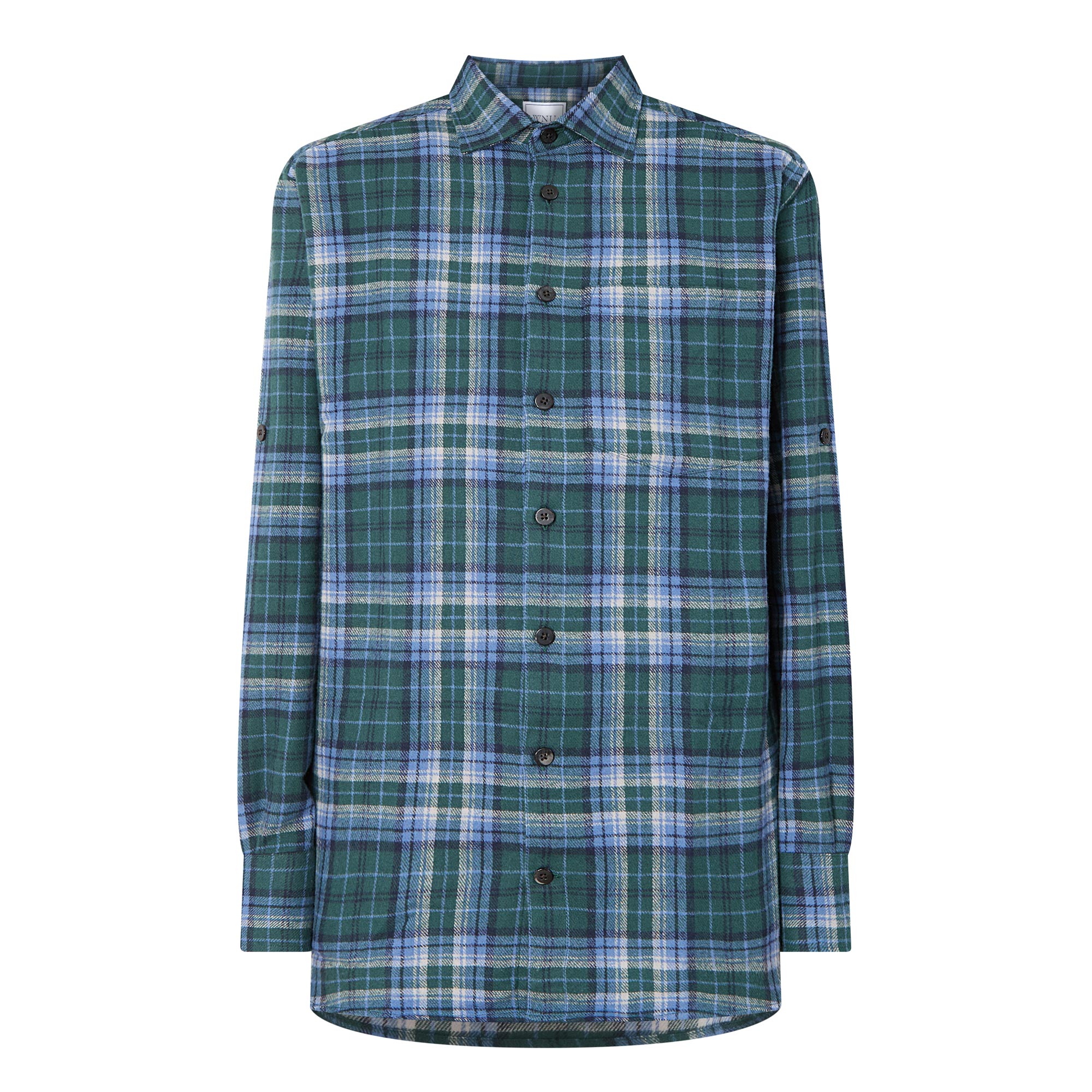 • Point collar, dropped shoulders, long sleeves, buttoned cuffs, front button fastening, one chest patch pocket, curved hem, rear locker loop, check print, flannel finish