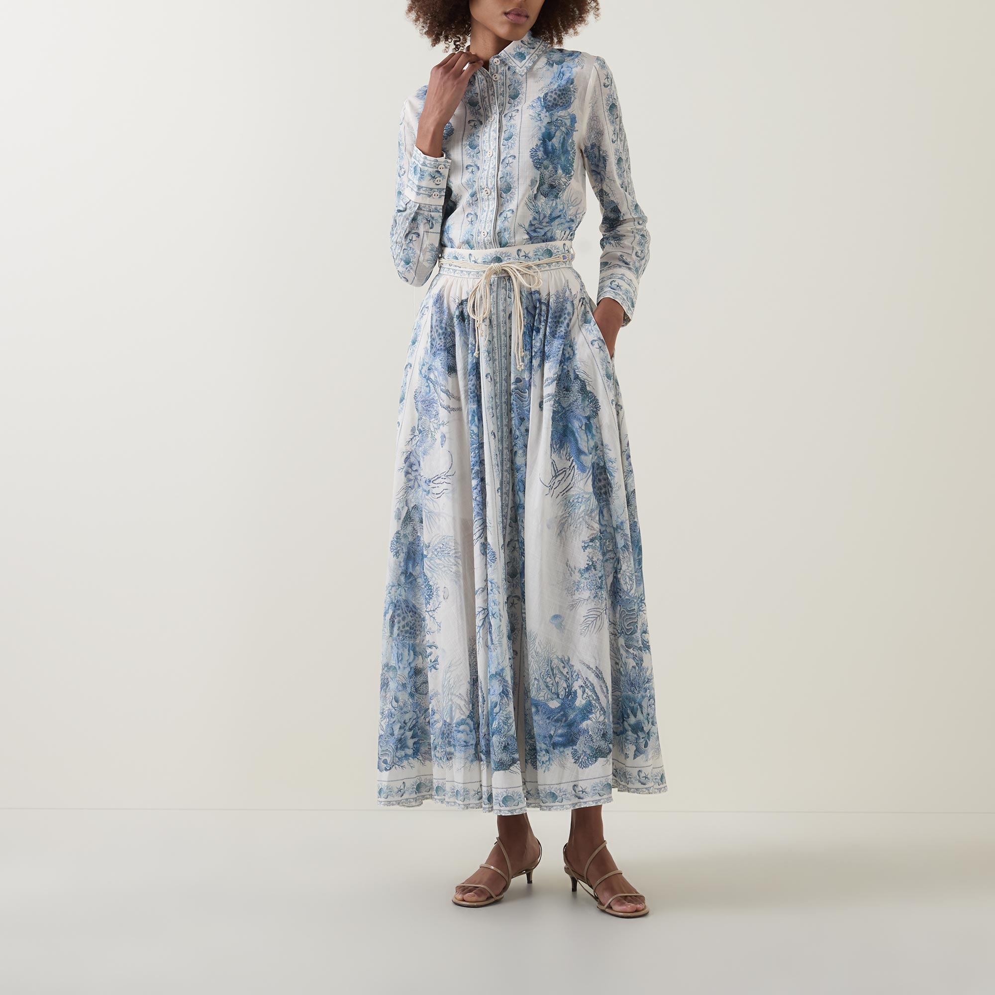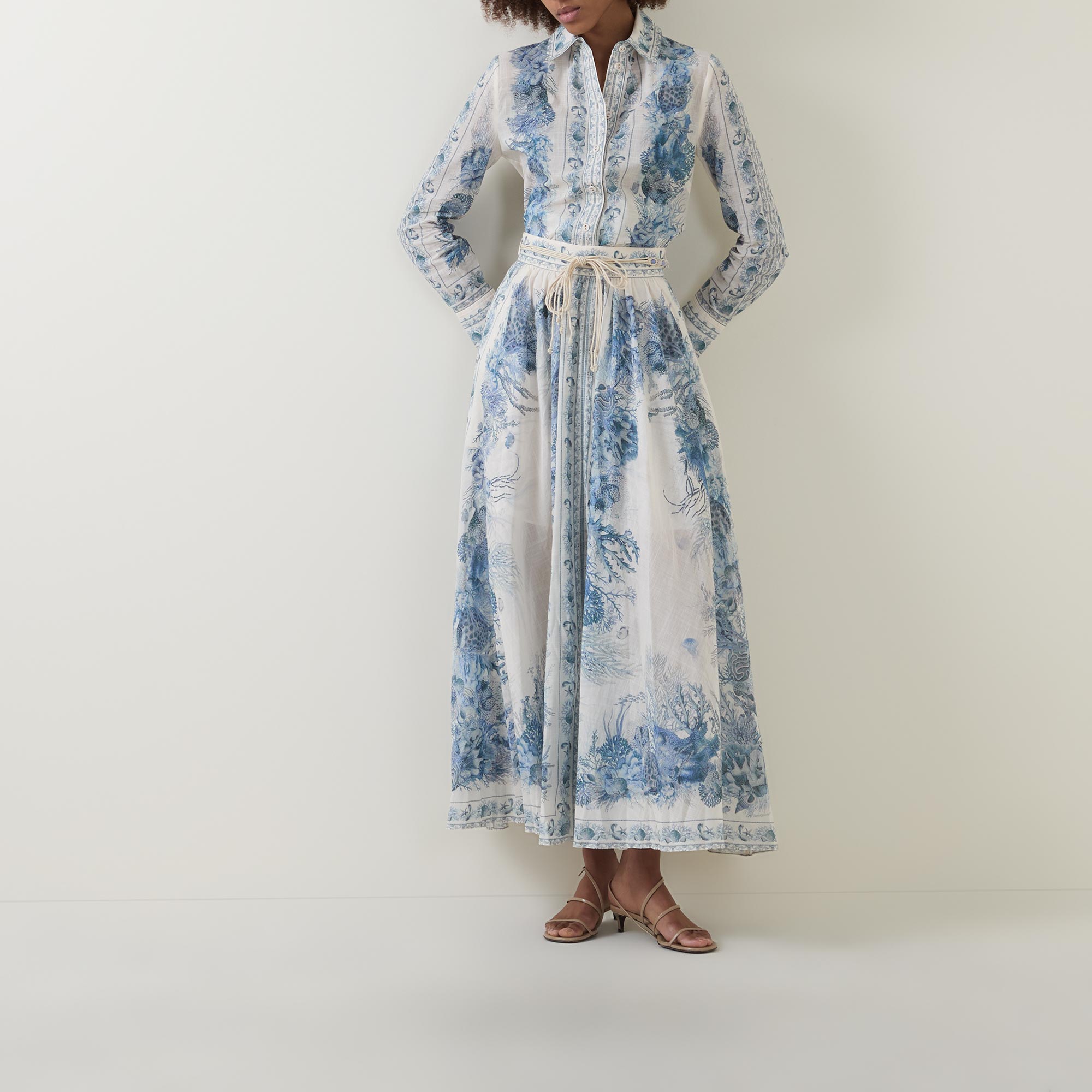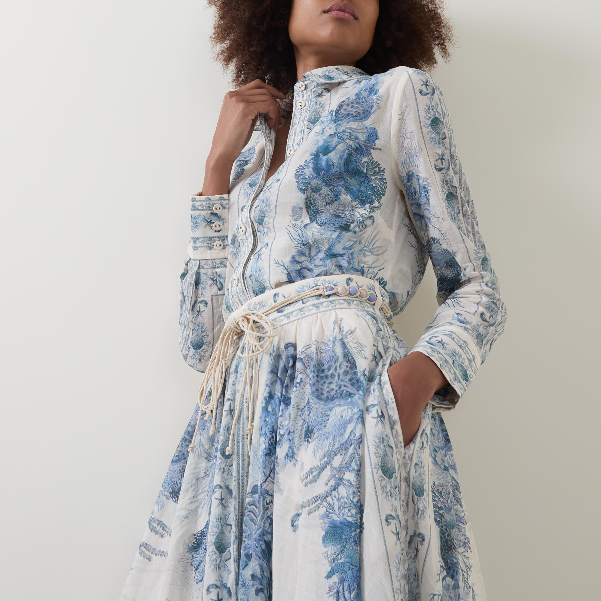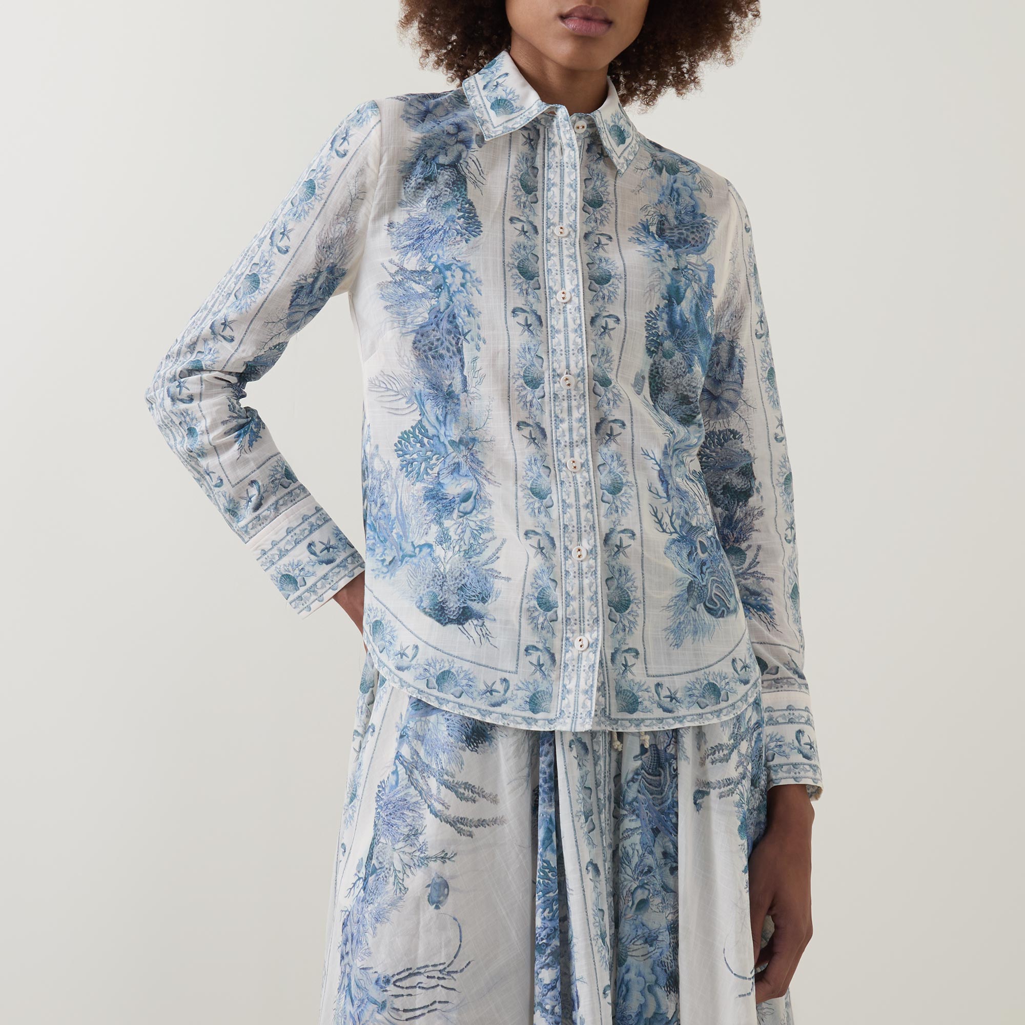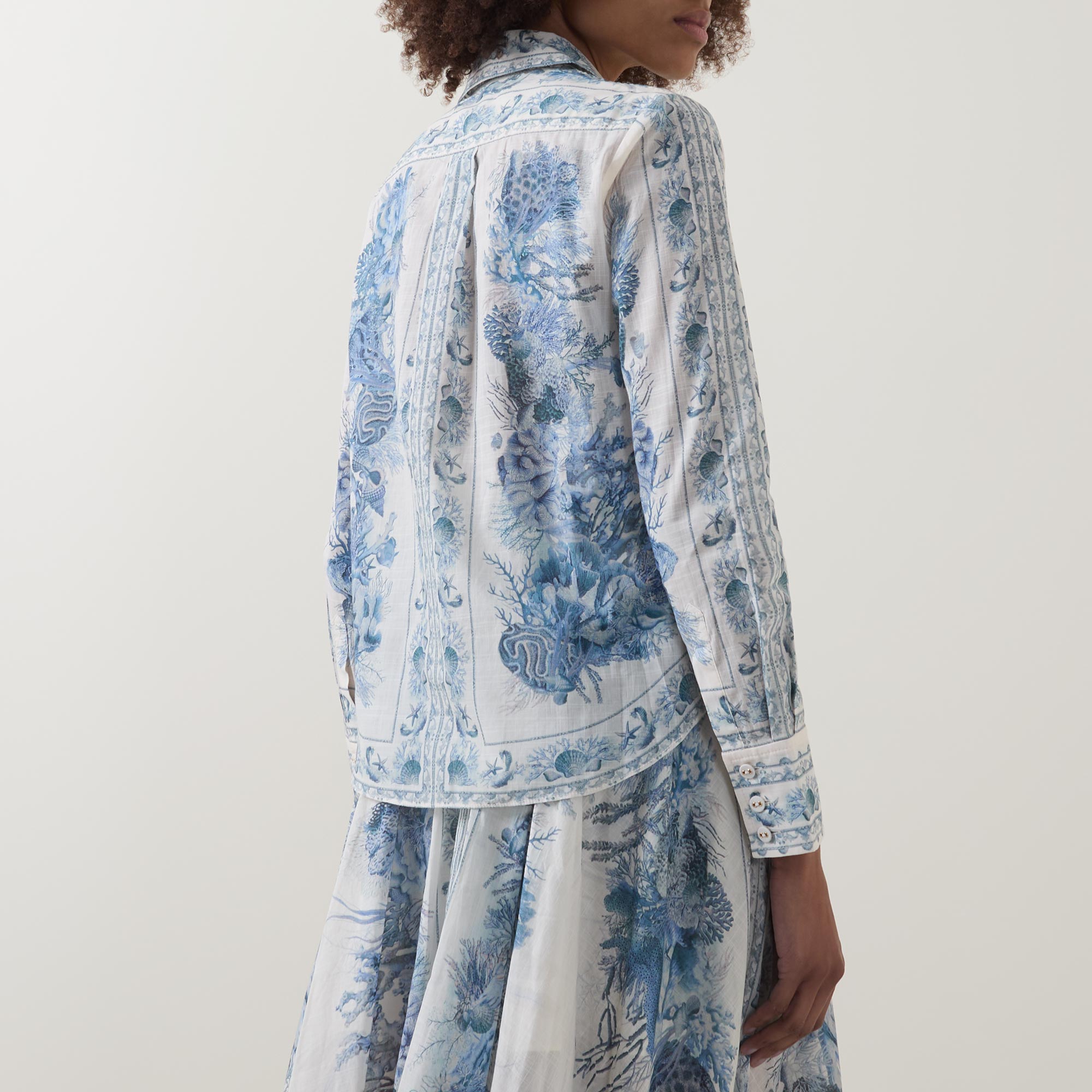 Botanical prints feature across the SS26 collection from Zimmermann, seen adorning the Wanderlust shirt. Cut to a slim fit, it features a classic collar and long cuffed sleeves, finished with a button fastening placket to the front.