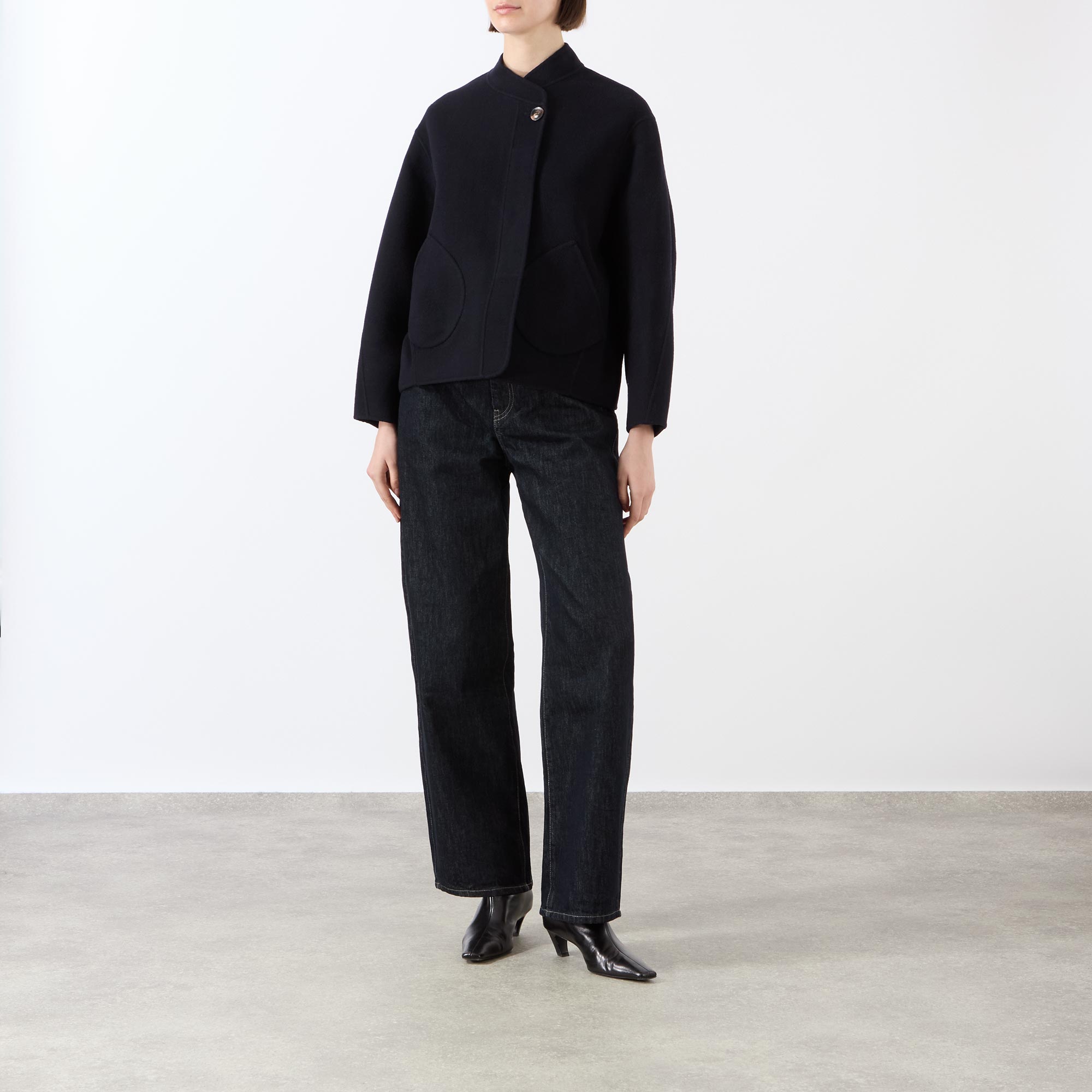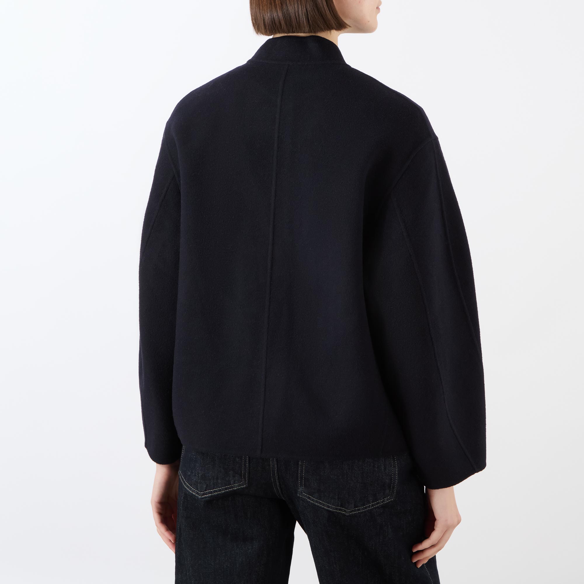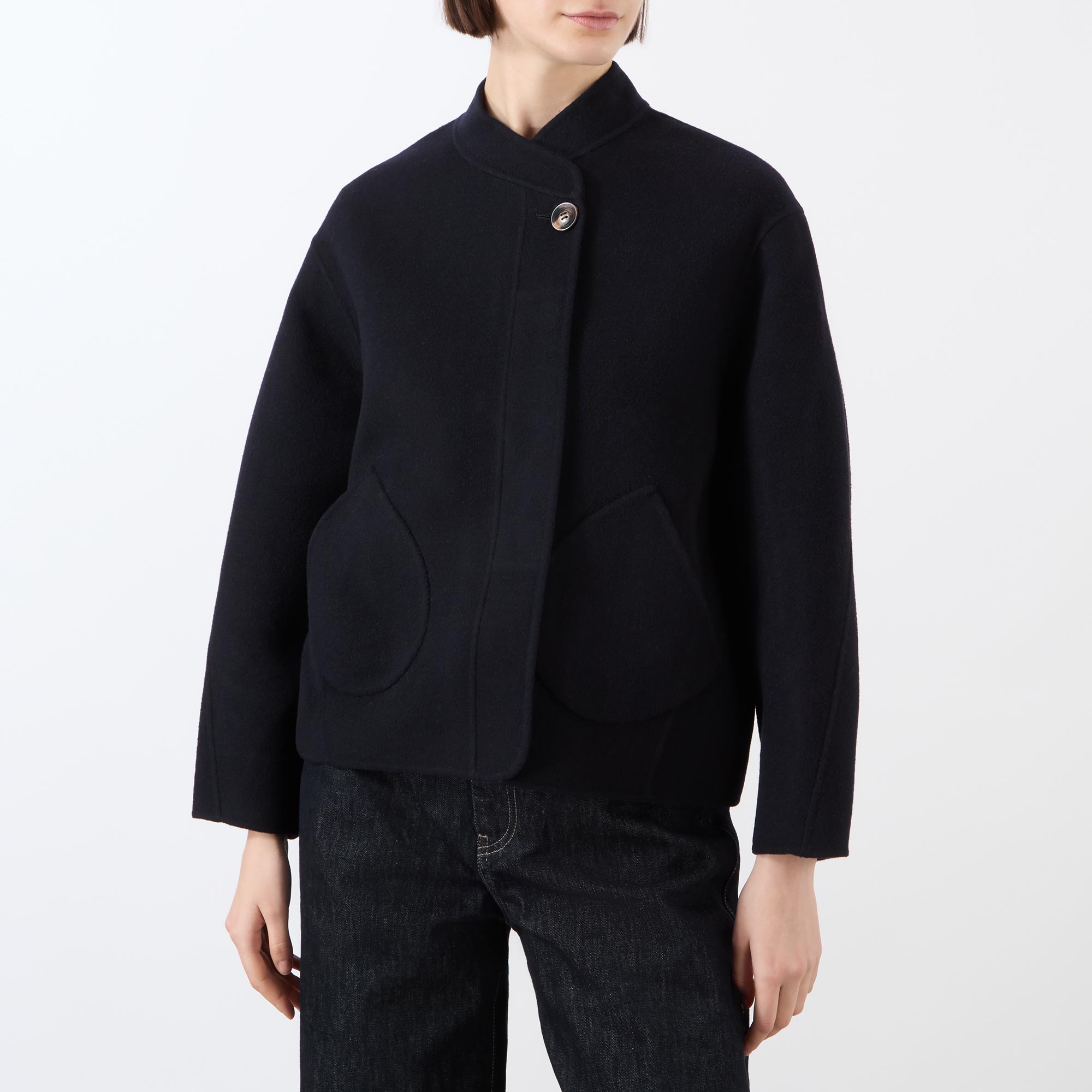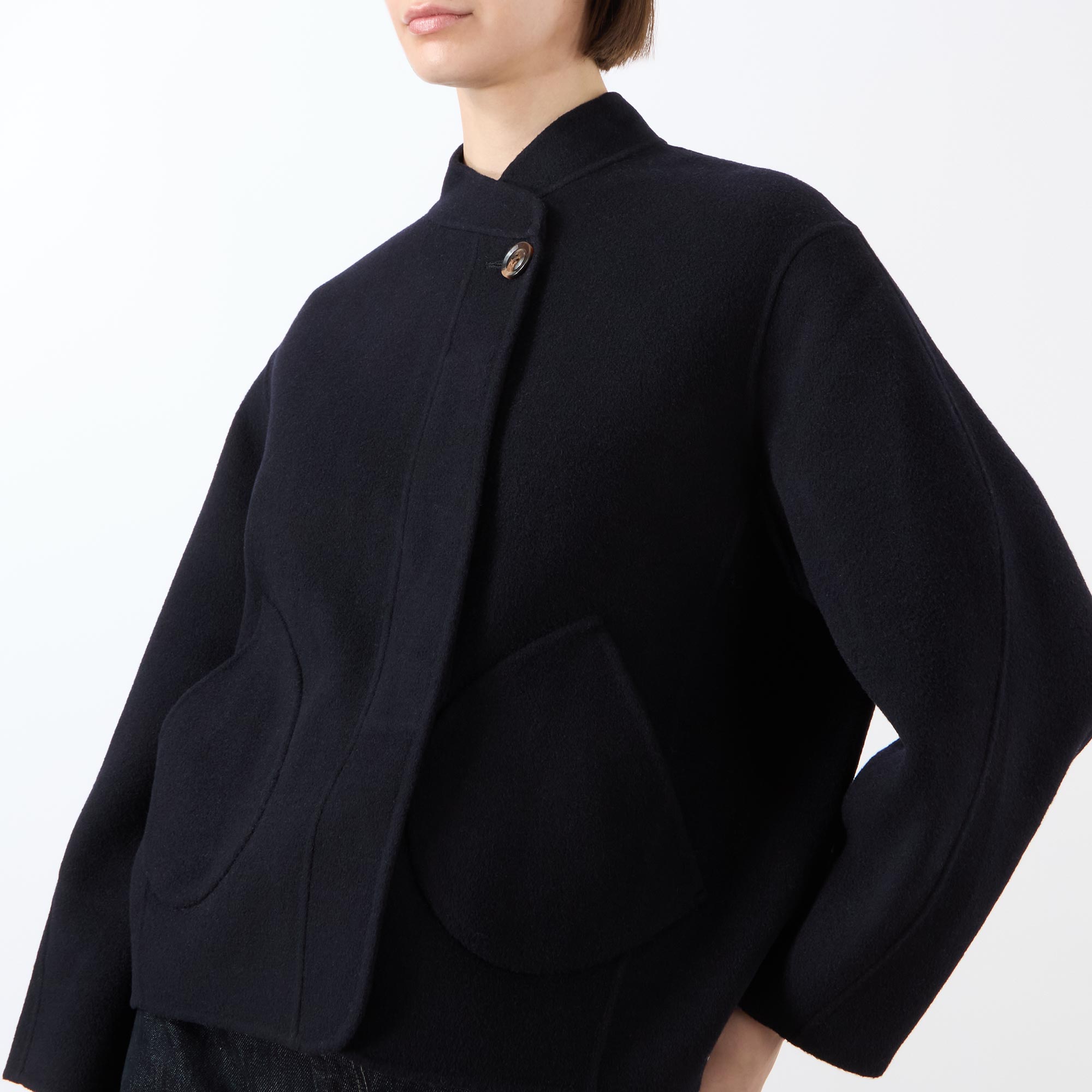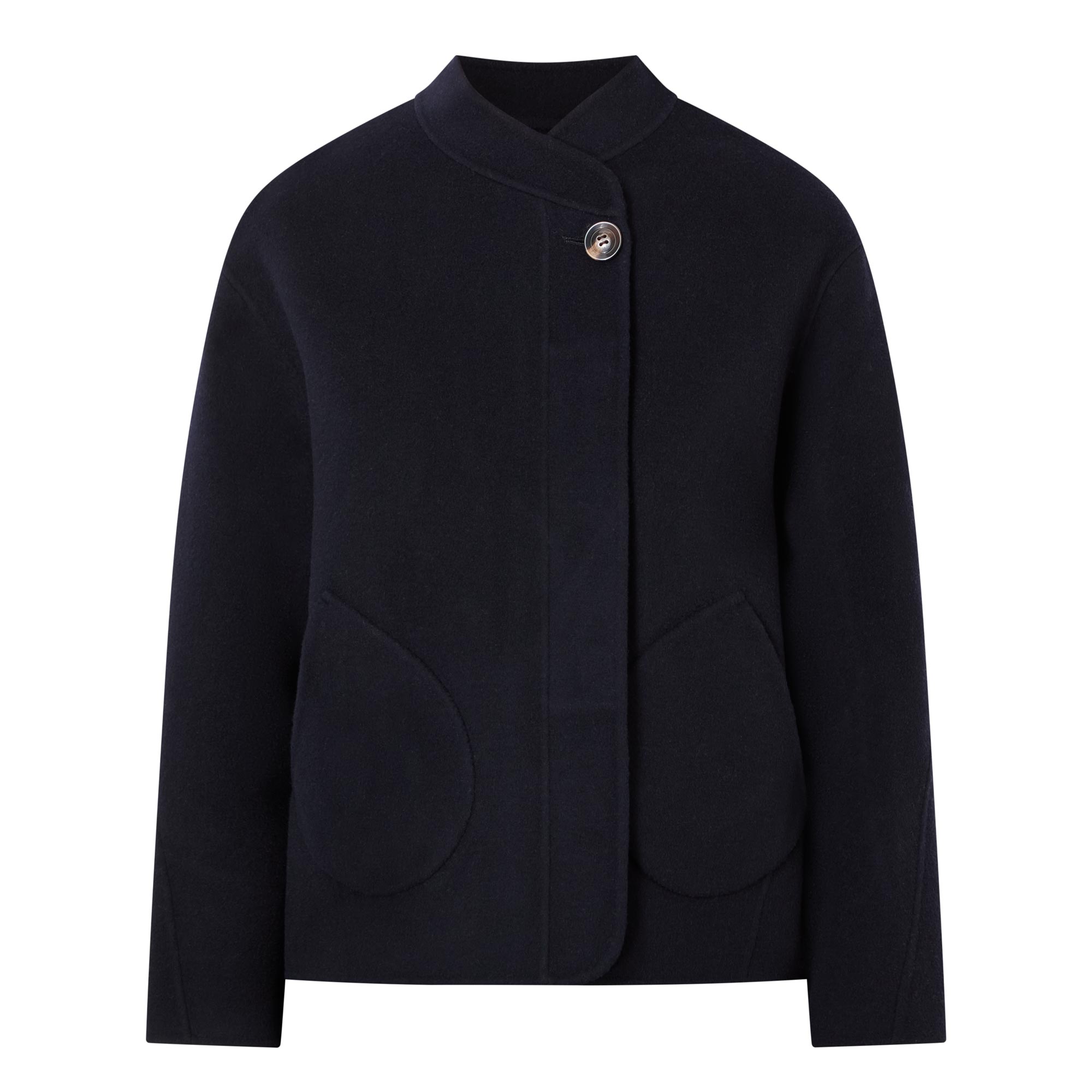 - Asymmetrical collar, long rounded sleeves, semi-concealed button fastening, two front patch pockets, straight hem, double-faced design, soft finish