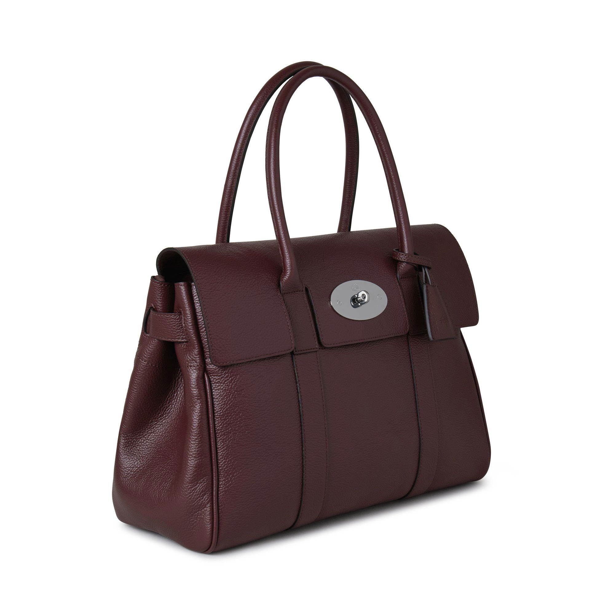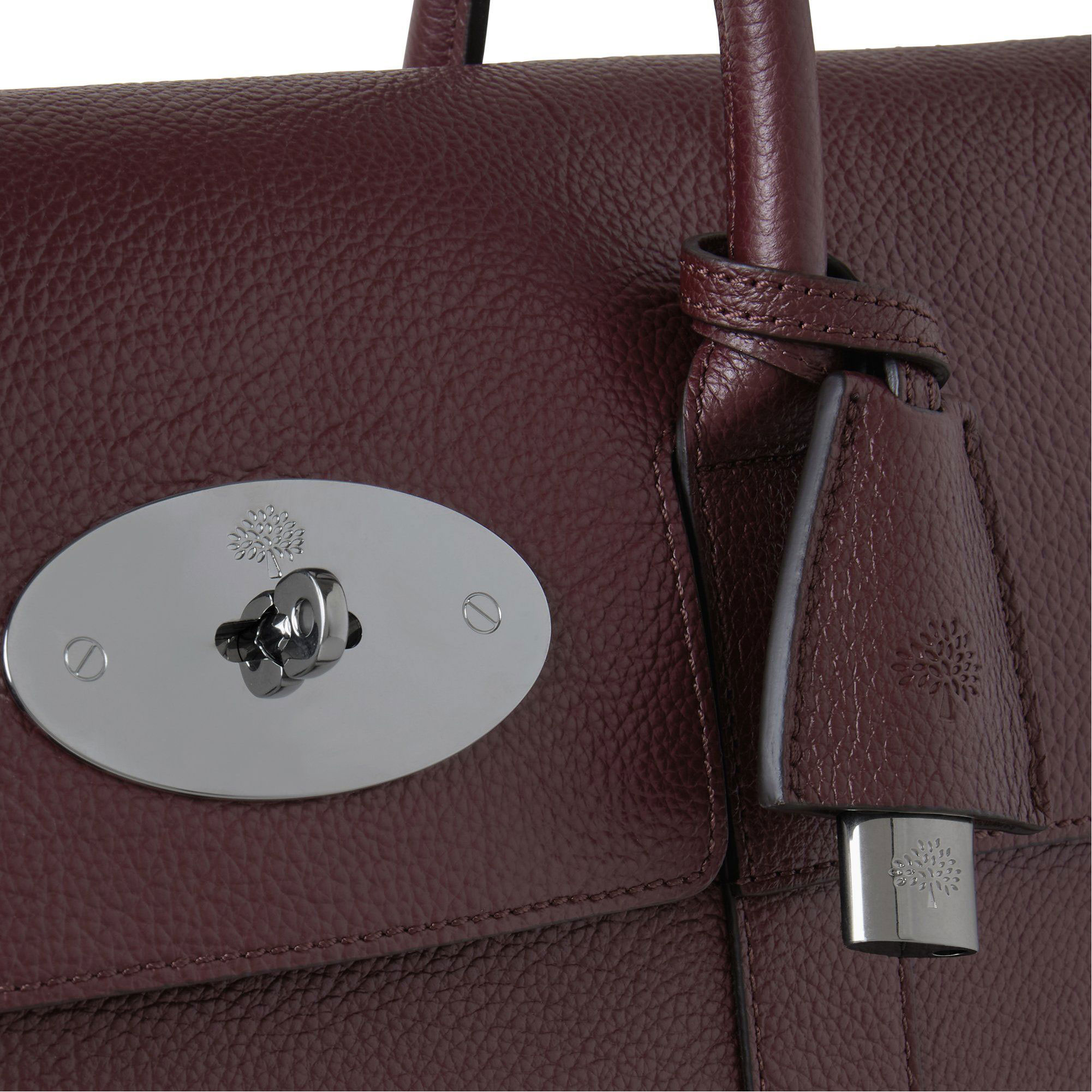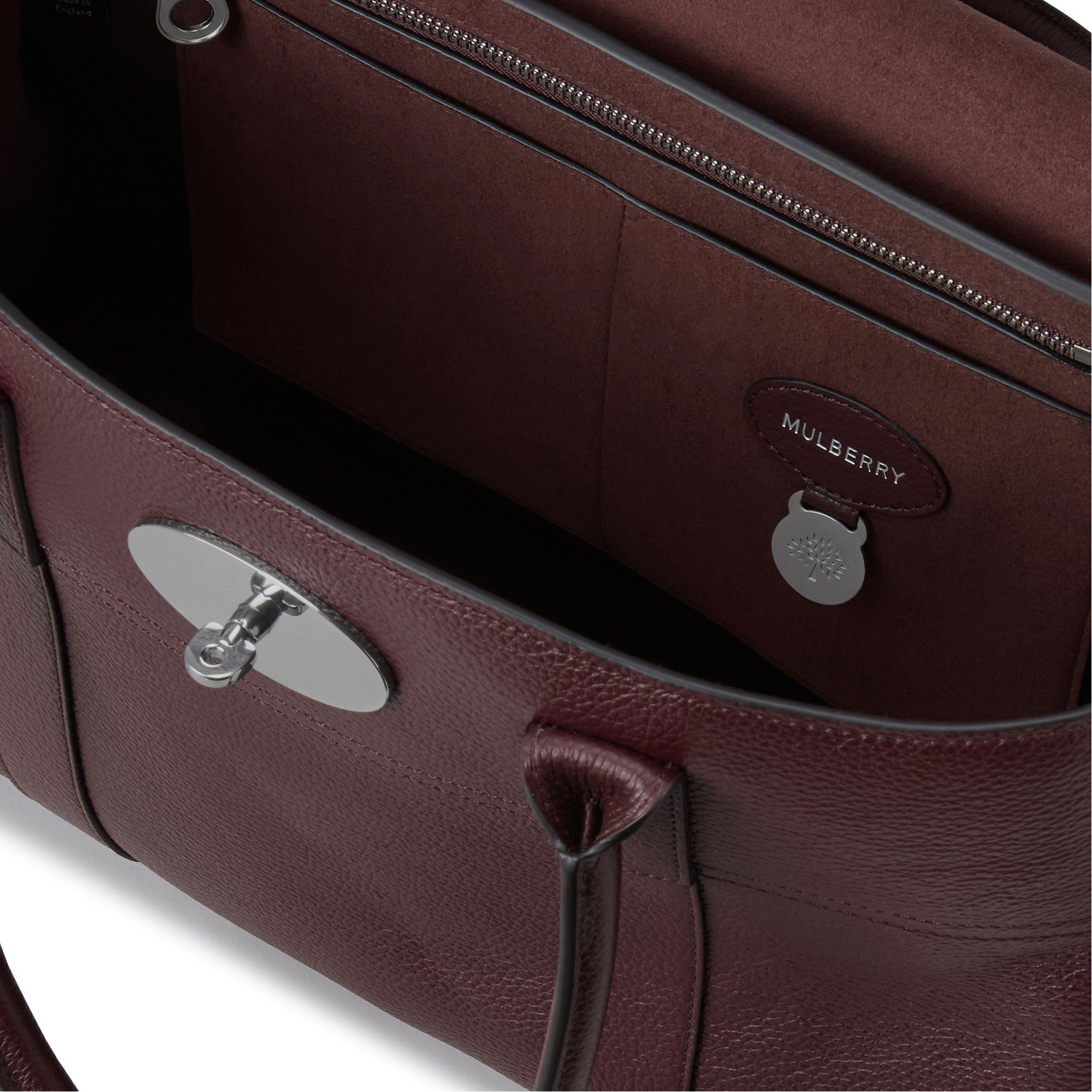 - Postman's lock closure, two top handles, one main compartment, one internal zip pocket, two internal slip pockets, hanging leather fob with hidden padlock, four metal feet on base, silver hardware, lined