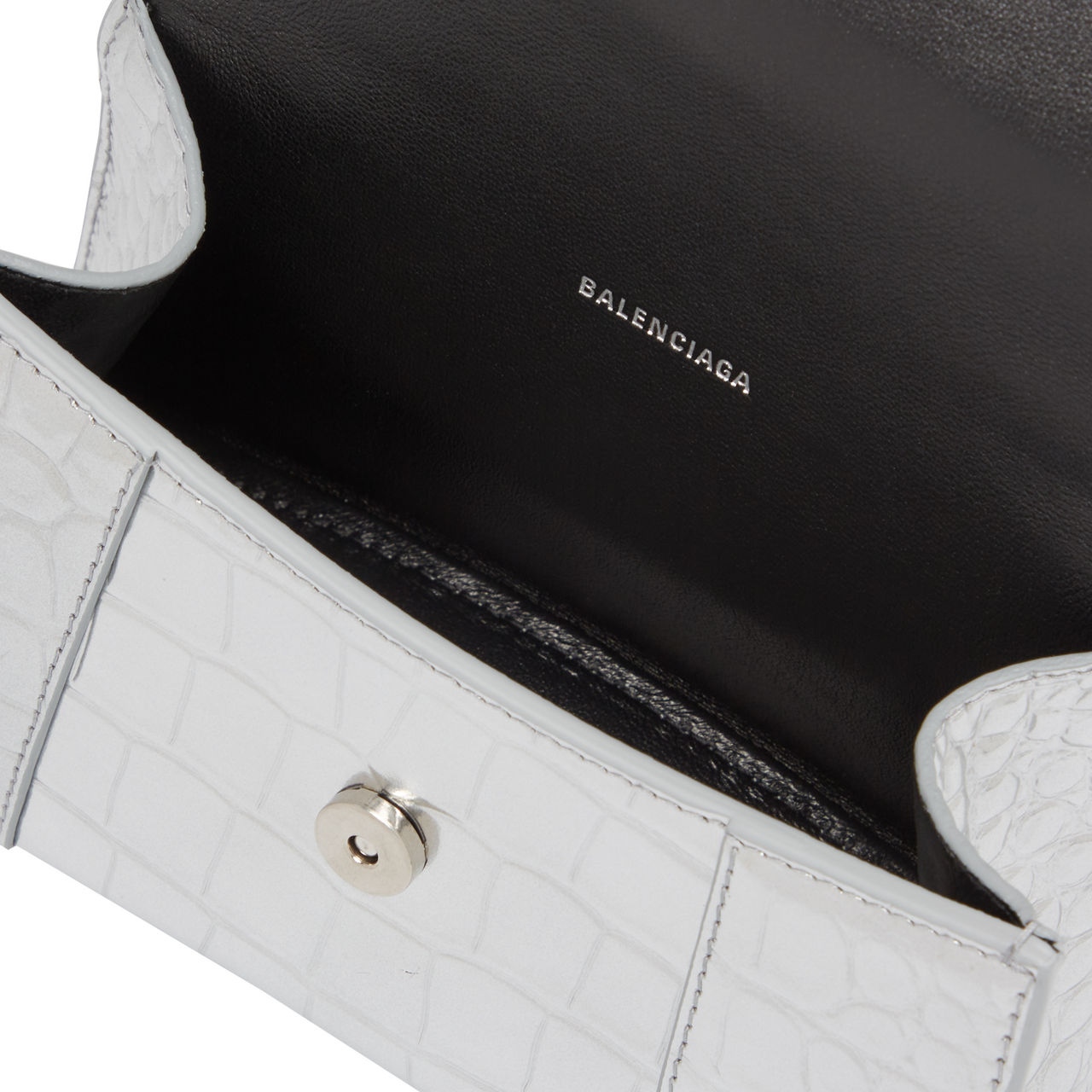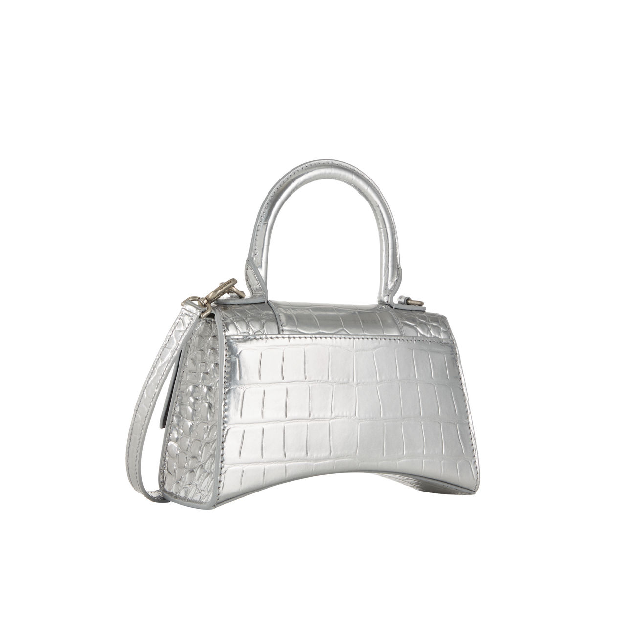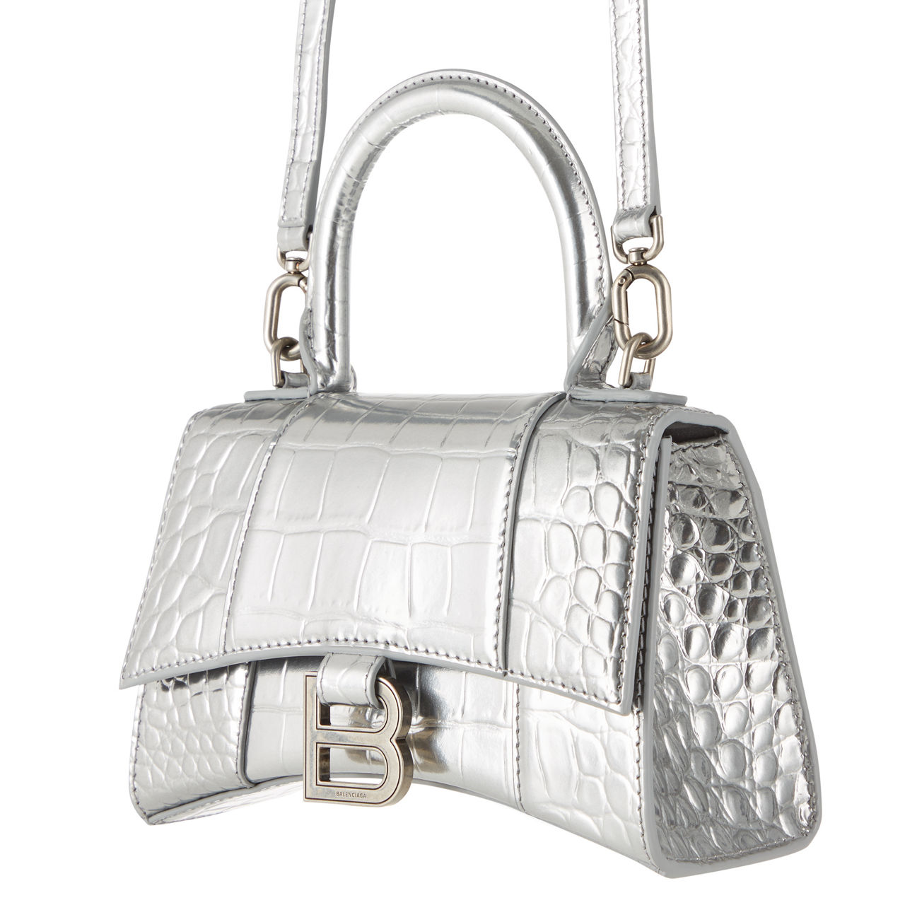 The curved base of this Balenciaga bag is inspired by the label's iconic hourglass silhouette. Crafted from crocodile-embossed leather, it's fitted with a metallic B logo hanging from the flap closure and is carried by the top handle or crossbody using the detachable shoulder strap.