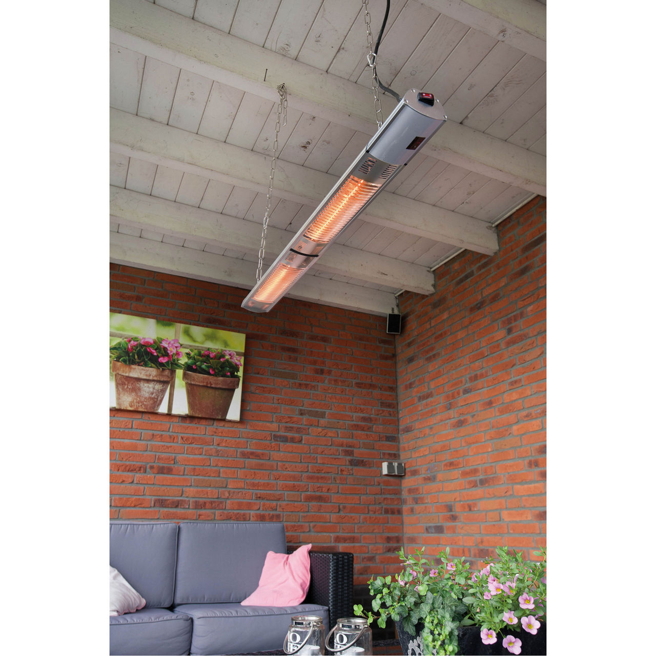 You will keep your terrace, garden or veranda warm for seasons, because the lifespan is 8,000 hours. The patio heater emits soft red light and heats up immediately after the heater is switched on. The short heating wave heats up your body. The wind does not affect the heat. With the included remote control you regulate the heat supply from your garden chair and you can enjoy the pleasant warmth the whole evening.