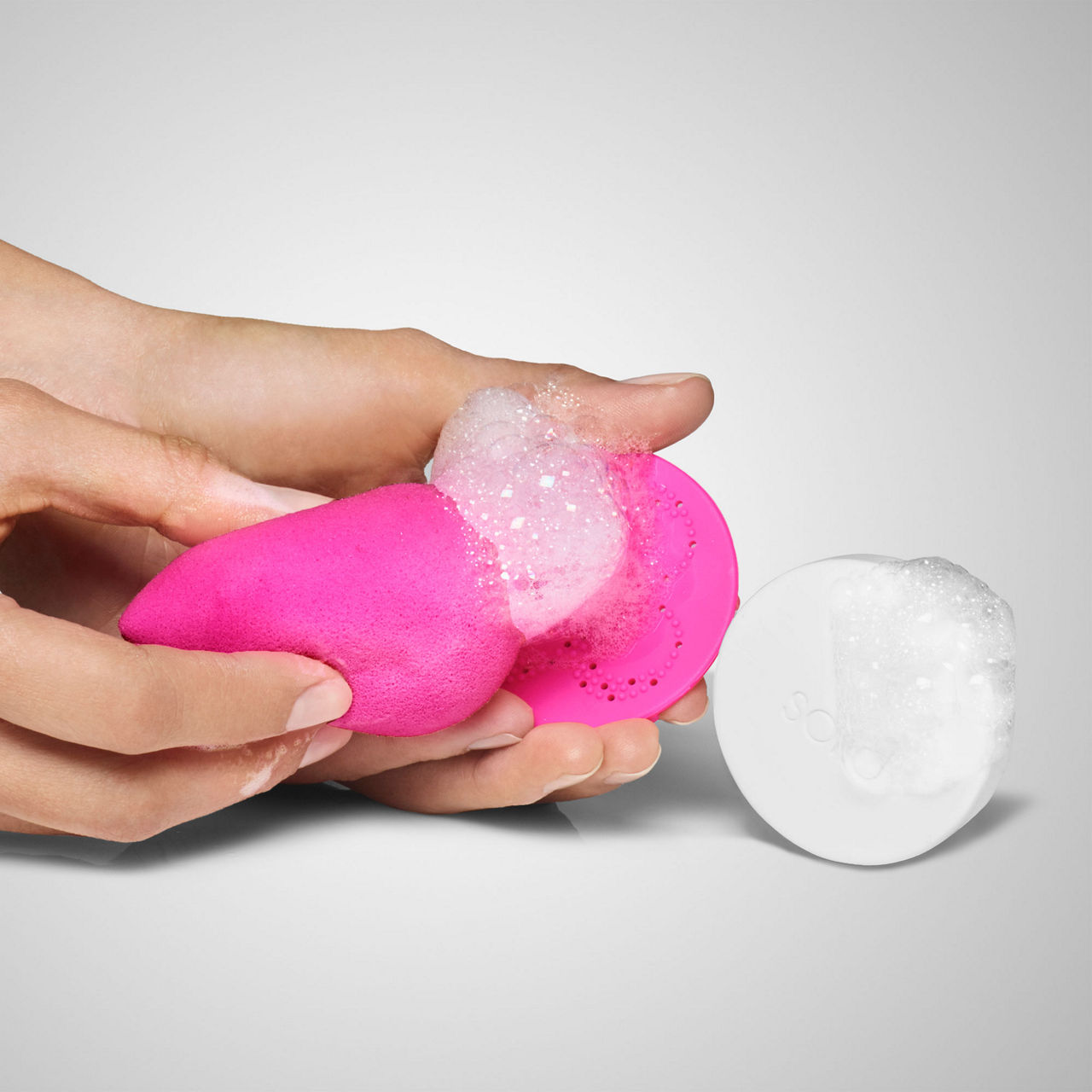 butterfly facing out. Bounce the blender against the pink pad, drawing the soap in and easing the make-up out. And of course, you can use the pink pad to cleanse makeup brushes as well.