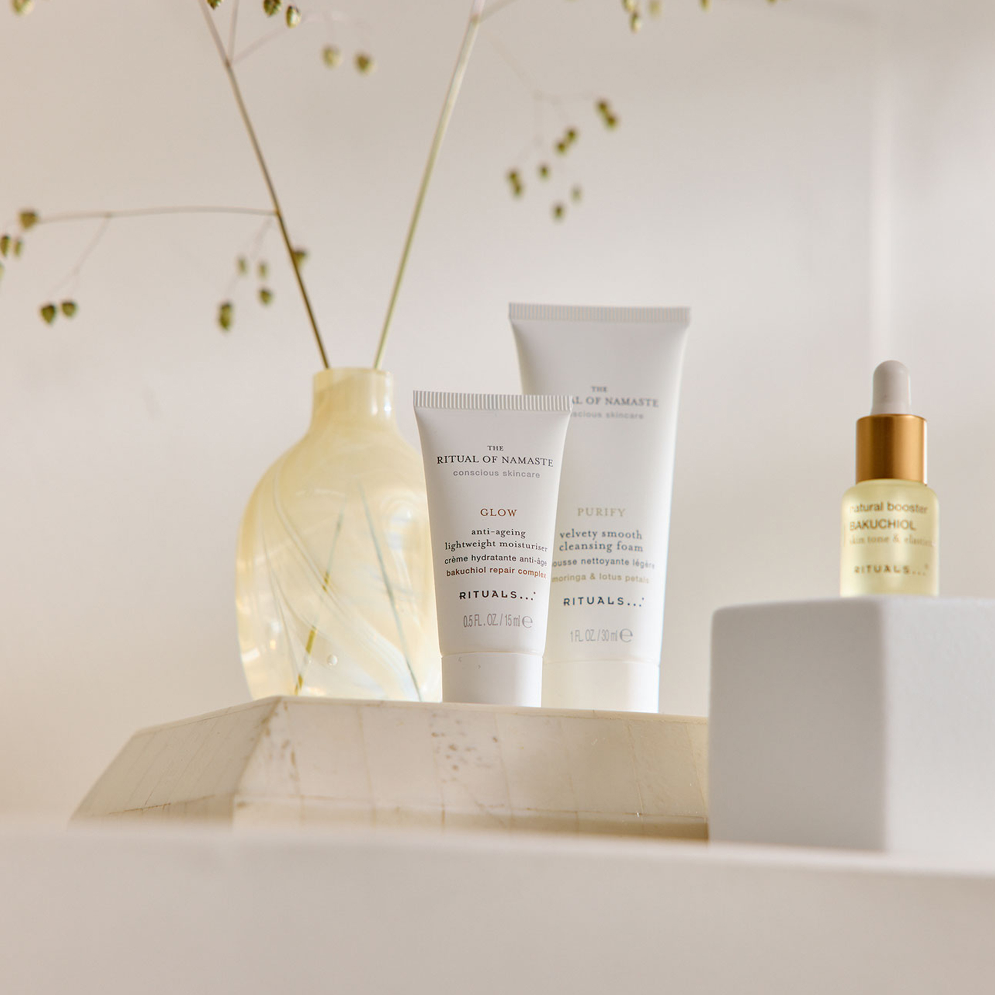 - The Ritual of Namaste Velvety Smooth Cleansing Foam 30ml: Aqua/Water, Sodium Cocoyl Glycinate, Coco-Glucoside, Glycerin, Citric Acid, Sodium Lauroyl Glutamate, Moringa Oleifera Seed Extract, Nelumbo Nucifera (Lotus) Flower Extract, Hydrogenated Palm Glycerides Citrate, Glyceryl Oleate, Saccharide Isomerate, Glyceryl Caprylate, Mica, Propylene Glycol, Maltodextrin, Ascorbyl Palmitate, Lecithin, Tocopherol, Dehydroxanthan Gum, Xanthan Gum, Sodium Hydroxide, Sodium Citrate, Tin Oxide, Potassium Sorbate, Sodium Benzoate, Limonene, Linalool, Citral, Parfum/Fragrance, CI 77891/Titanium Dioxide. Namaste Anti-Ageing Lightweight Moisturiser 15ml: Aqua/Water, Di-C12-13 Alkyl Malate, Pentylene Glycol, Prunus Amygdalus Dulcis (Sweet Almond) Oil, Lactococcus Ferment Lysate, Butyrospermum Parkii (Shea) Butter, Dicaprylyl Carbonate, Cetearyl Alcohol, Fructooligosaccharides, Microcrystalline Cellulose, Distarch Phosphate, Bakuchiol, Beta Vulgaris (Beet) Root Extract, Magnolia Officinalis Bark Extract, Ectoin, Helianthus Annuus Seed Wax, Jojoba Esters, Polyglycerin-3, Sodium Stearoyl Glutamate, Helianthus Annuus (Sunflower) Seed Oil, Glyceryl Stearate, Glyceryl Caprylate, Xanthan Gum, Cellulose Gum, Potassium Lactate, Lactic Acid, Tetrasodium Glutamate Diacetate, Tocopherol, Sodium Chloride, Citric Acid, Sodium Hydroxide, Sodium Benzoate, Tetramethyl Acetyloctahydronaphthalenes, Linalool, Citrus Aurantium (Orange) Peel Oil, Limonene, Citronellol, Geraniol, Terpineol, Pinene, Parfum/Fragrance. Namaste Bakuchiol Natural Booster 6.5ml GS: Isoamyl Laurate, C15-19 Alkane, Macadamia Integrifolia/Tetraphylla Seed Oil, Cocos Nucifera (Coconut) Oil, Cocoglycerides, Coco-Caprylate, Simmondsia Chinensis (Jojoba) Seed Oil, Caprylic/Capric Triglyceride, Camellia Oleifera Seed Oil, Bakuchiol, Tocopherol, Helianthus Annuus (Sunflower) Seed Oil, Citronellol, Benzyl Salicylate, Limonene, Geraniol, Eugenol, Linalool, Parfum/Fragrance.