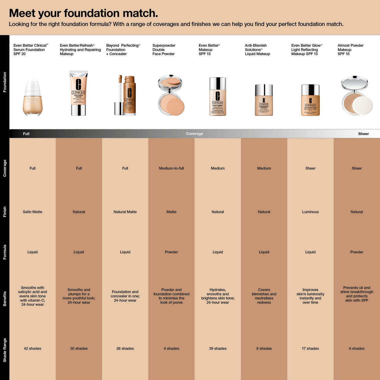 Combines the skin-perfecting coverage of a foundation with the power of a serum. 92% say bare skin looks more radiant* What It Does: • This weightless, liquid foundation with 24-hour wear helps improve the look of skin. • Delivers beautifully even coverage and a satin matte finish. • Built with ingredients like Clinique’s dark spot-fighting molecule UP302, three types of vitamin C, salicylic acid, and hyaluronic acid. • SPF 20 physical sunscreens help protect skin from the look of discolouration. • Leaves bare skin looking even better—more even and smoother. Proven Skincare Results in a Foundation: • 86% skincare formula.** • 91% see reduced imperfections on bare skin—dark spots, discolouration, age spots, and blemish marks.* • 90% say bare skin looks smoother and more even-toned.*