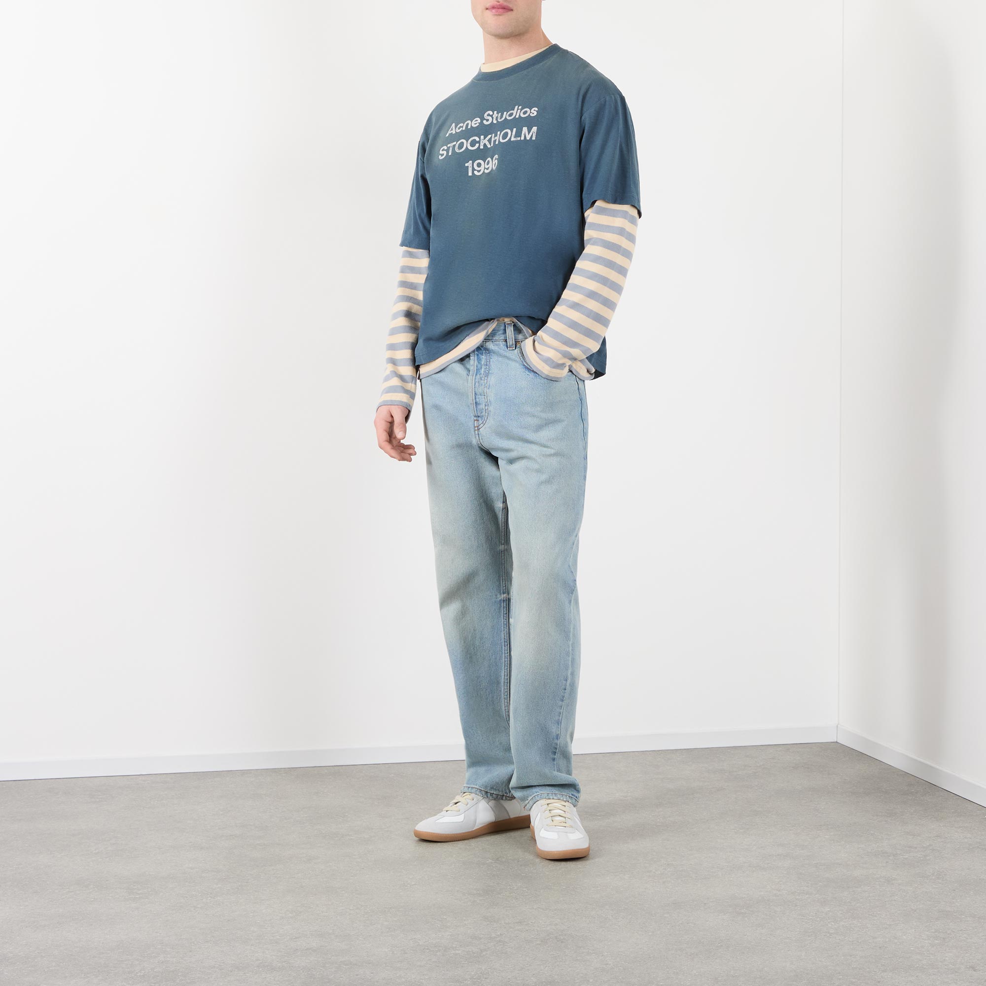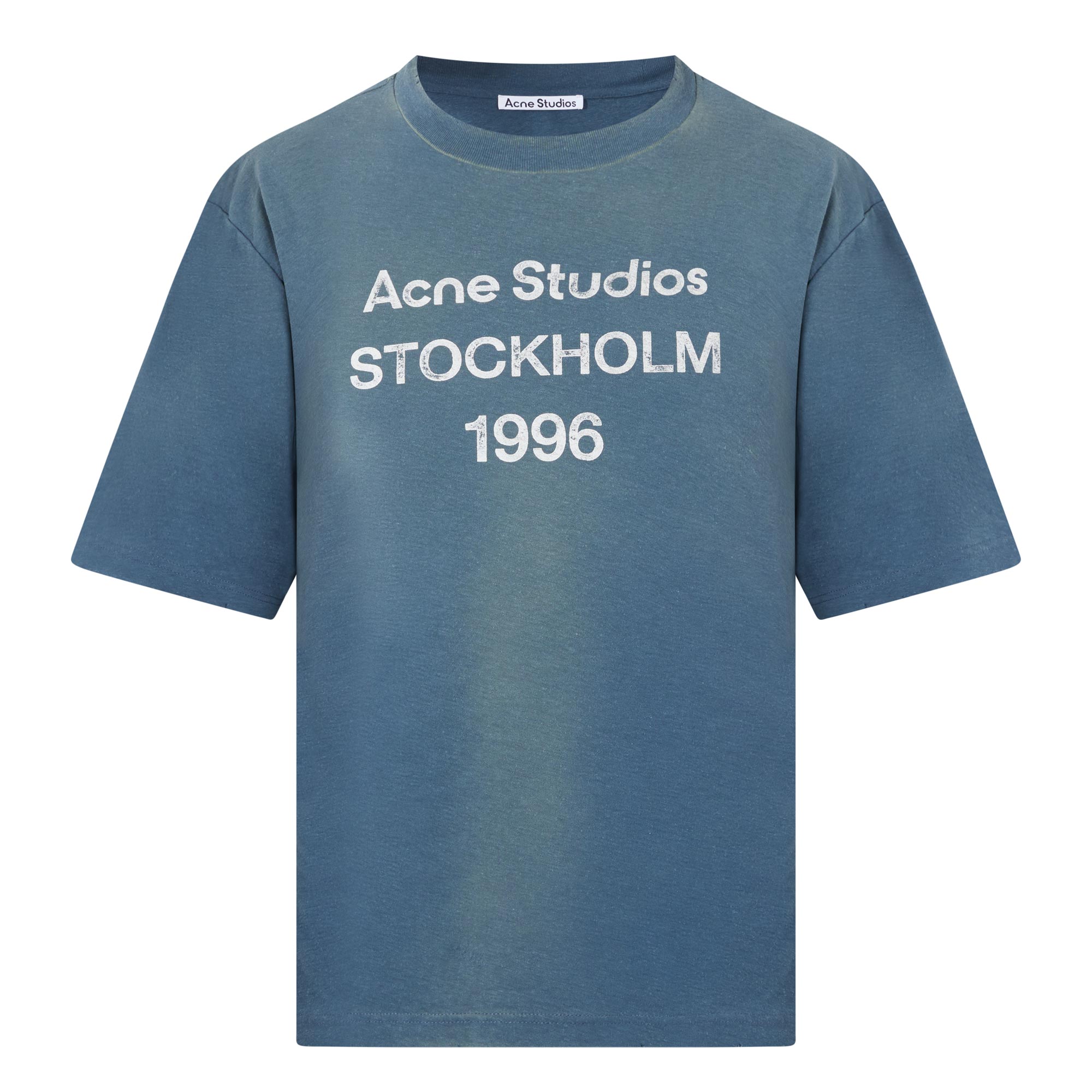 - Crew neckline, short sleeves, dropped shoulders, Acne Studios 1996 stamp logo, distressed neckline, cuffs and bottom hem, sprayed vintage finish
