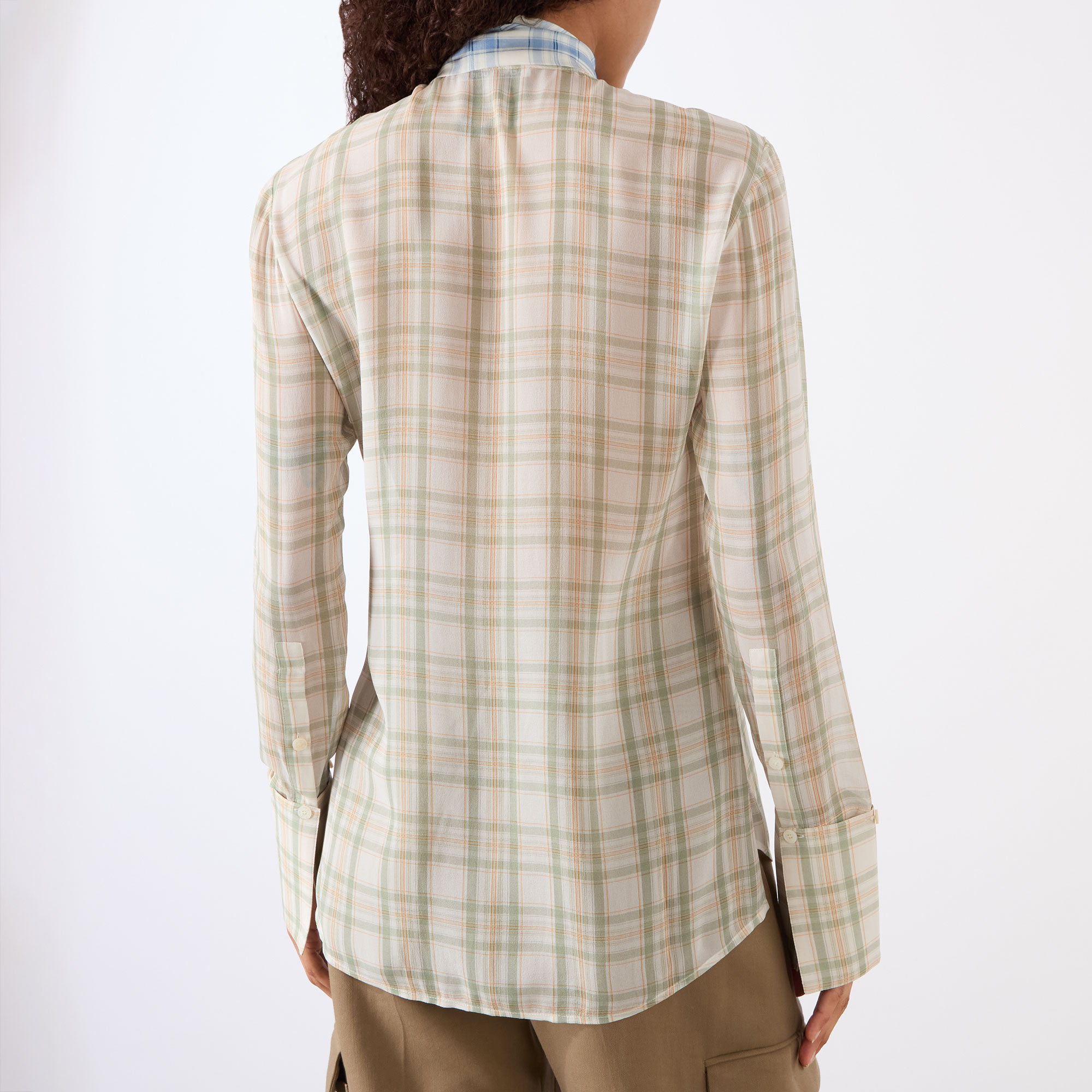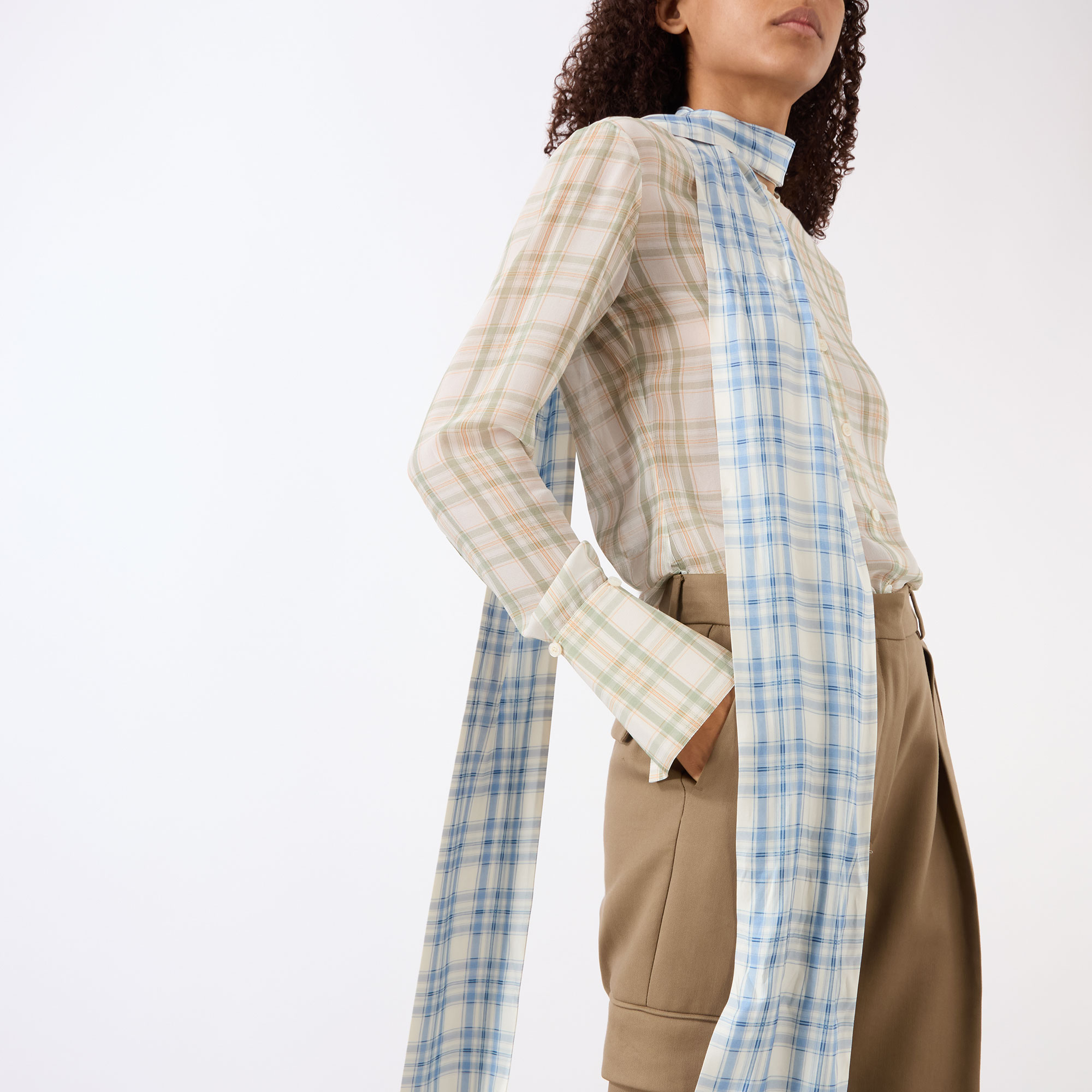 - Stand collar with tie-fastening in a contrasting check print, long sleeves, extended button cuffs, front button fastening, curved hem, tonal check print design