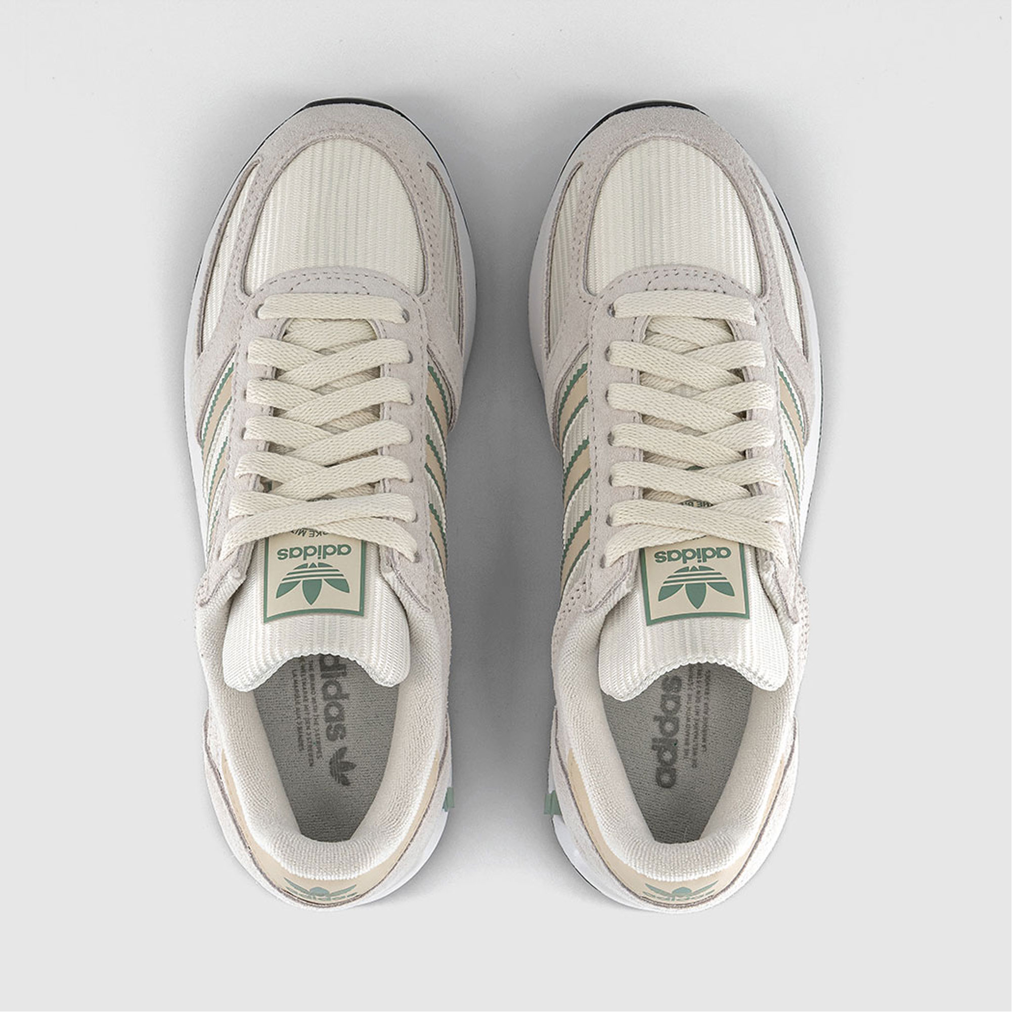 - Soft nylon upper, suede overlays, lightweight, reshaped midsole, signature heel plugs, serrated three-stripe details, Trefoil branding, durable rubber outsole, lace-up fastening