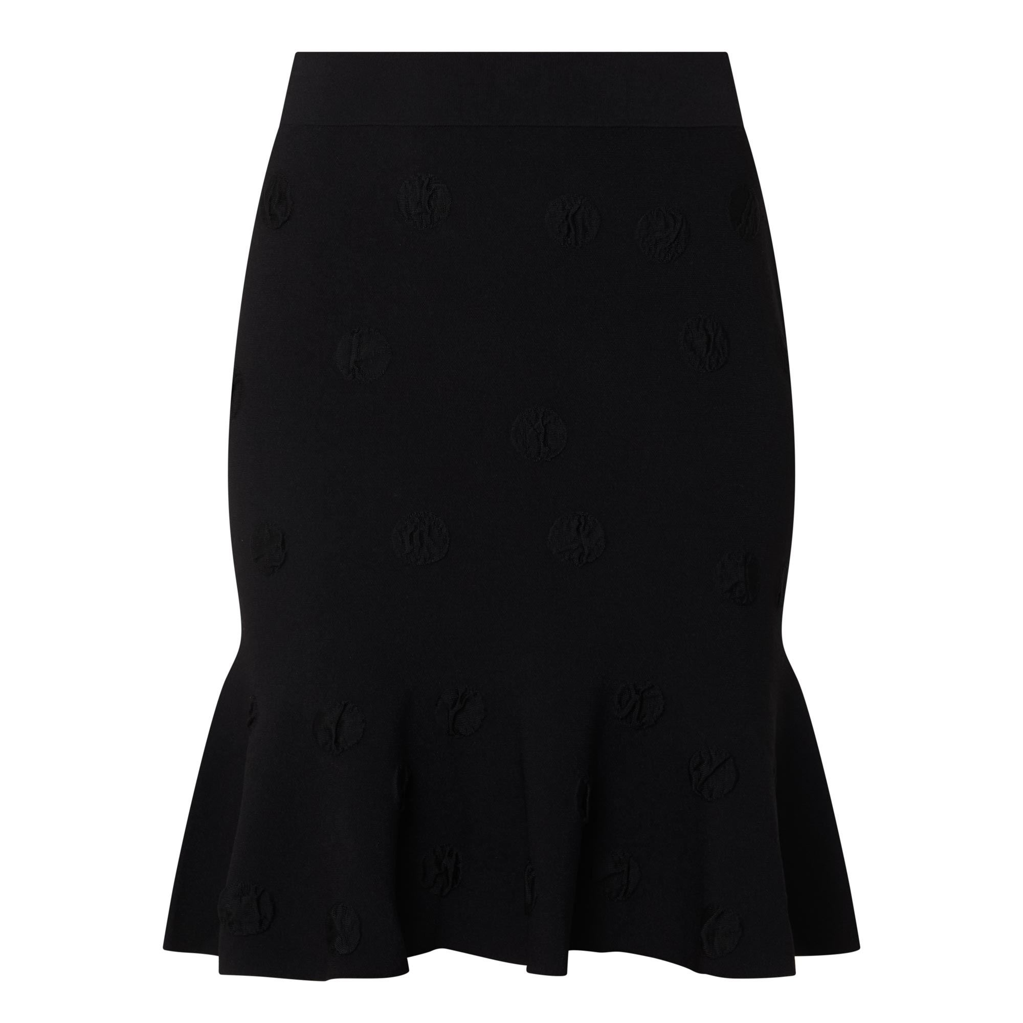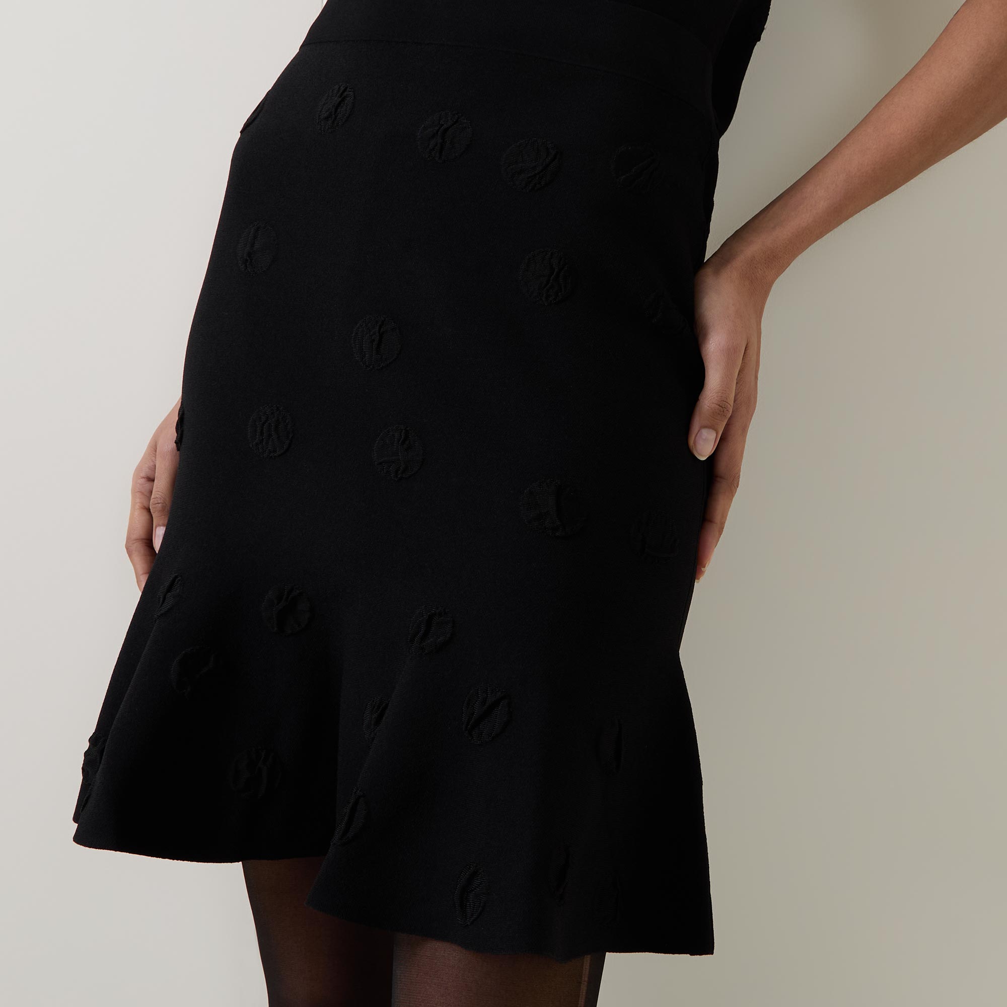 - High-rise, inner elasticated waistband, tonal dotted design, fitted silhouette, flared ruffle hemline, mini length, fine-knit finish
