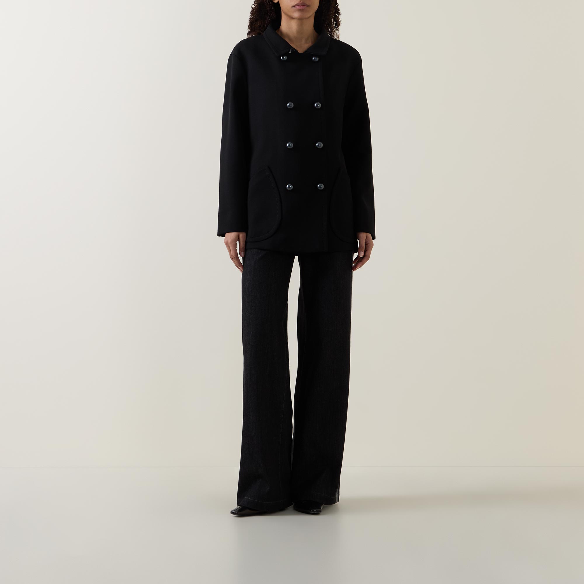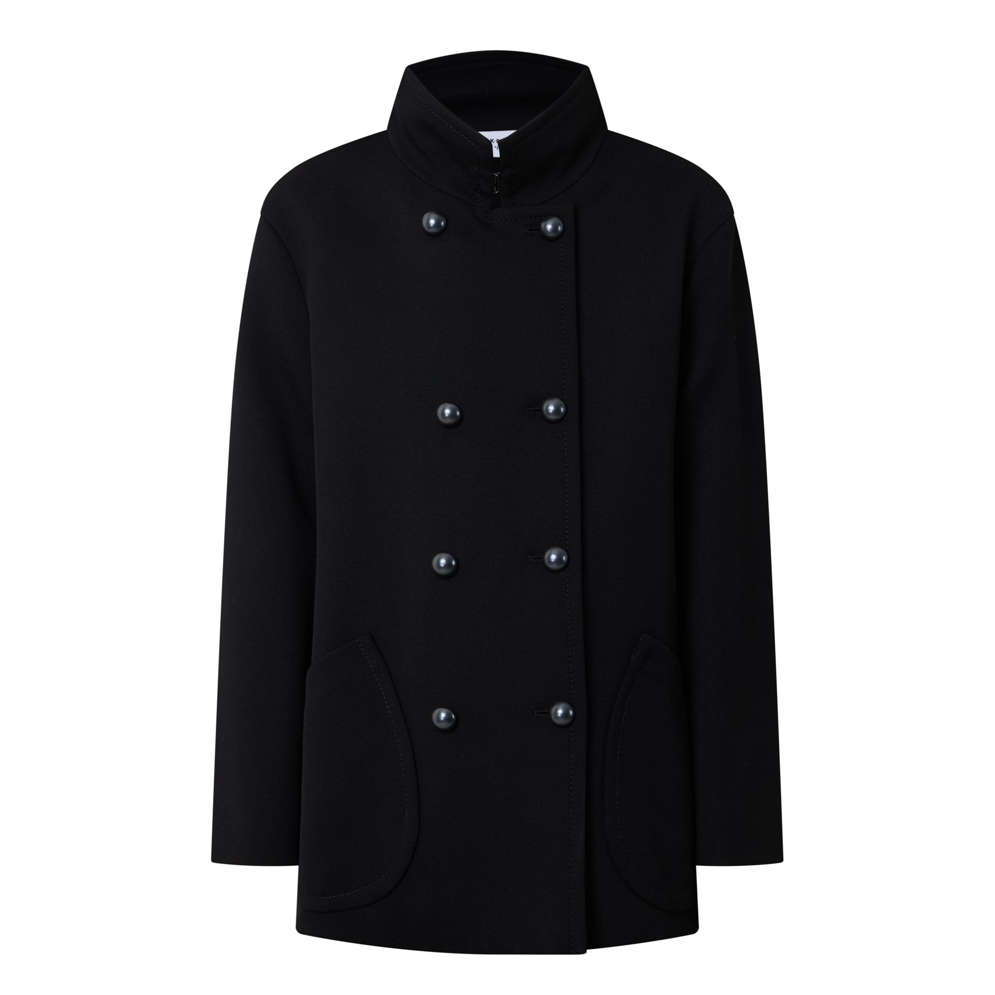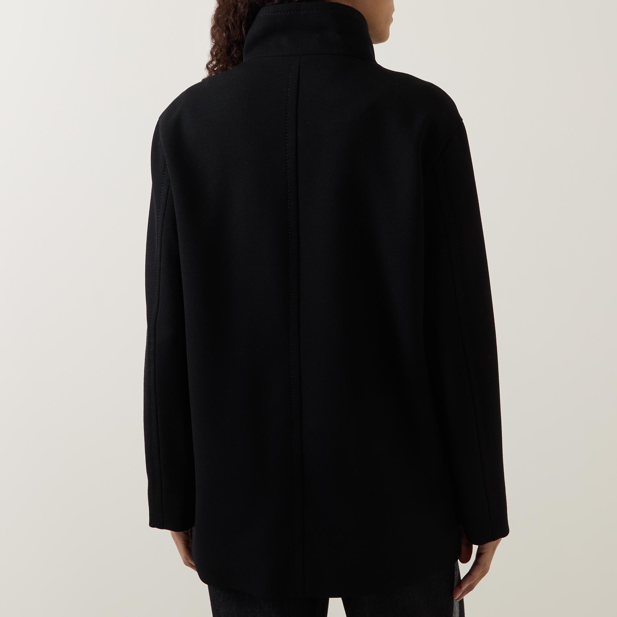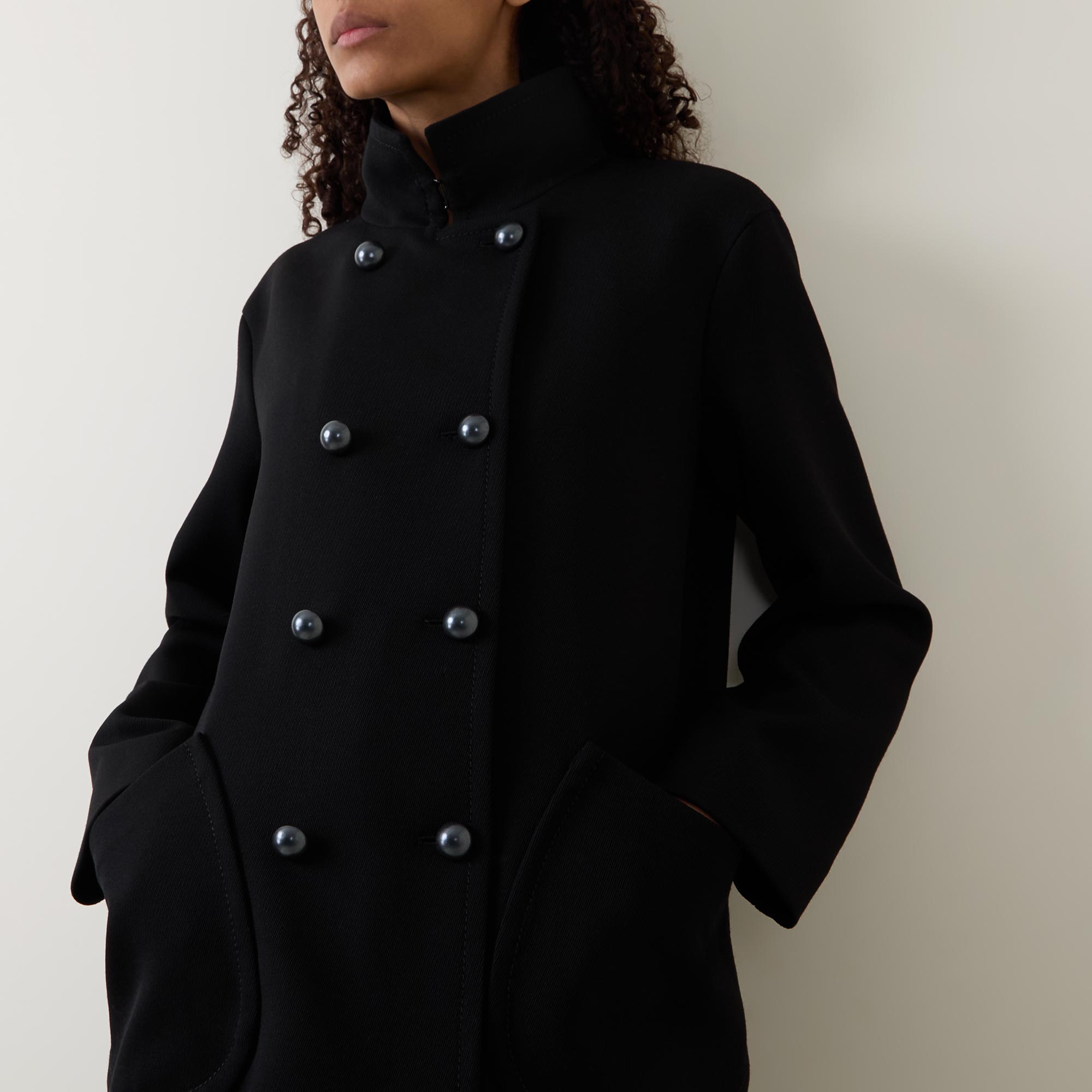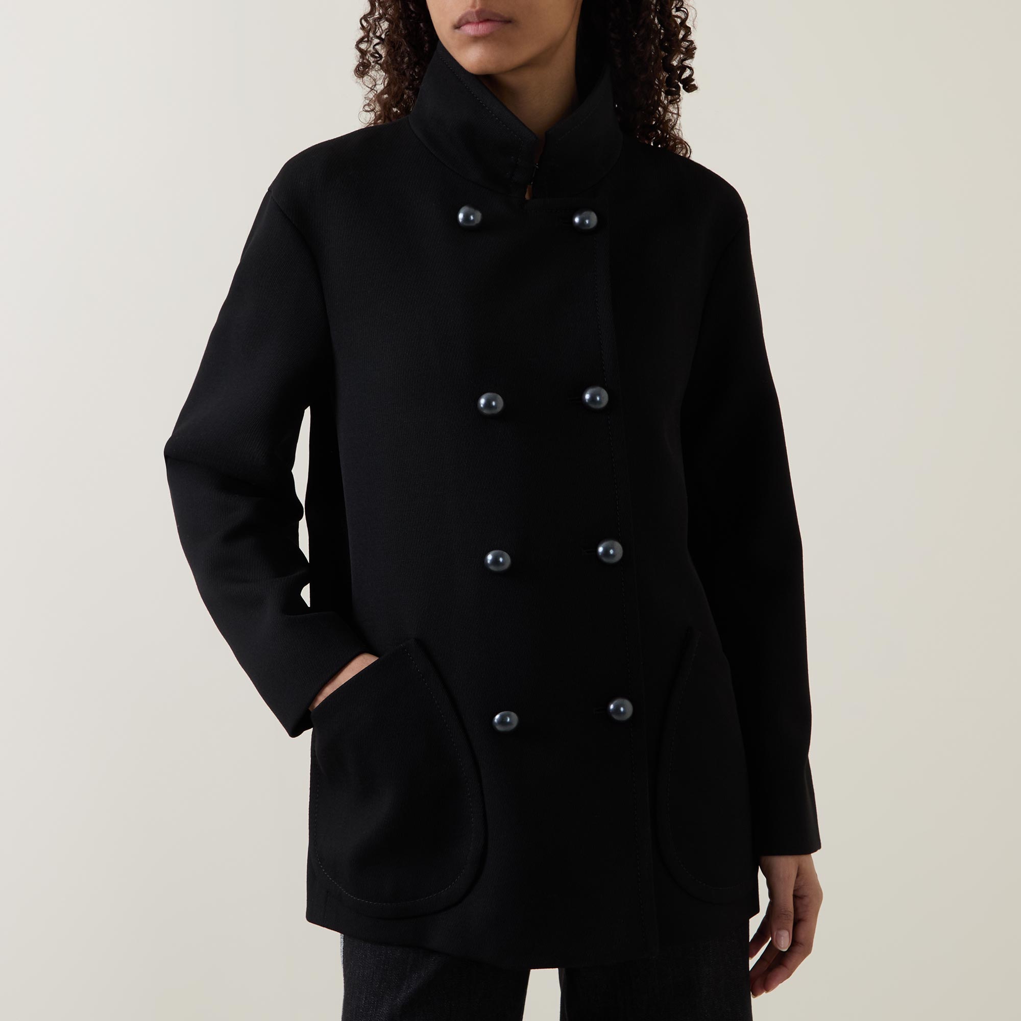 - Stand-up collar, long sleeves, dropped shoulders, double-breasted front, tonal buttons, two diagonal patch pockets, smooth fabric