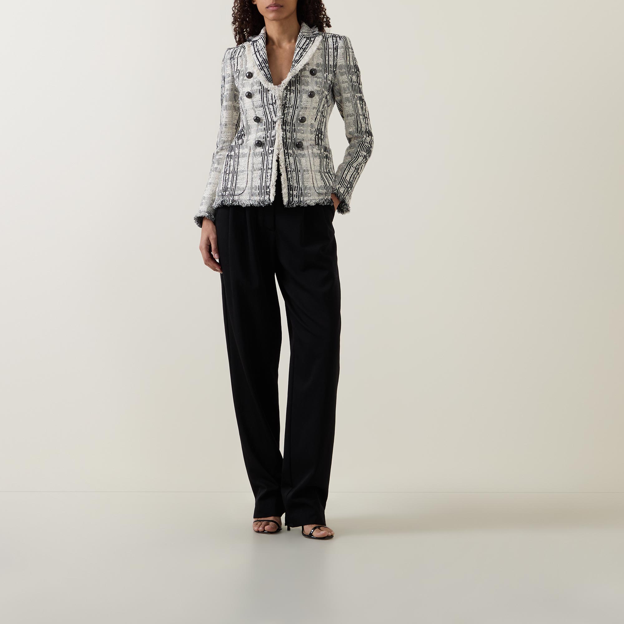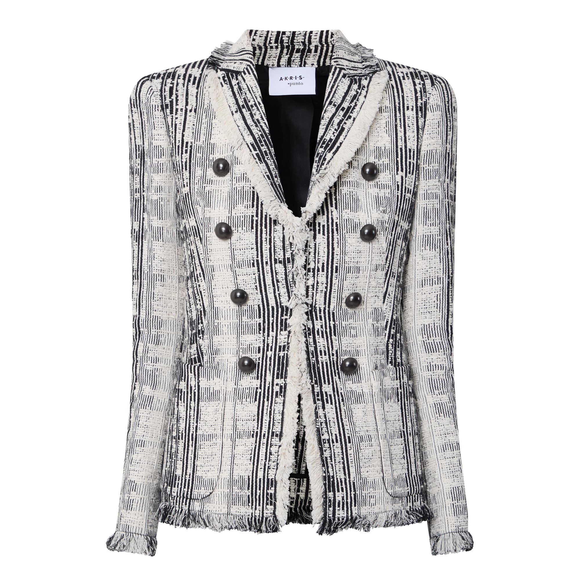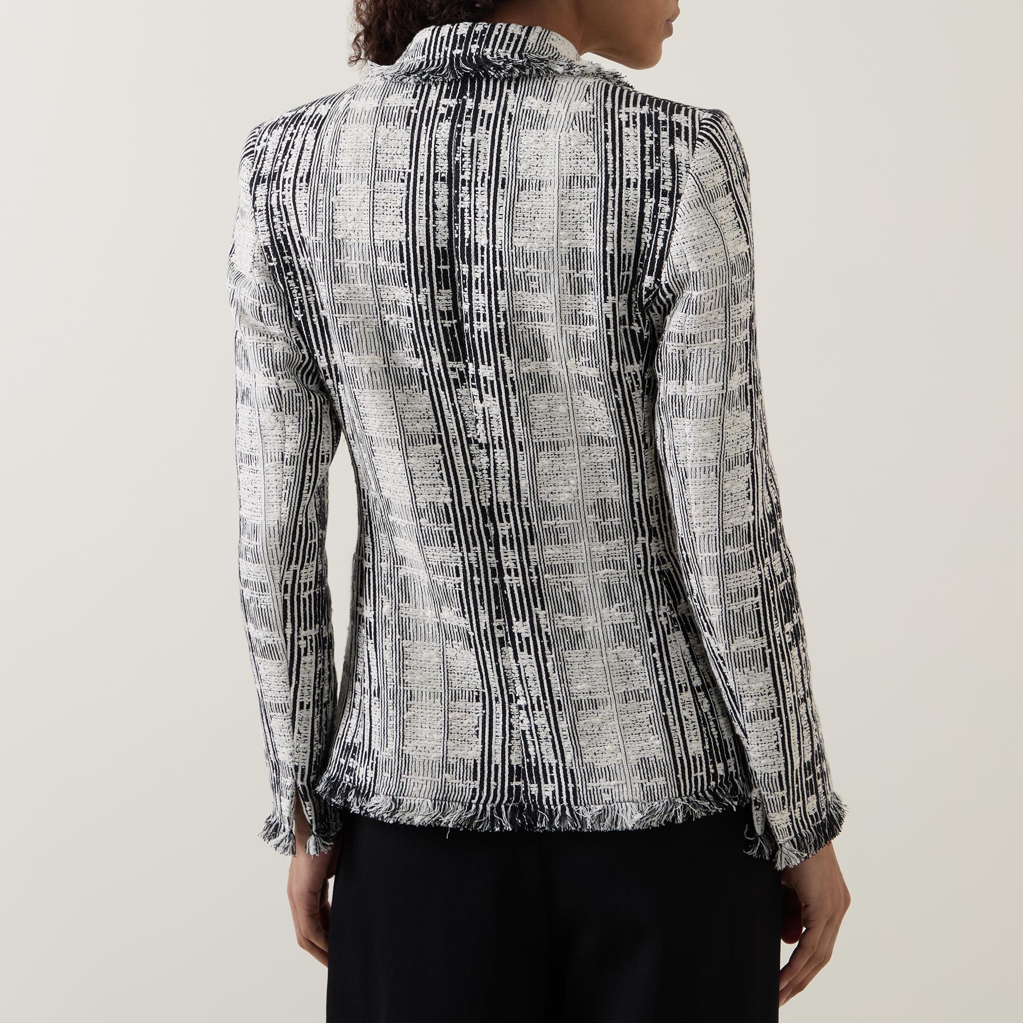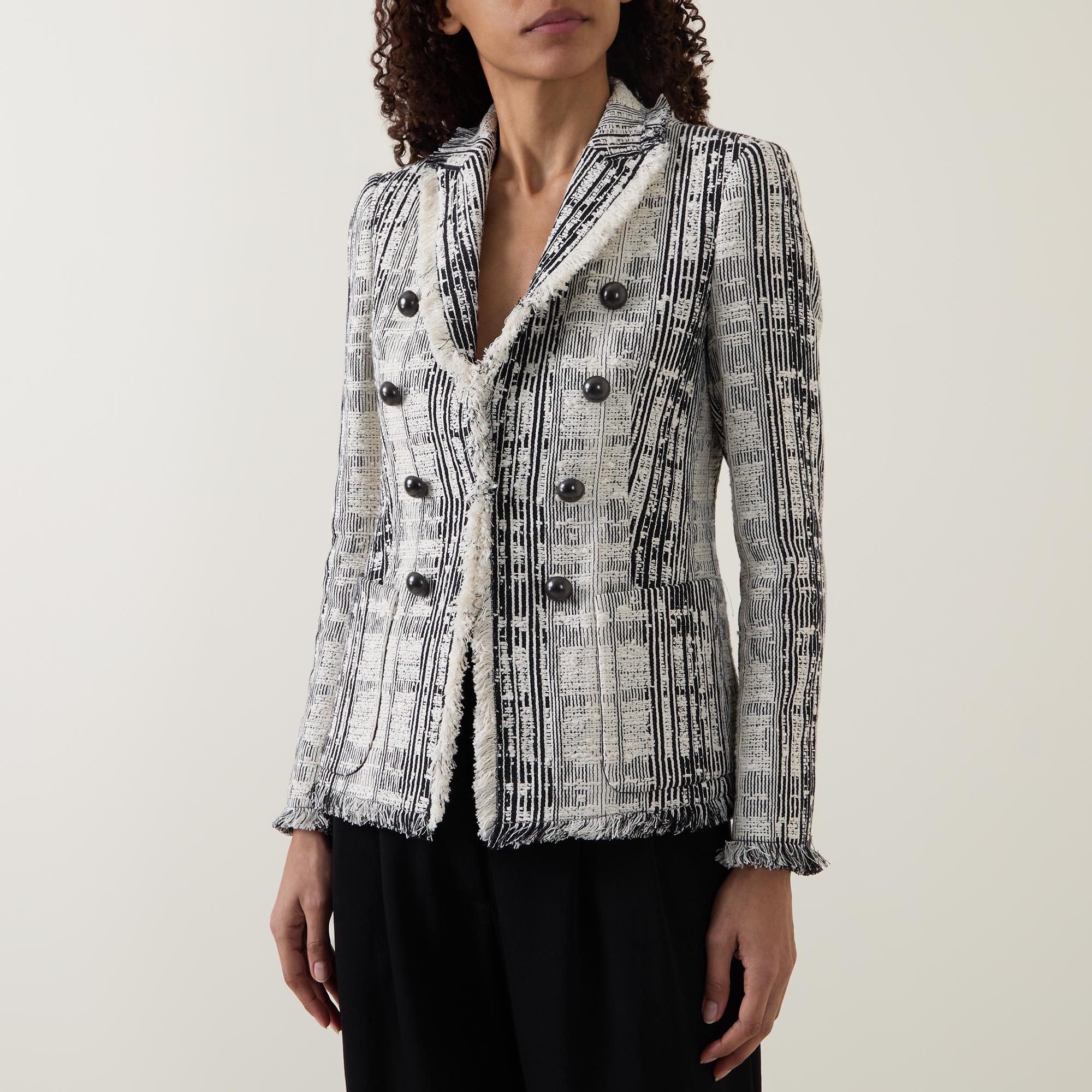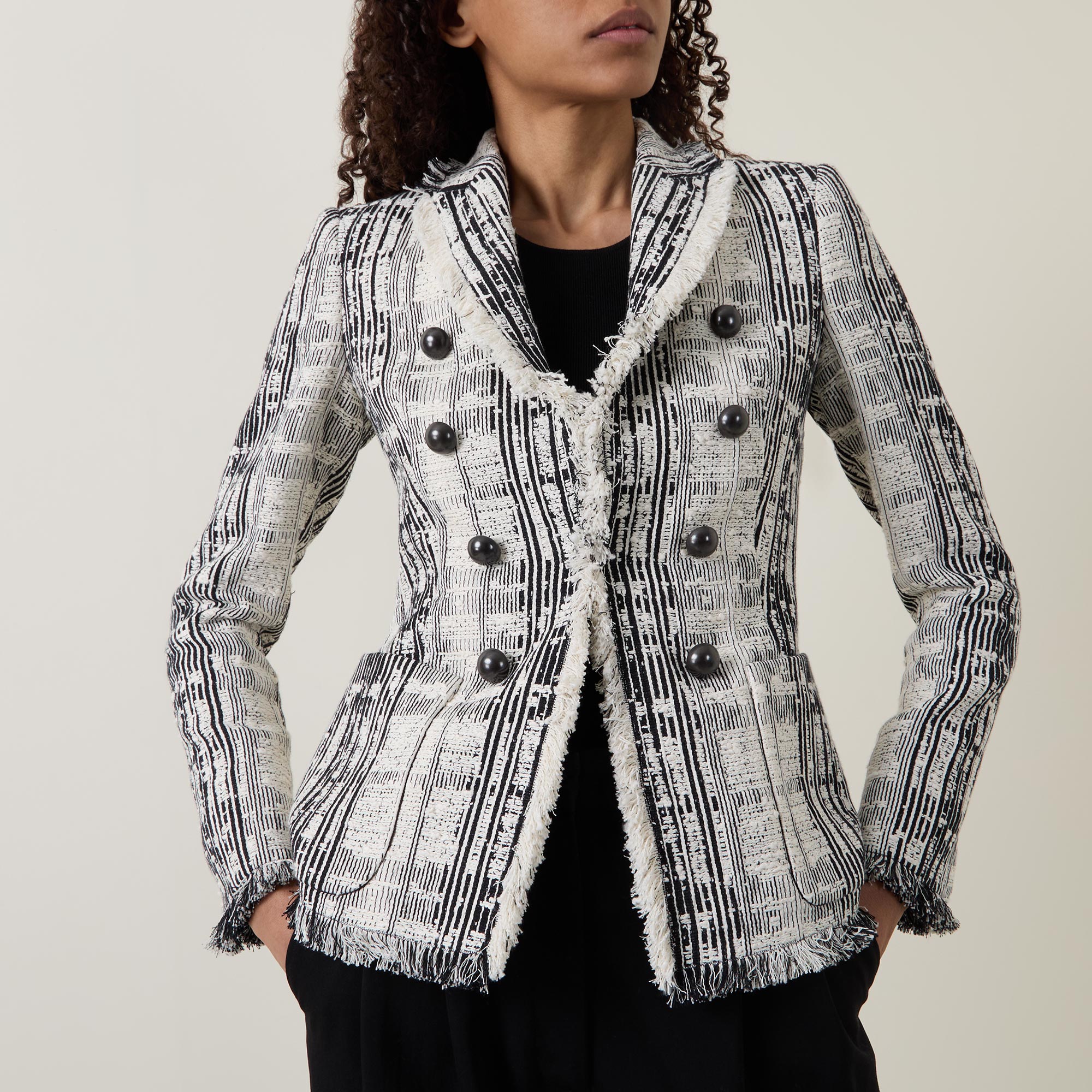 - Double-breasted front, long sleeves, peak lapel collar, contrasting button fastenings, two side patch pockets, frayed cuffs, contrasting striped pattern, frayed hemline, textured tweed finish