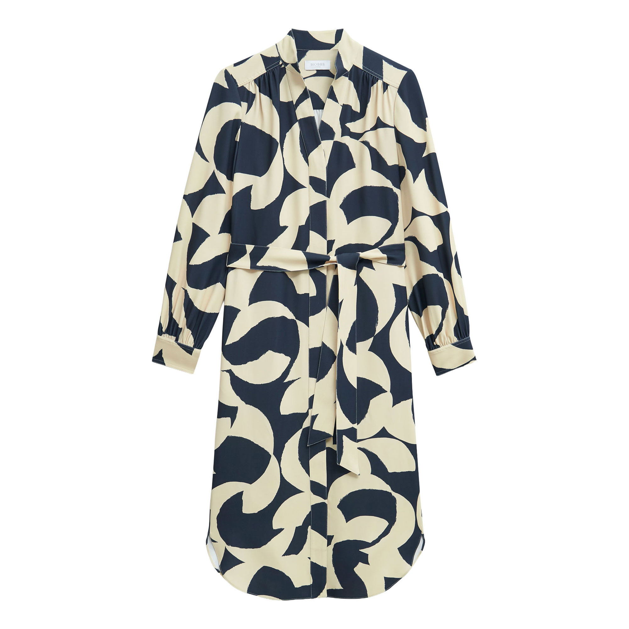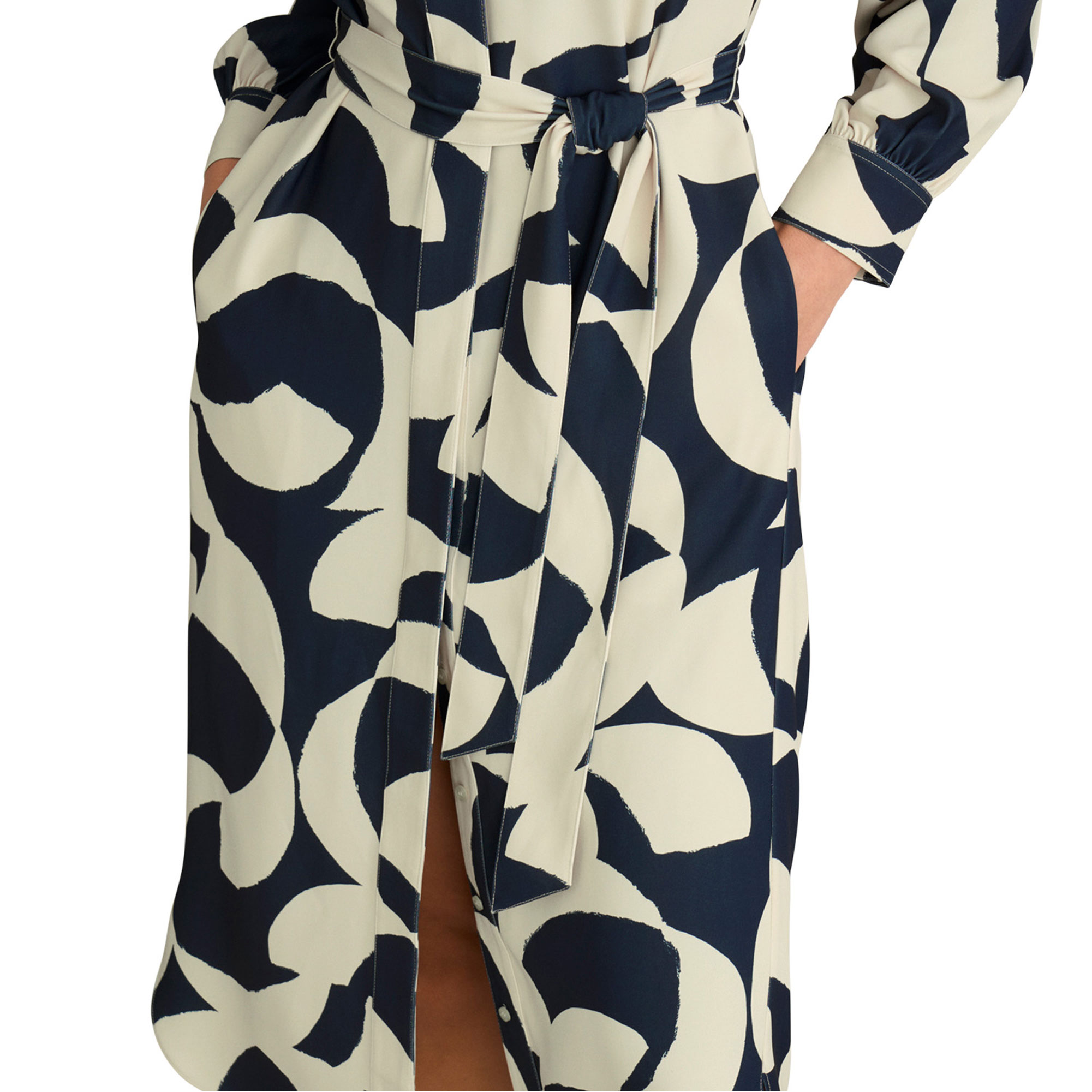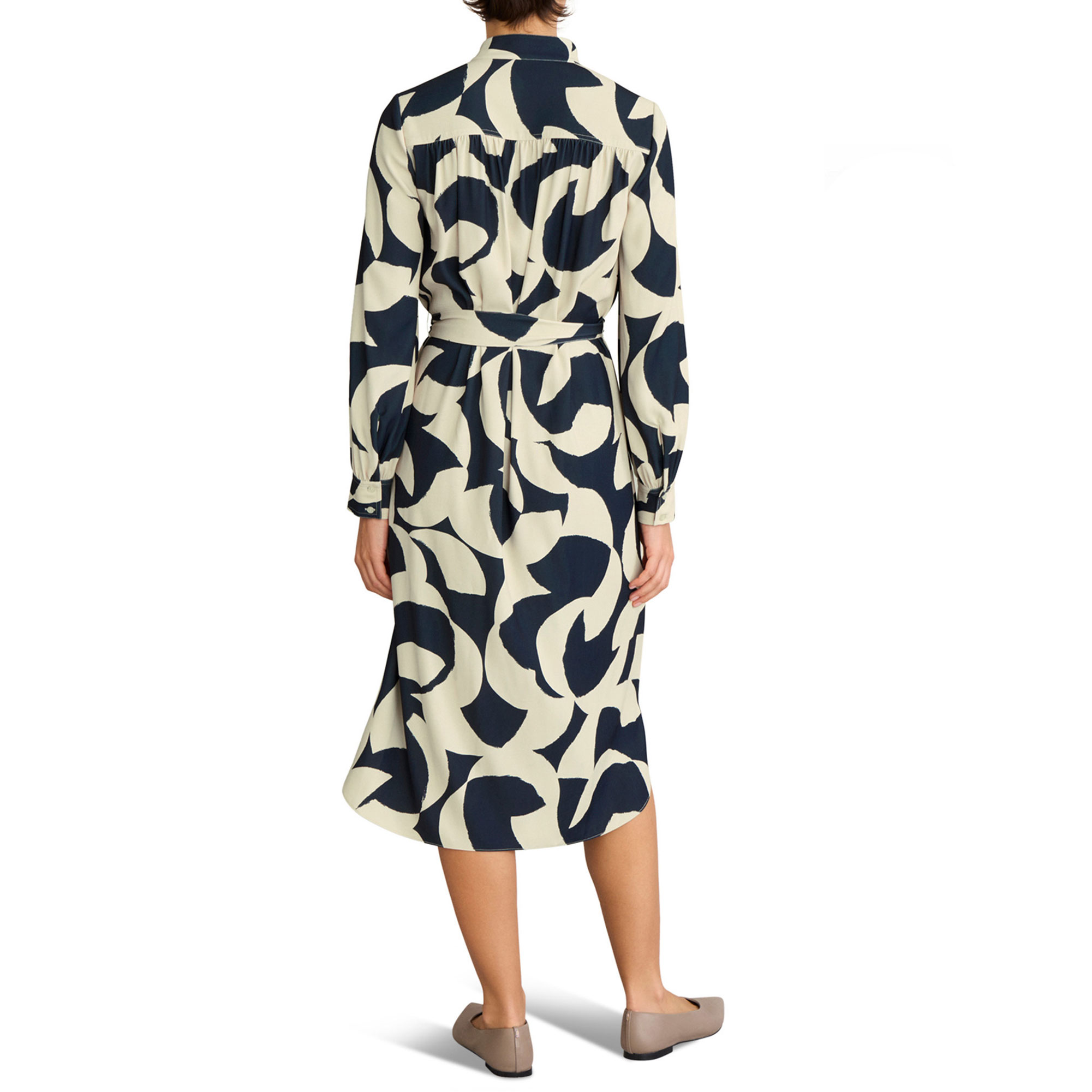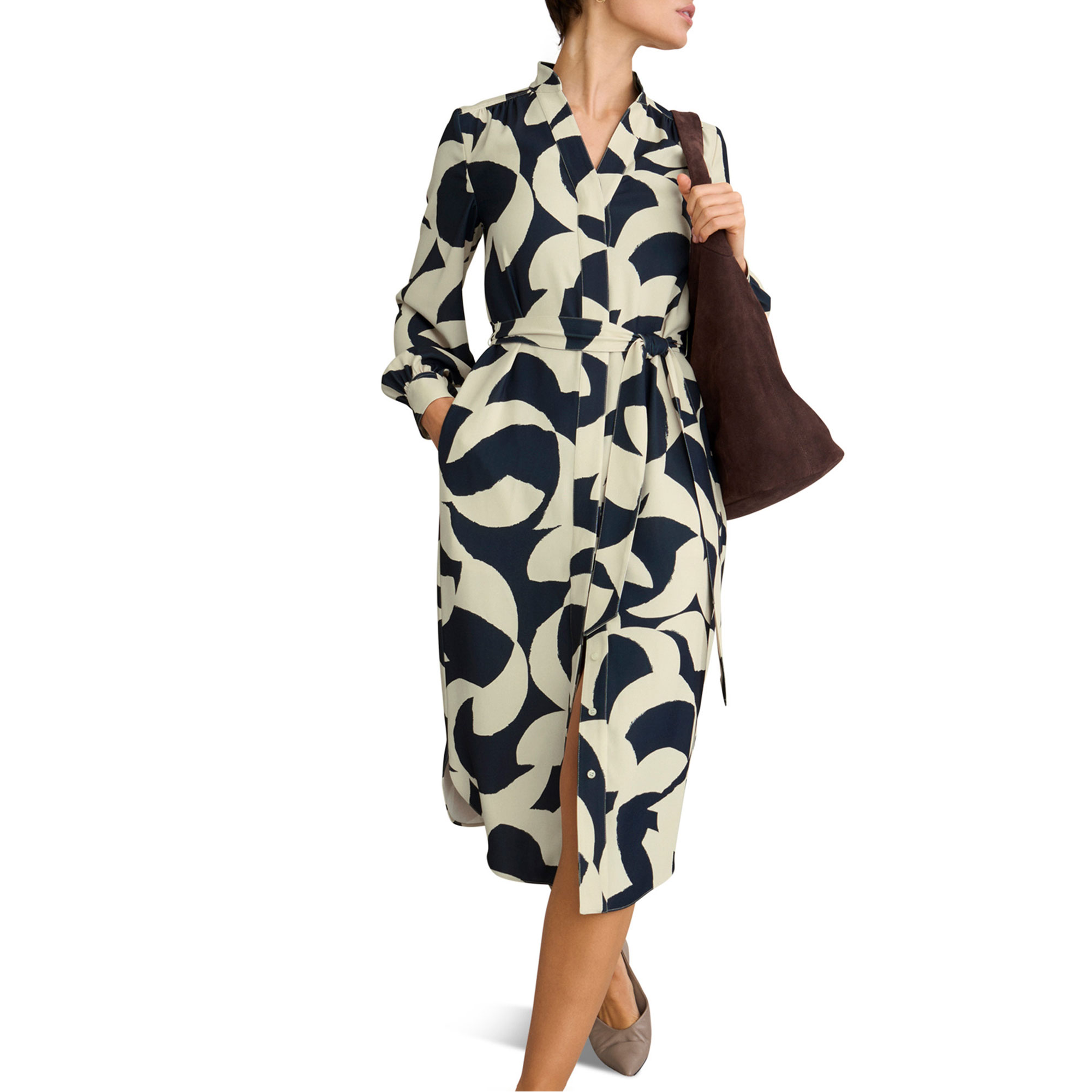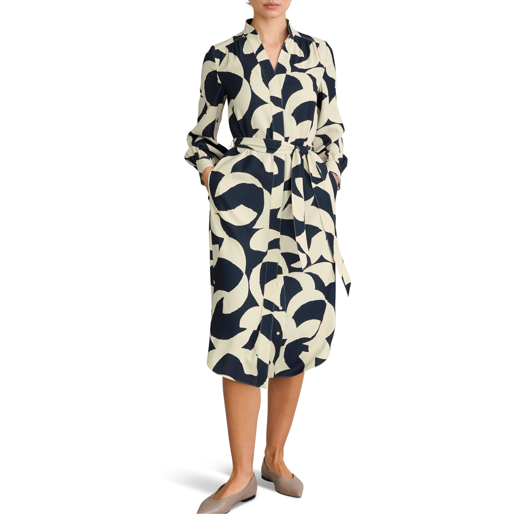 - Geometric print, gathered trims, functional side pockets, tie waist, concealed placket, open neckline, mandarin collar, midi length, long sleeves, cuffs, front fastenings, jersey fabric