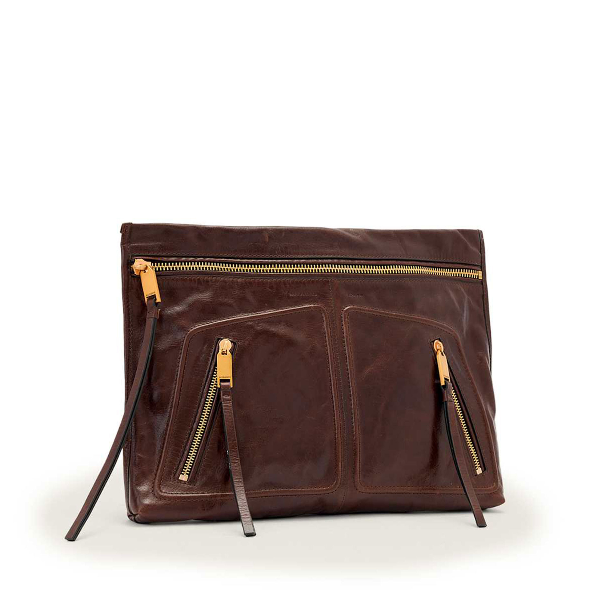 - Oversized clutch, piped pocket details, shine finish, cracked faux-leather look, antique brass hardware, long zip pulls