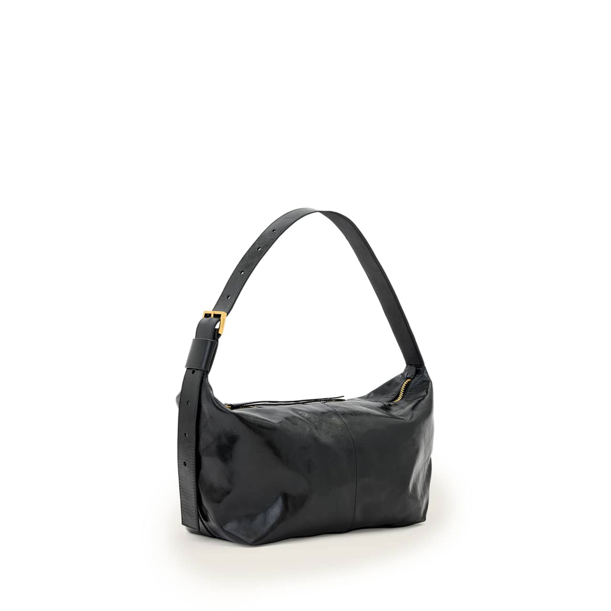 - Shoulder style, piped pocket details, shine finish, crack faux-leather look, antique brass hardware, long zip pulls