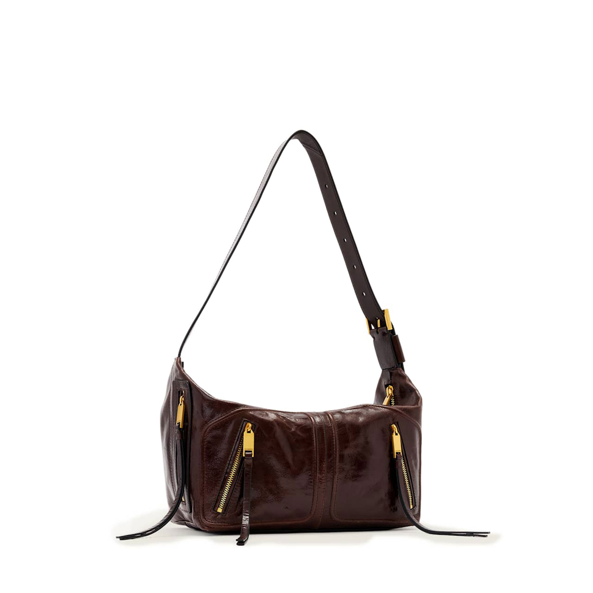 - Shoulder style, piped pocket details, shine finish, cracked leather finish, antique hardware, long zip pull tabs