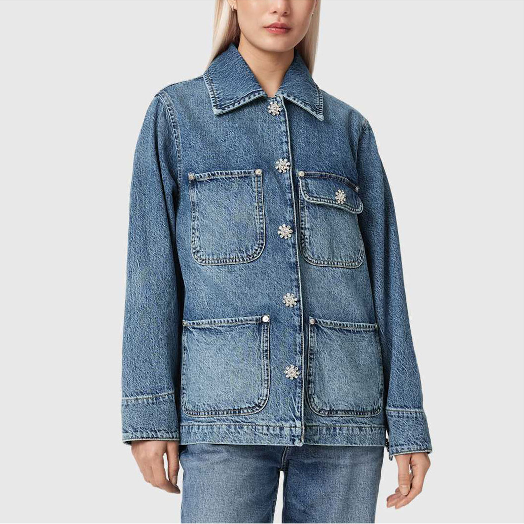 - Crystal press studs at centre front closure, logo embroidery at back of jacket