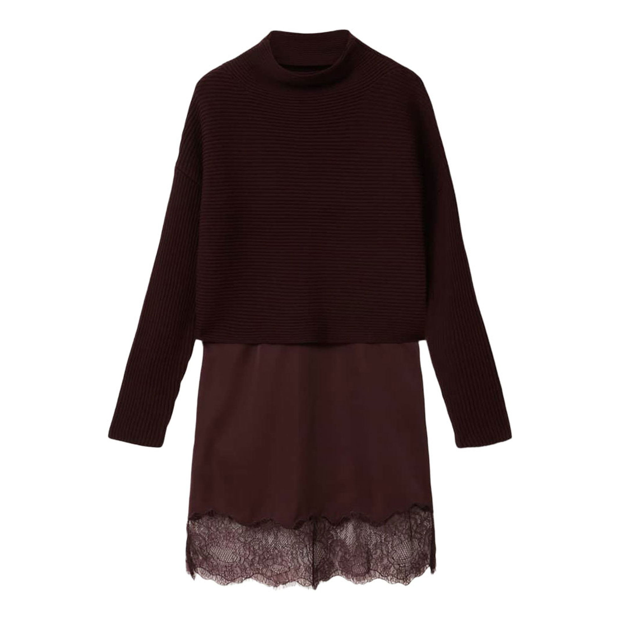 - Sweater: Funnel neck. Dress: Slip style, lace trims