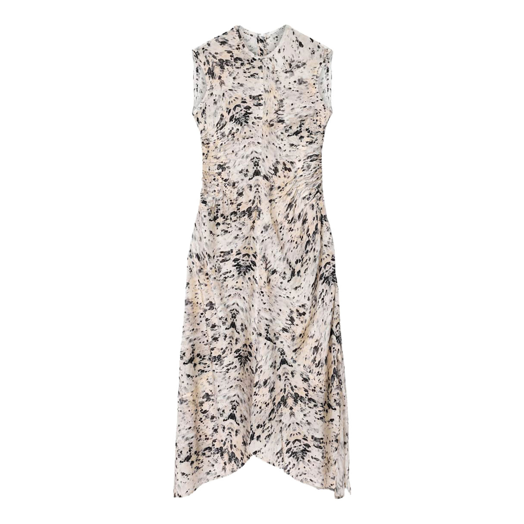 • Round neckline, asymmetric hem, printed, raw edge details, contrast stitch seam, long side seams, exposed zip fastening, branded zip puller, symmetrical circular gathering, hem panel with side splits