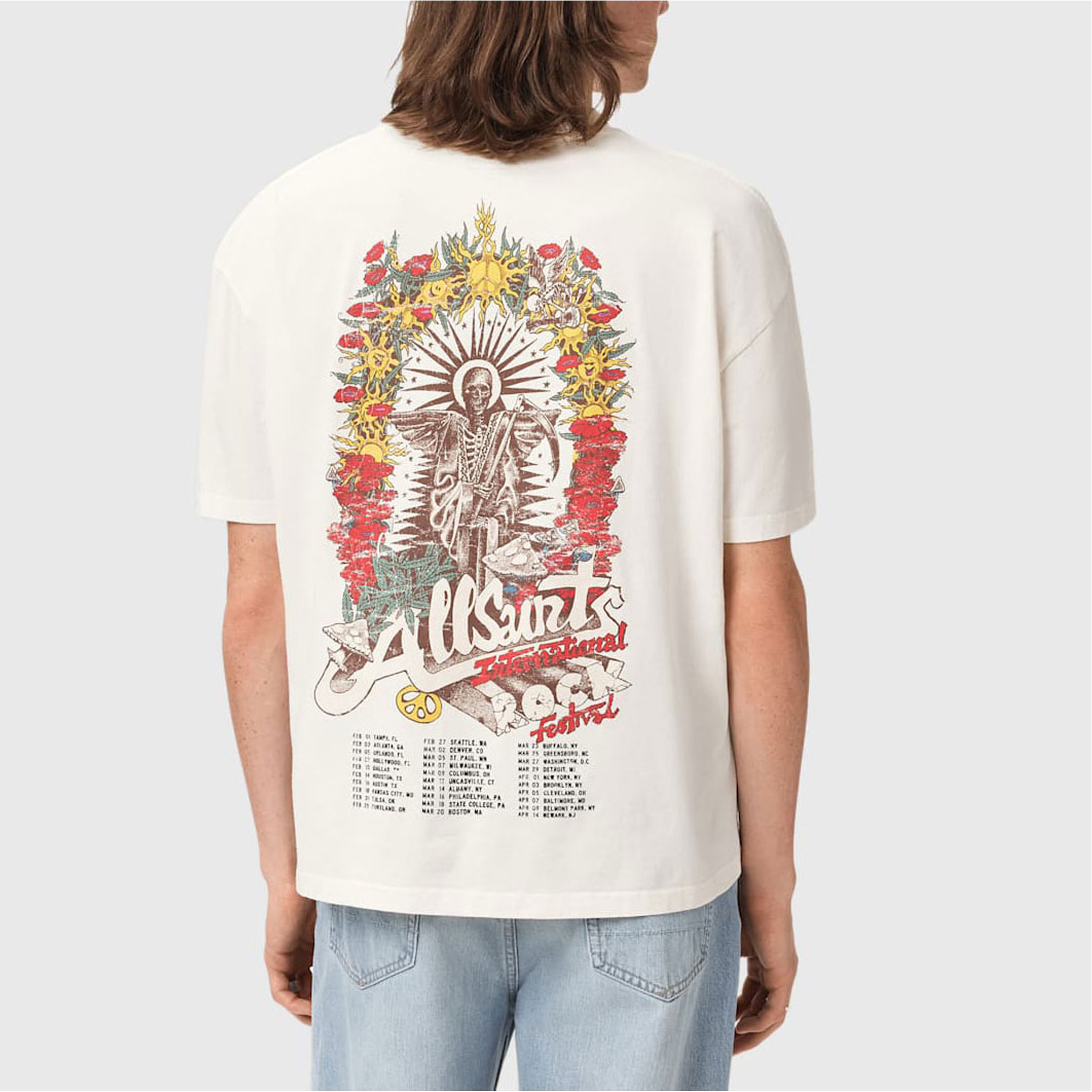 • Ribbed neckband, flatlock stitching, all-over fadeout wash print, hand-drawn rock fest concert print