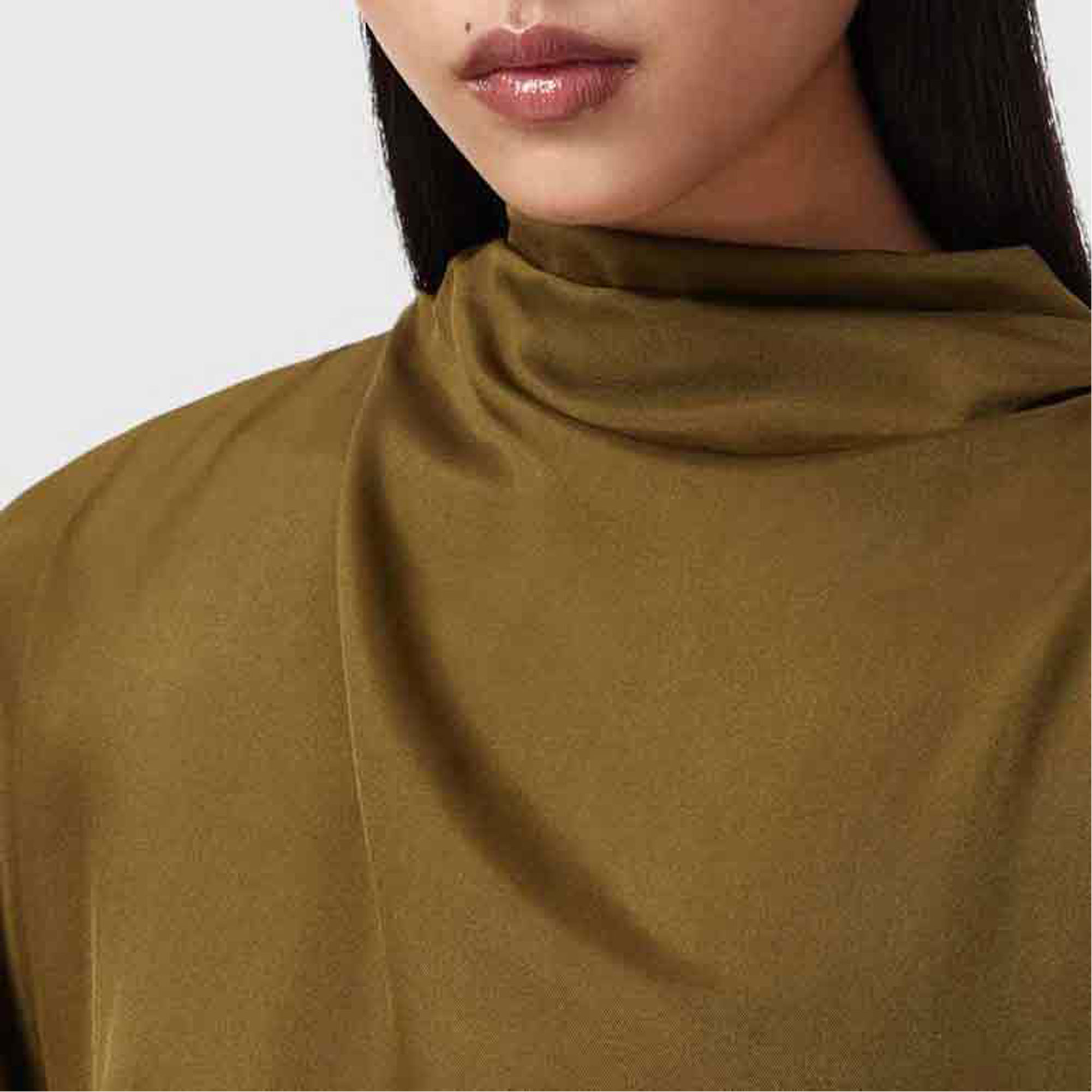 • High cowl neckline, fluted short sleeves, ruched tie detail at side seam, keyhole back opening