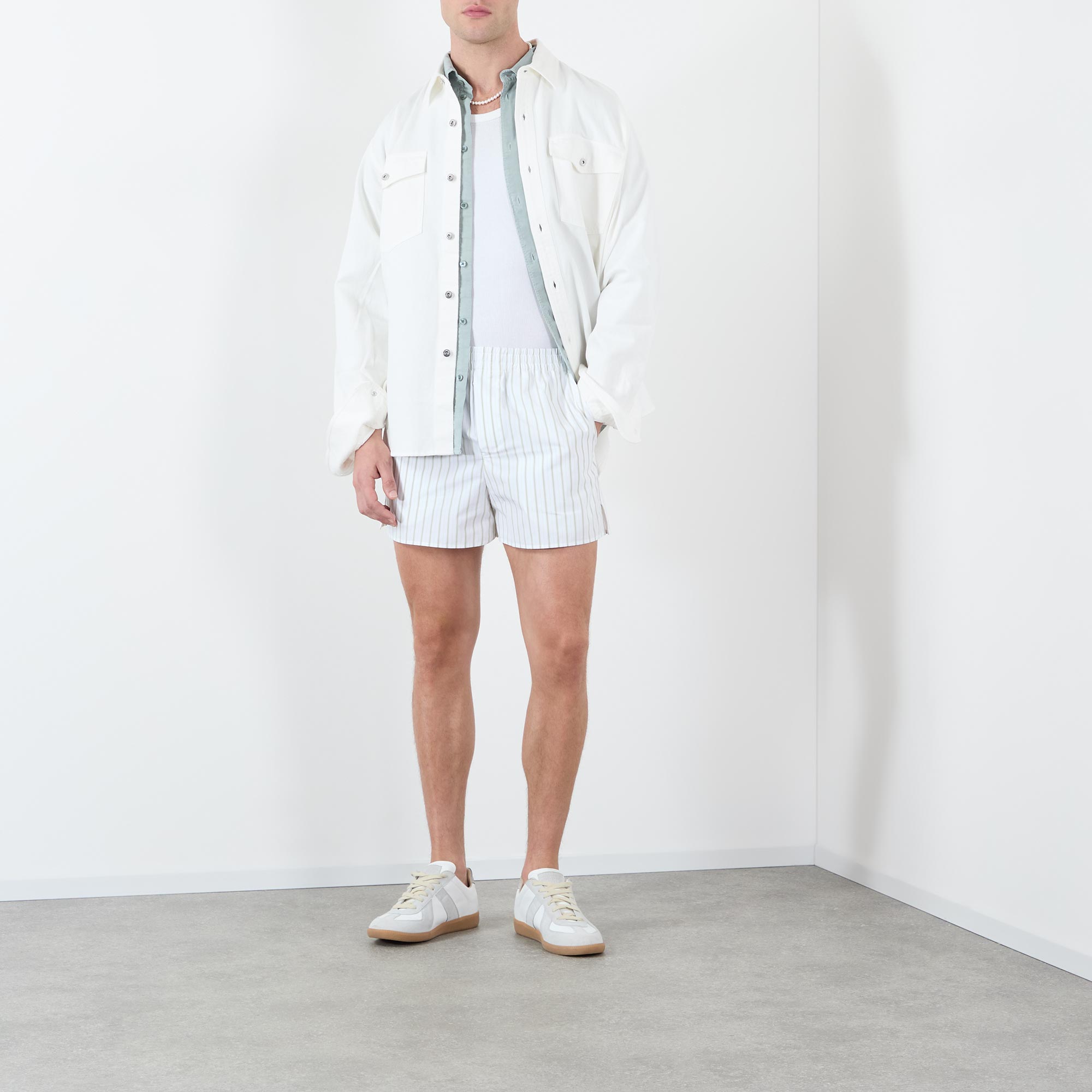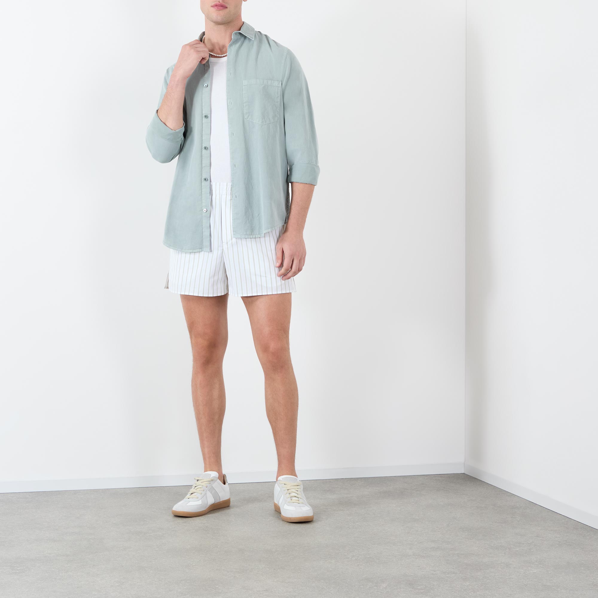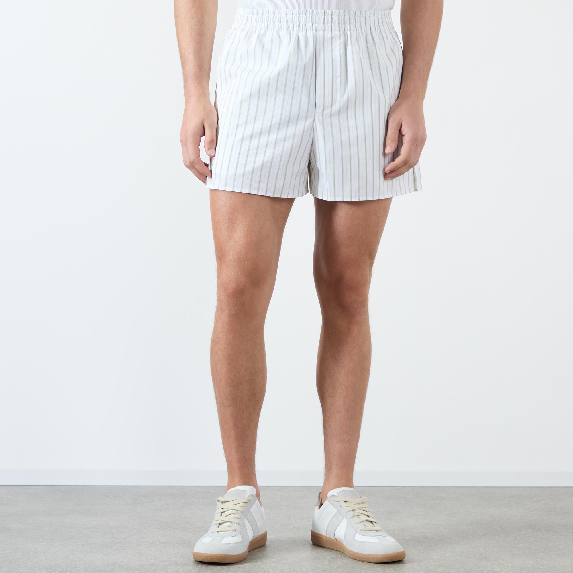 • Mid-rise, straight-leg, elasticated waistband, mock fly, two side entry pockets, one rear patch pocket, clean hems, side slits, striped pattern, logo label