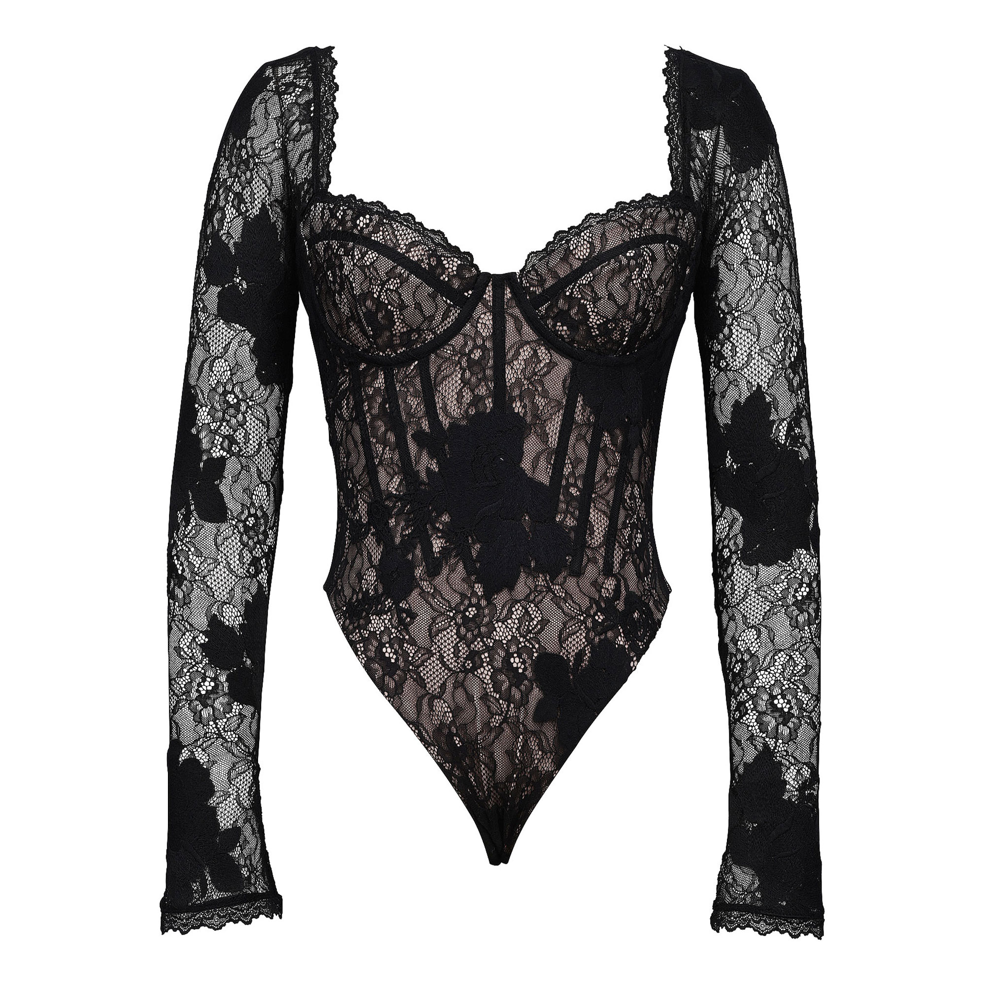 - Lace design, sculpted corsetry, stretch-fused base, power mesh, floral embroidery, long sheer sleeves