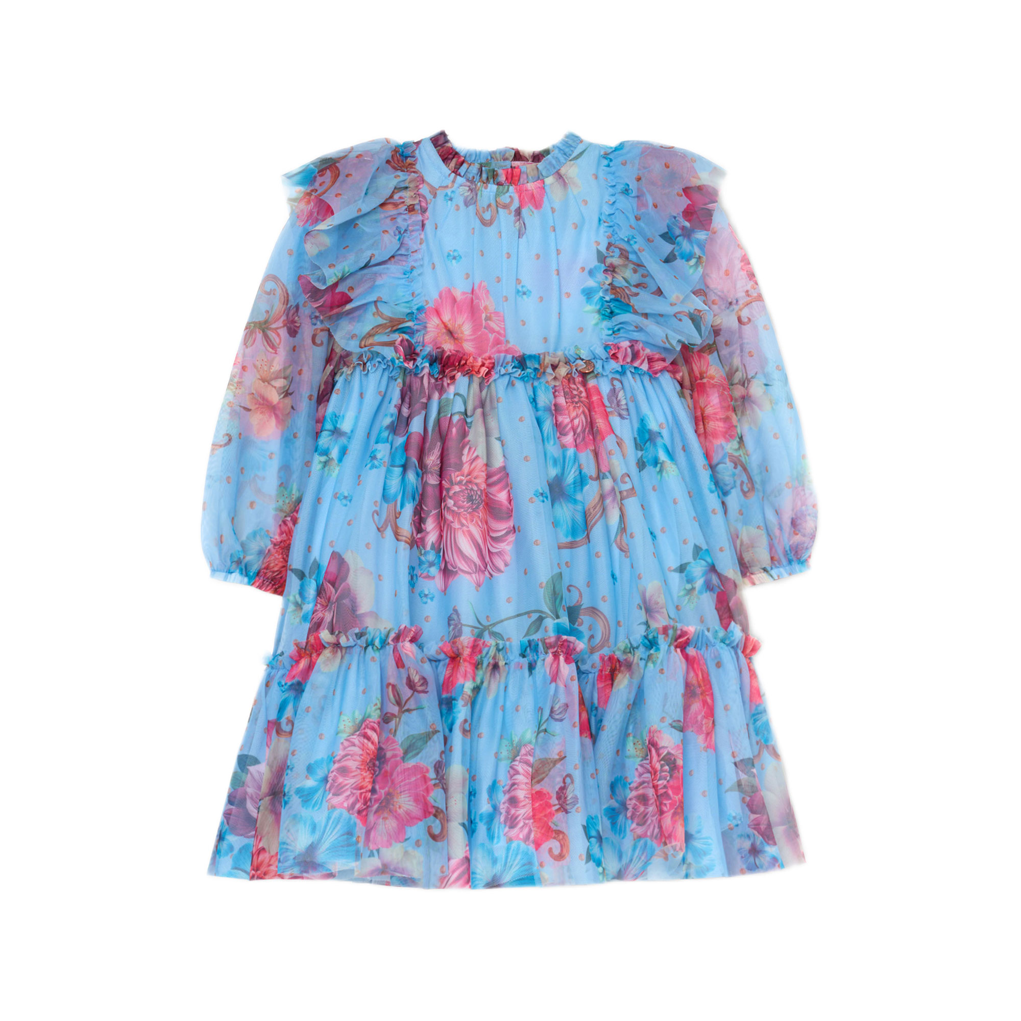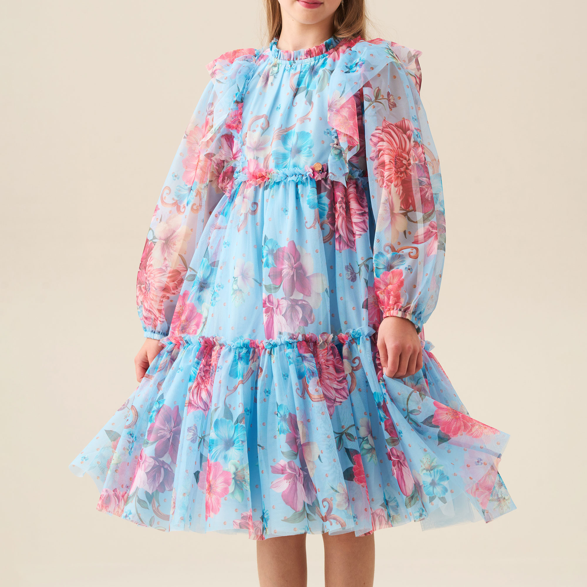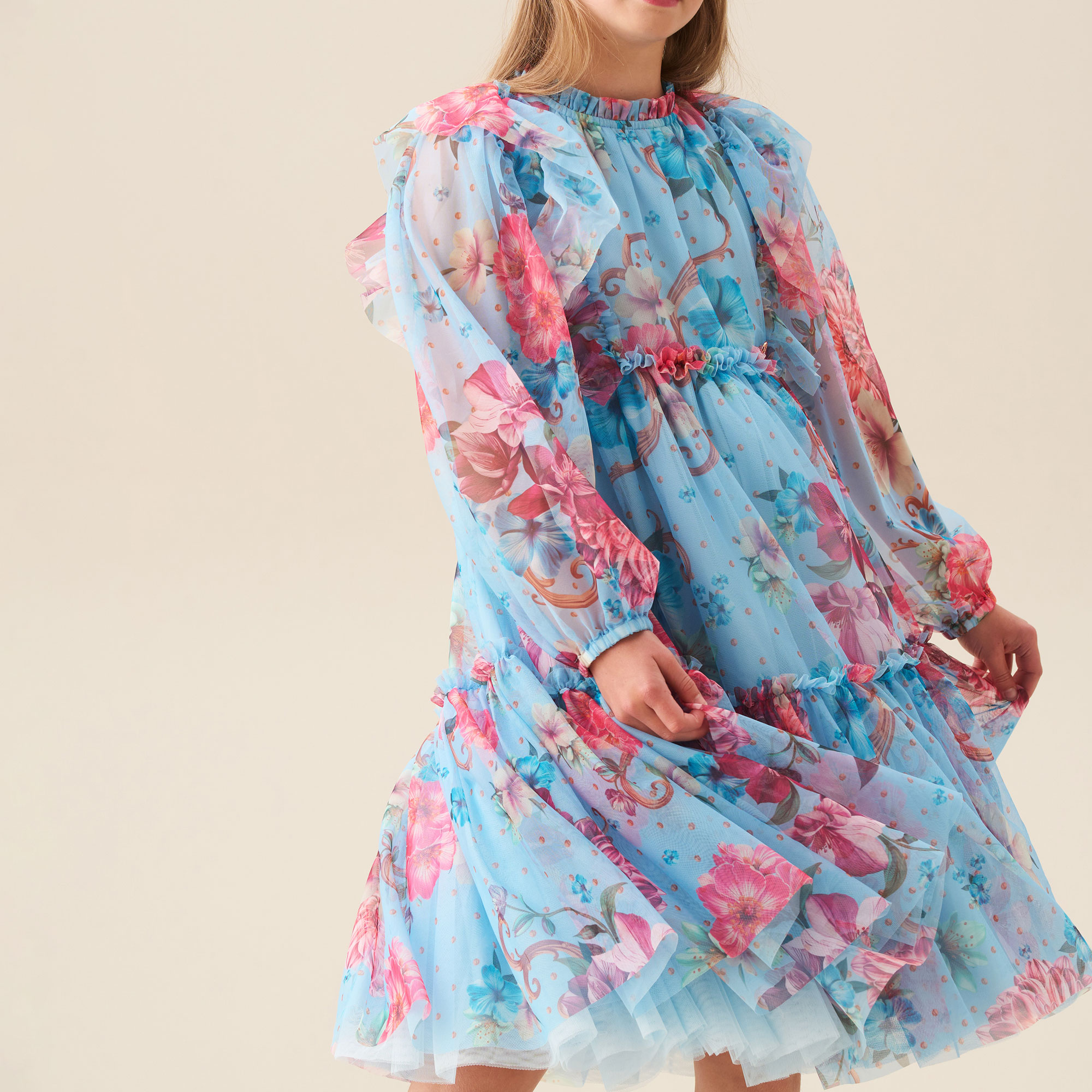 - Floral print, layered soft mesh, full skirt