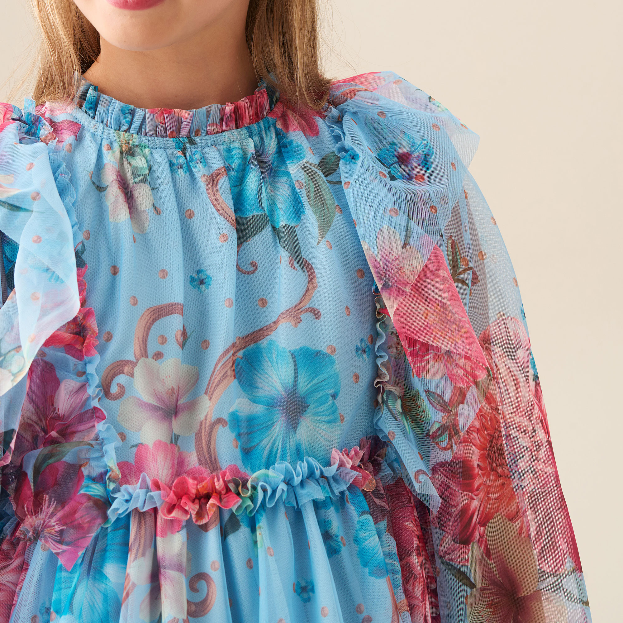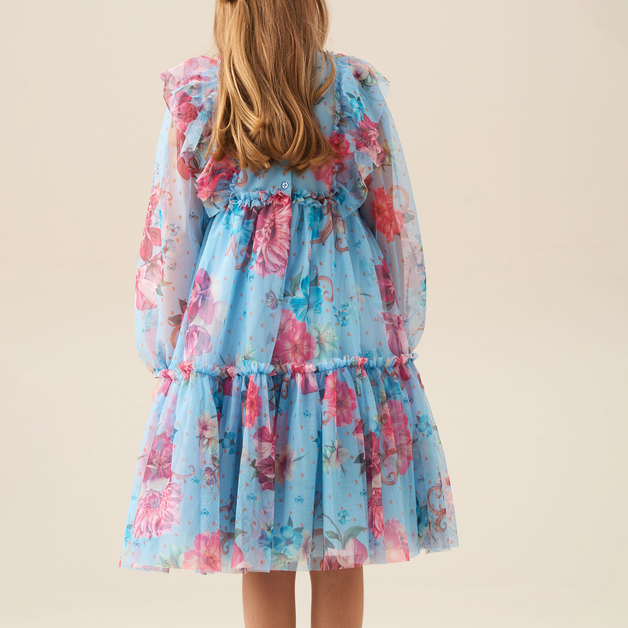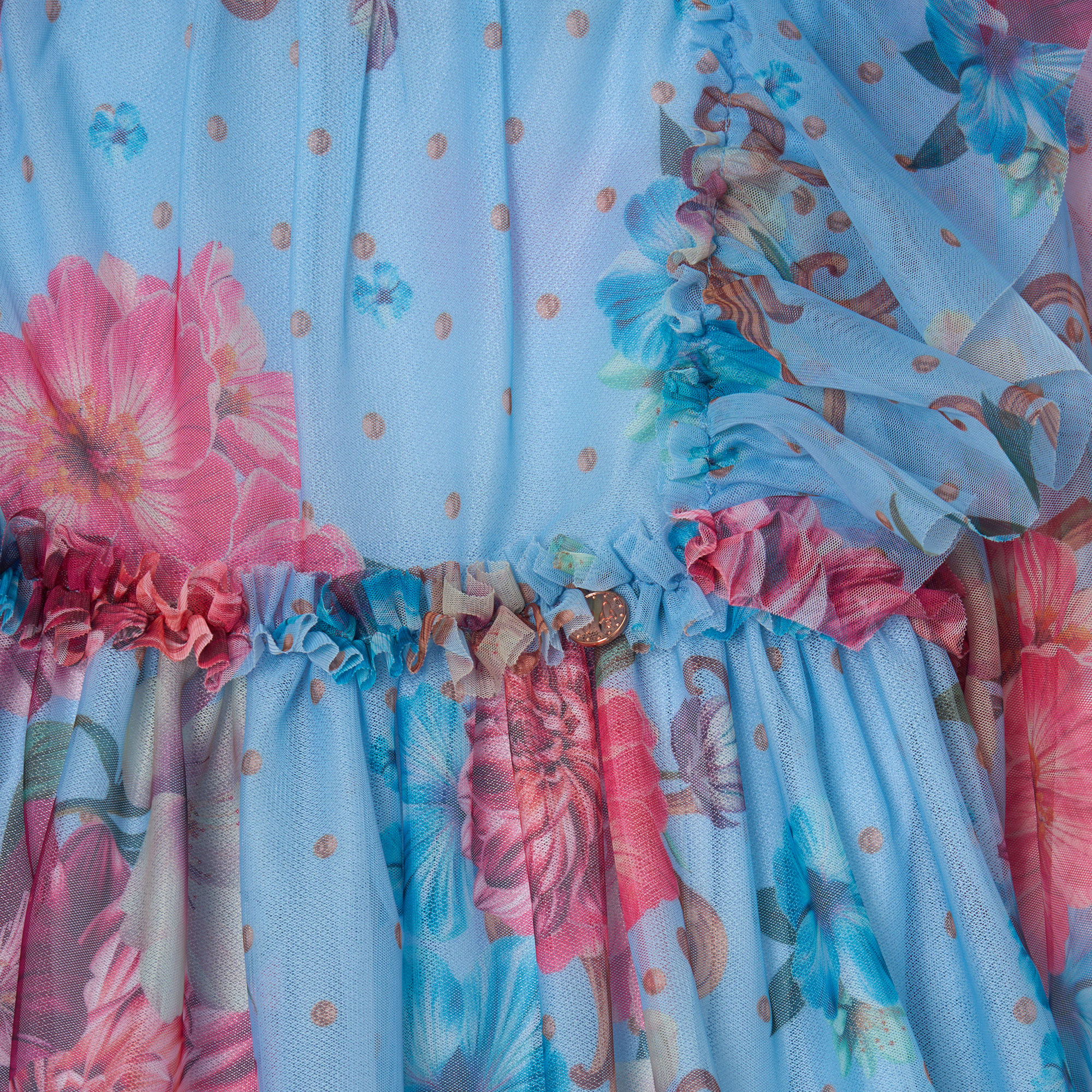 - Floral print, layered soft mesh, full skirt