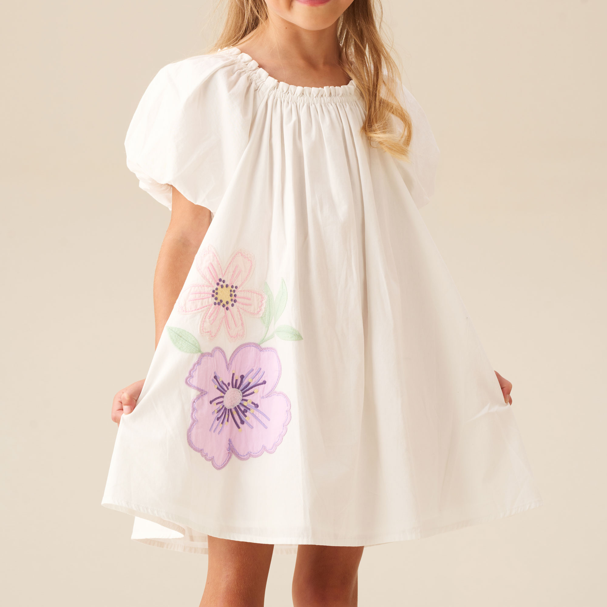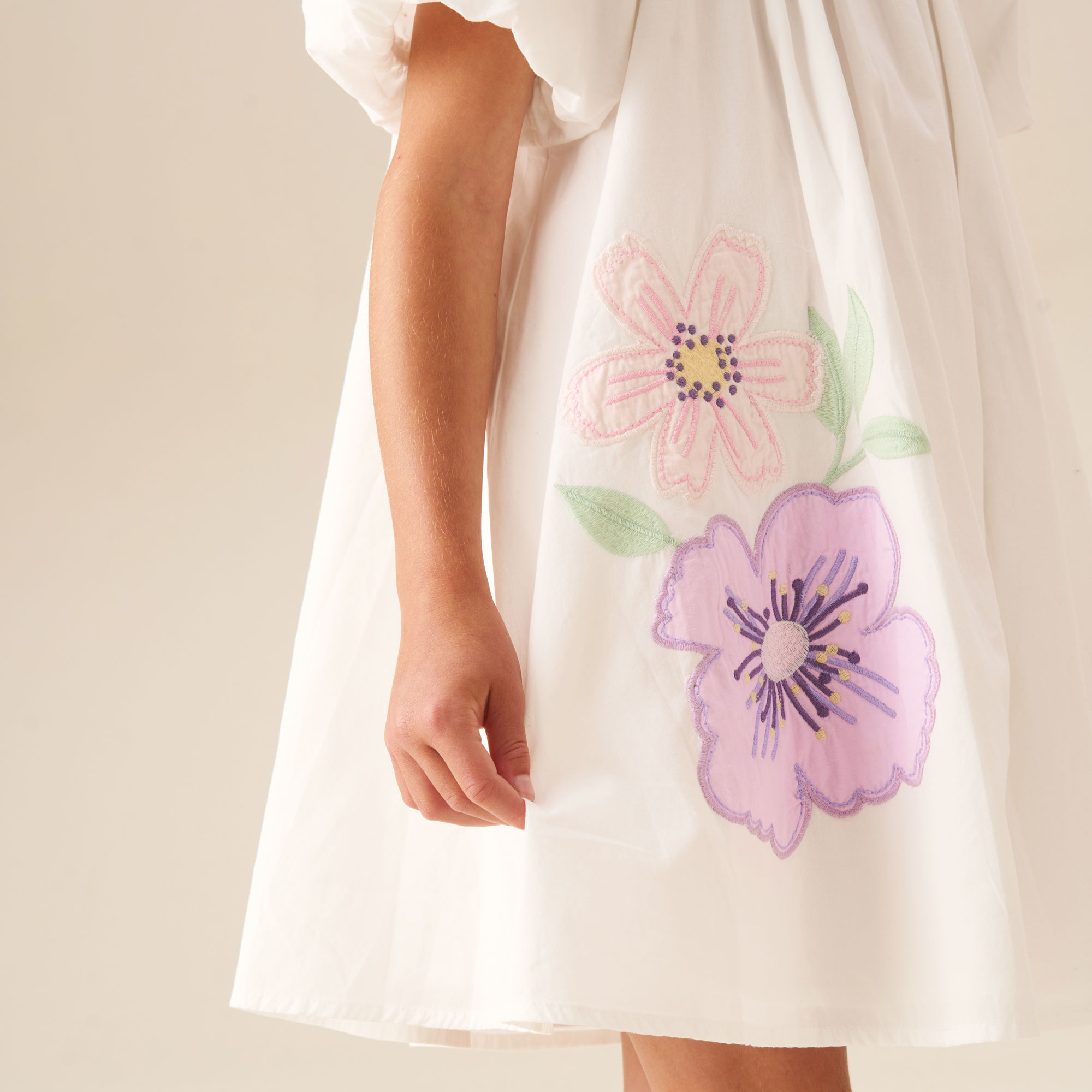- Embroidered applique flowers, swing silhouette