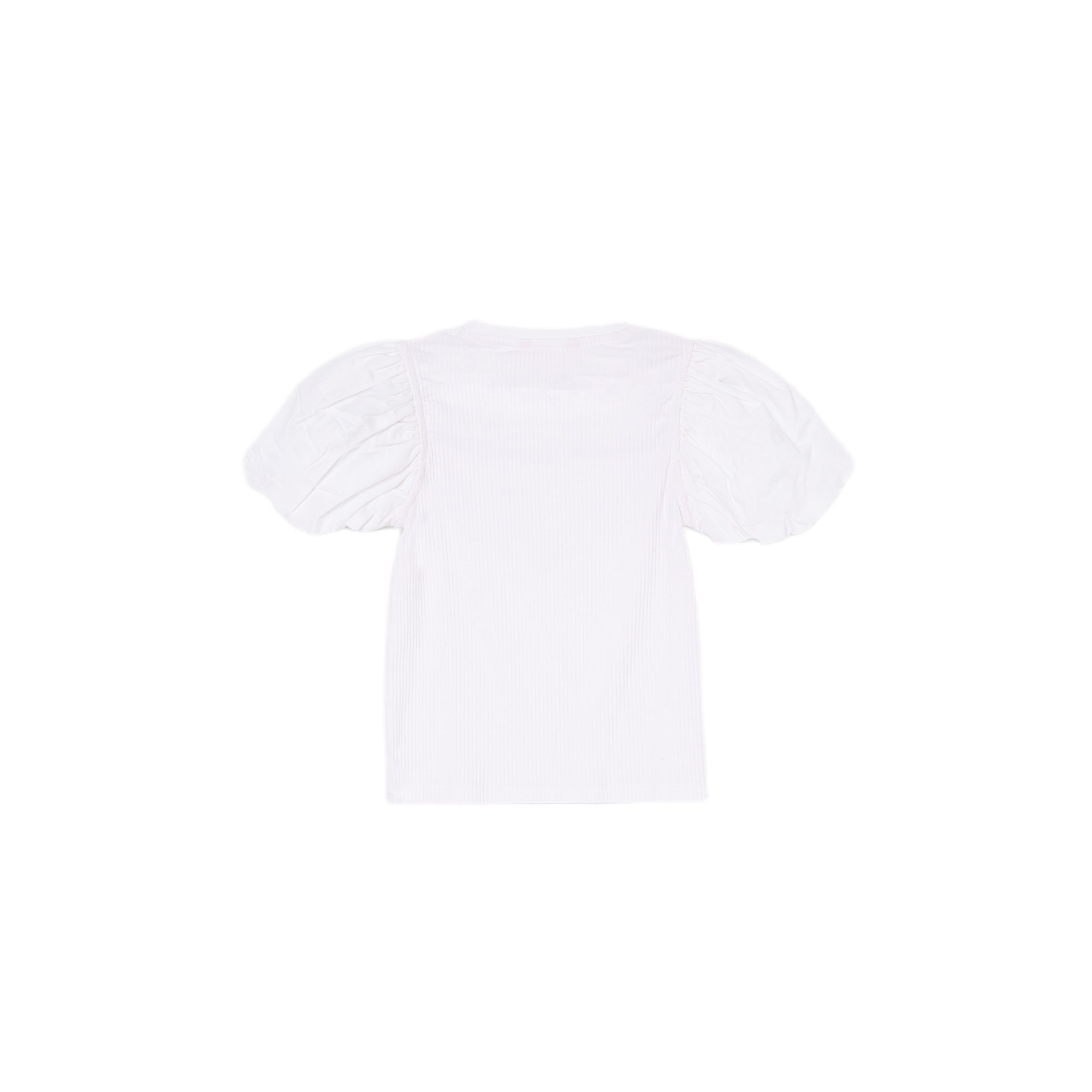 - Woven short puff sleeves, jersey body, ruffle heart detailing, crew neckline, brand logo charm