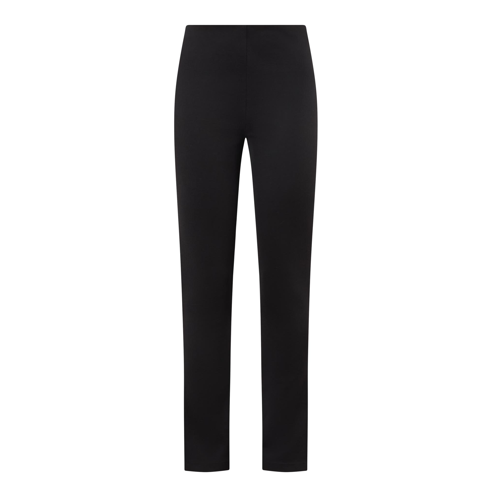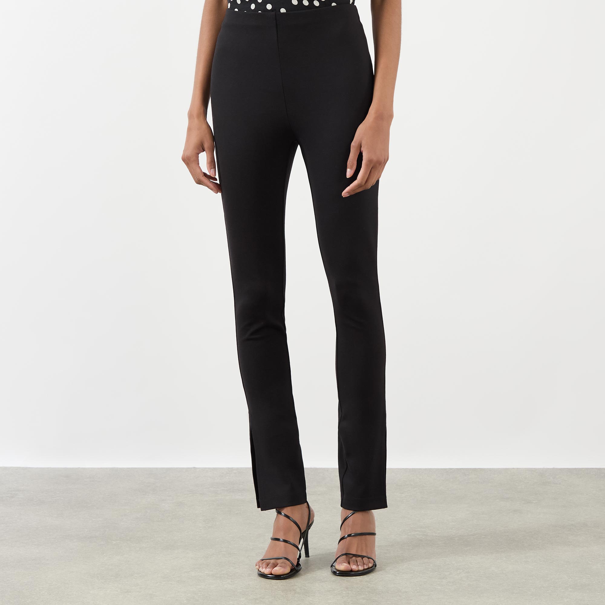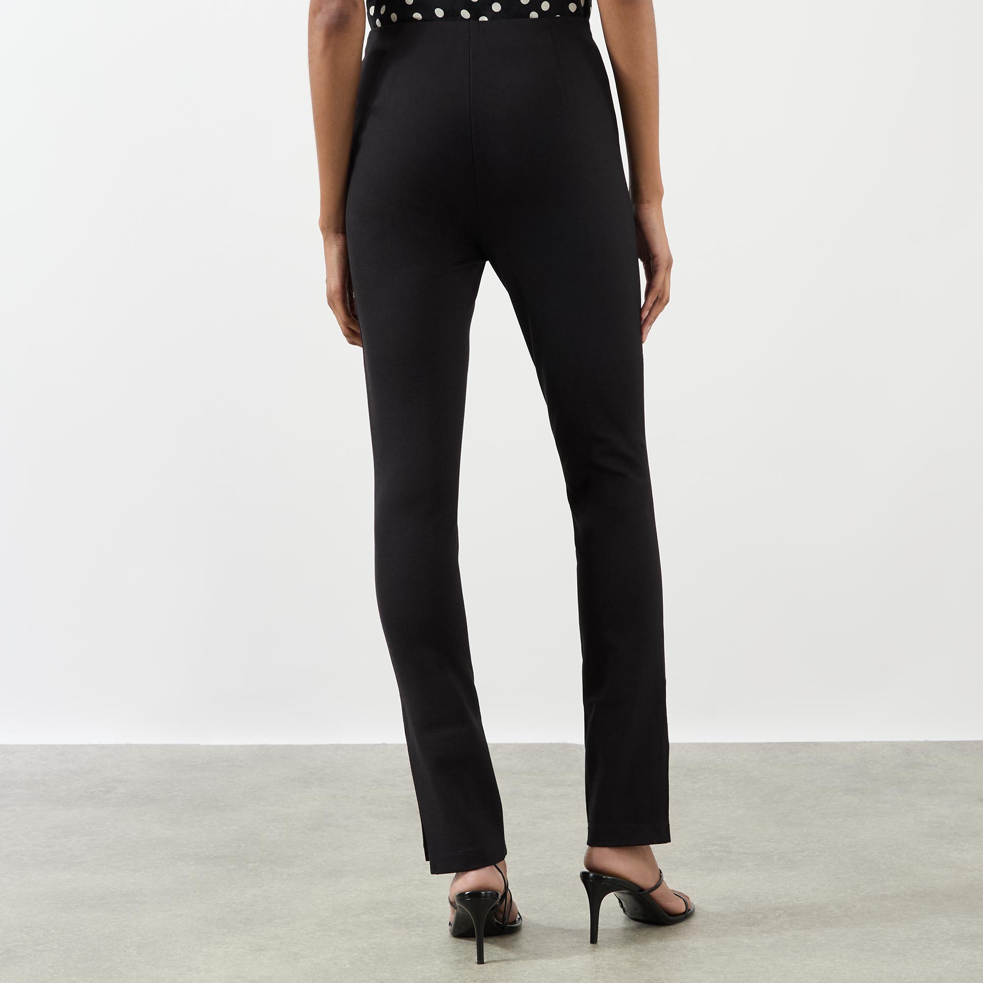 - High rise, slim leg, covered waistband, clean hems, split cuffs, tonal stitching, smooth finish