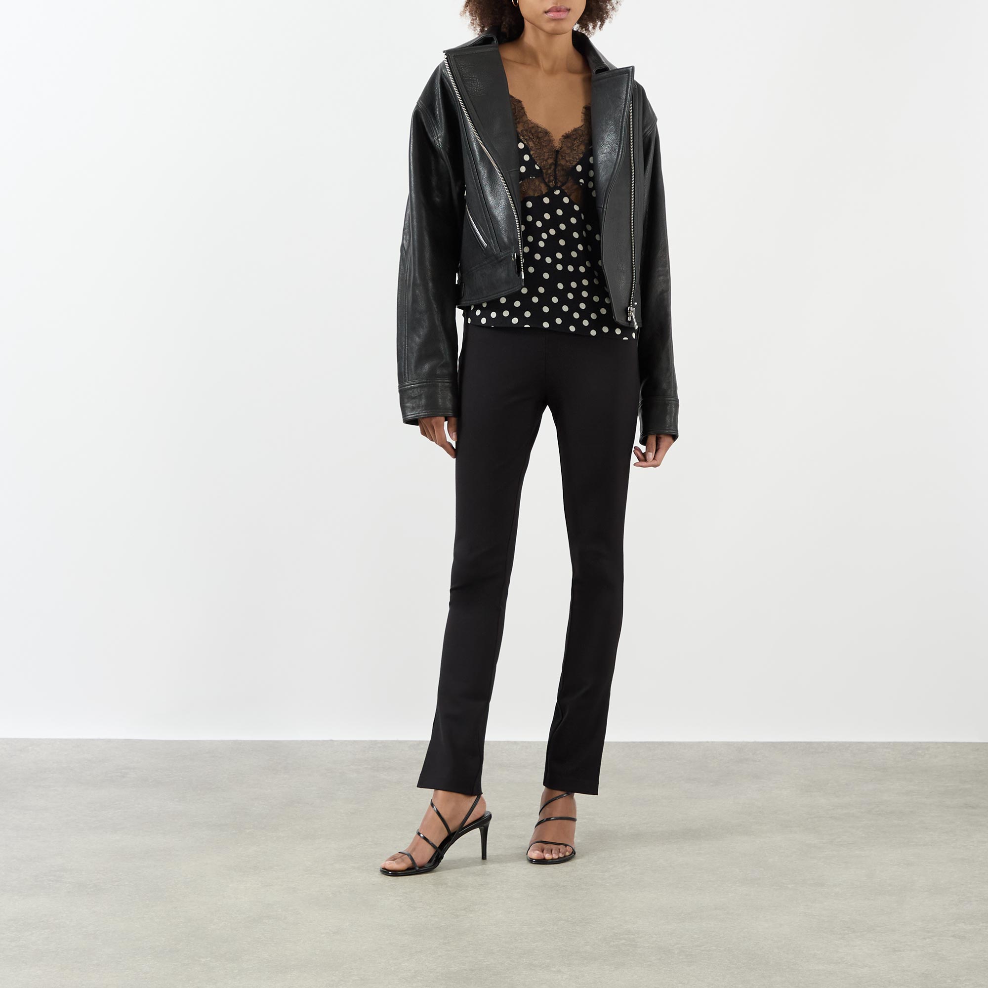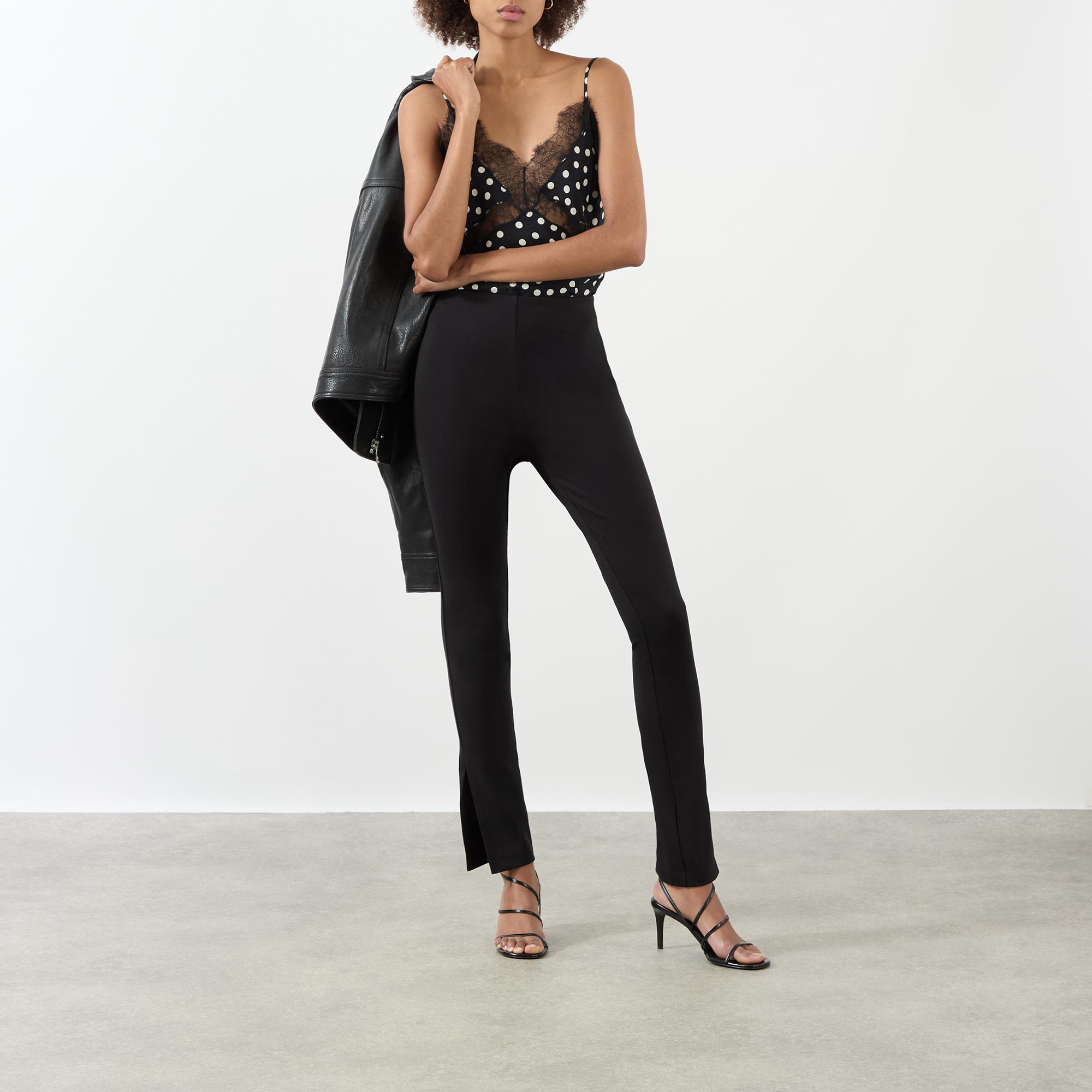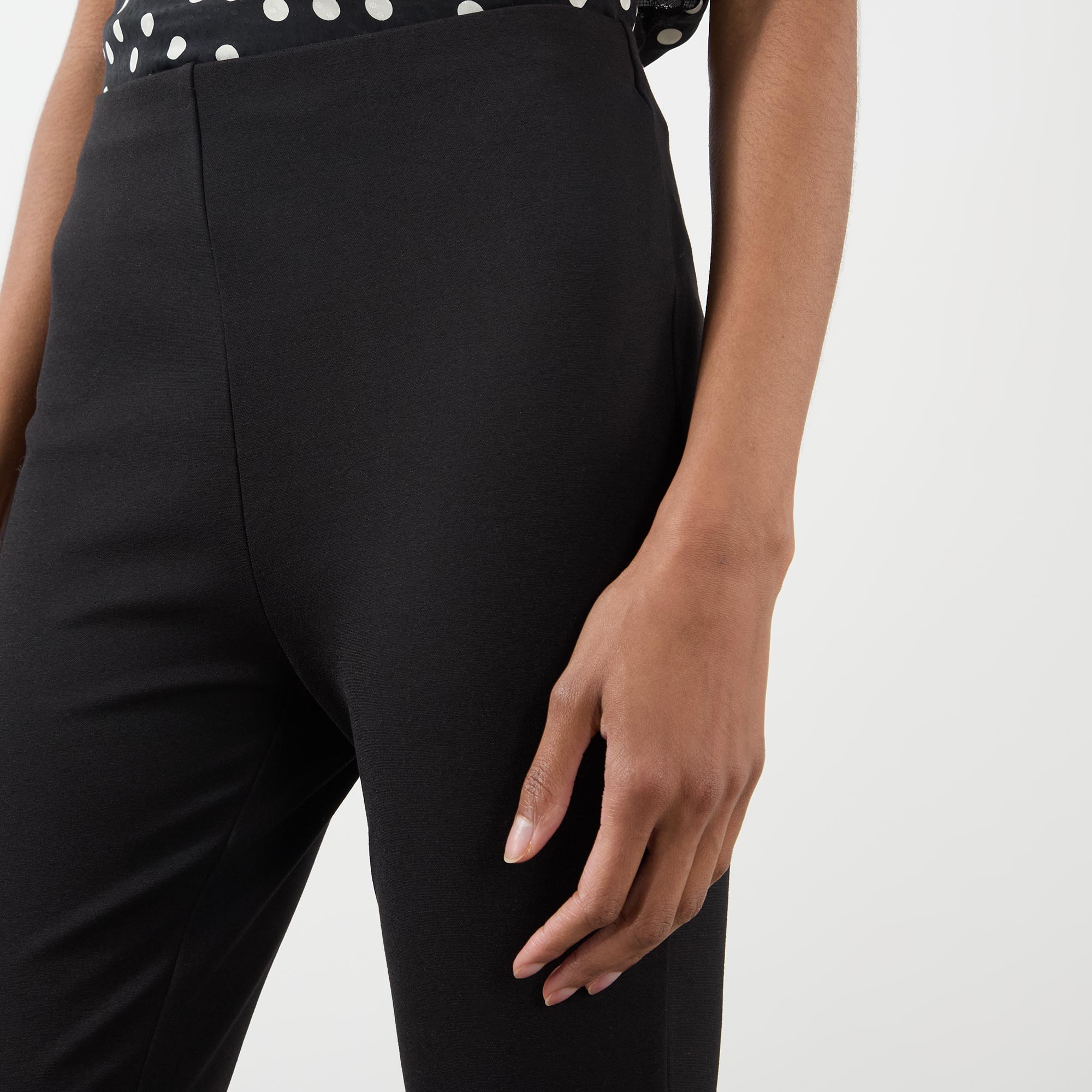 - High rise, slim leg, covered waistband, clean hems, split cuffs, tonal stitching, smooth finish