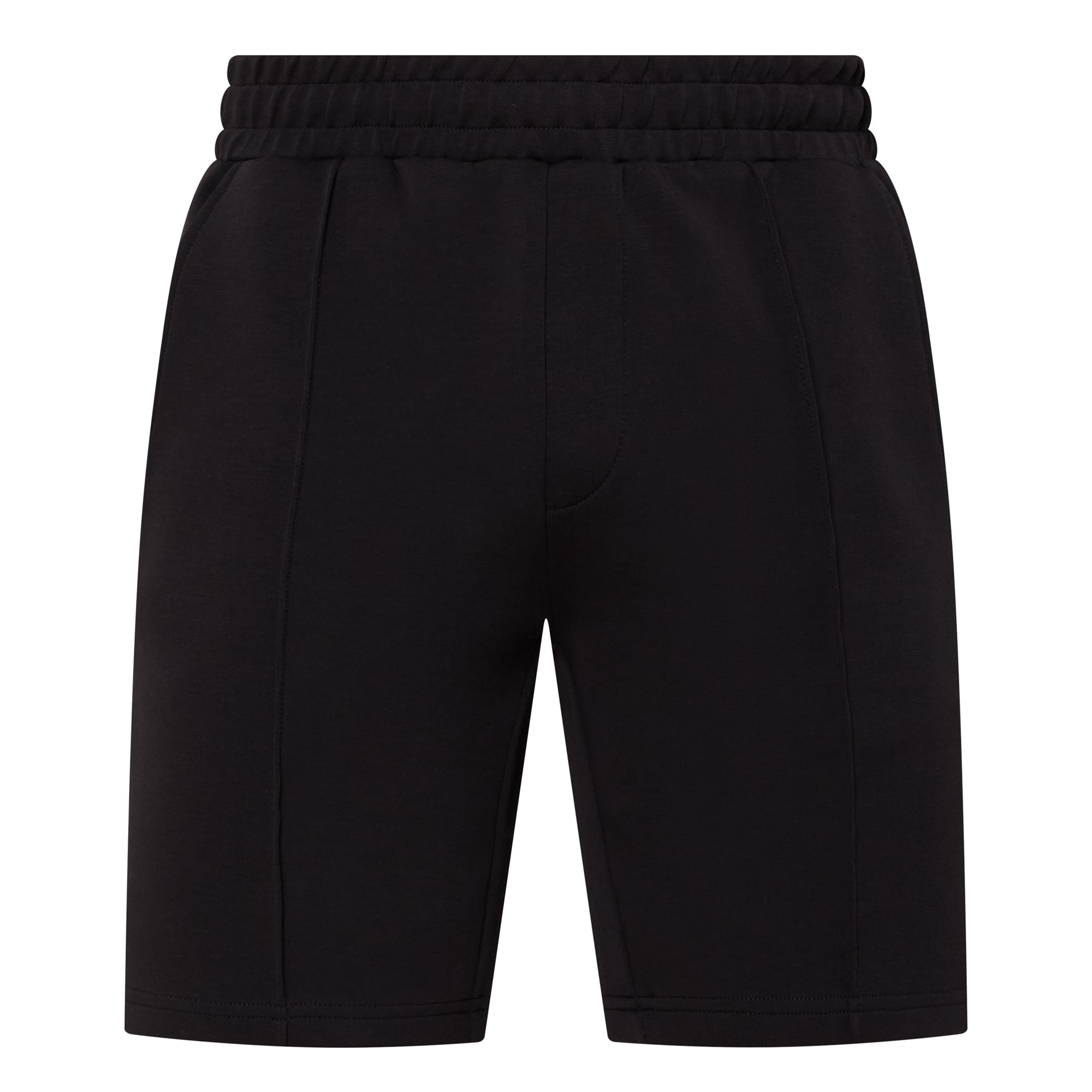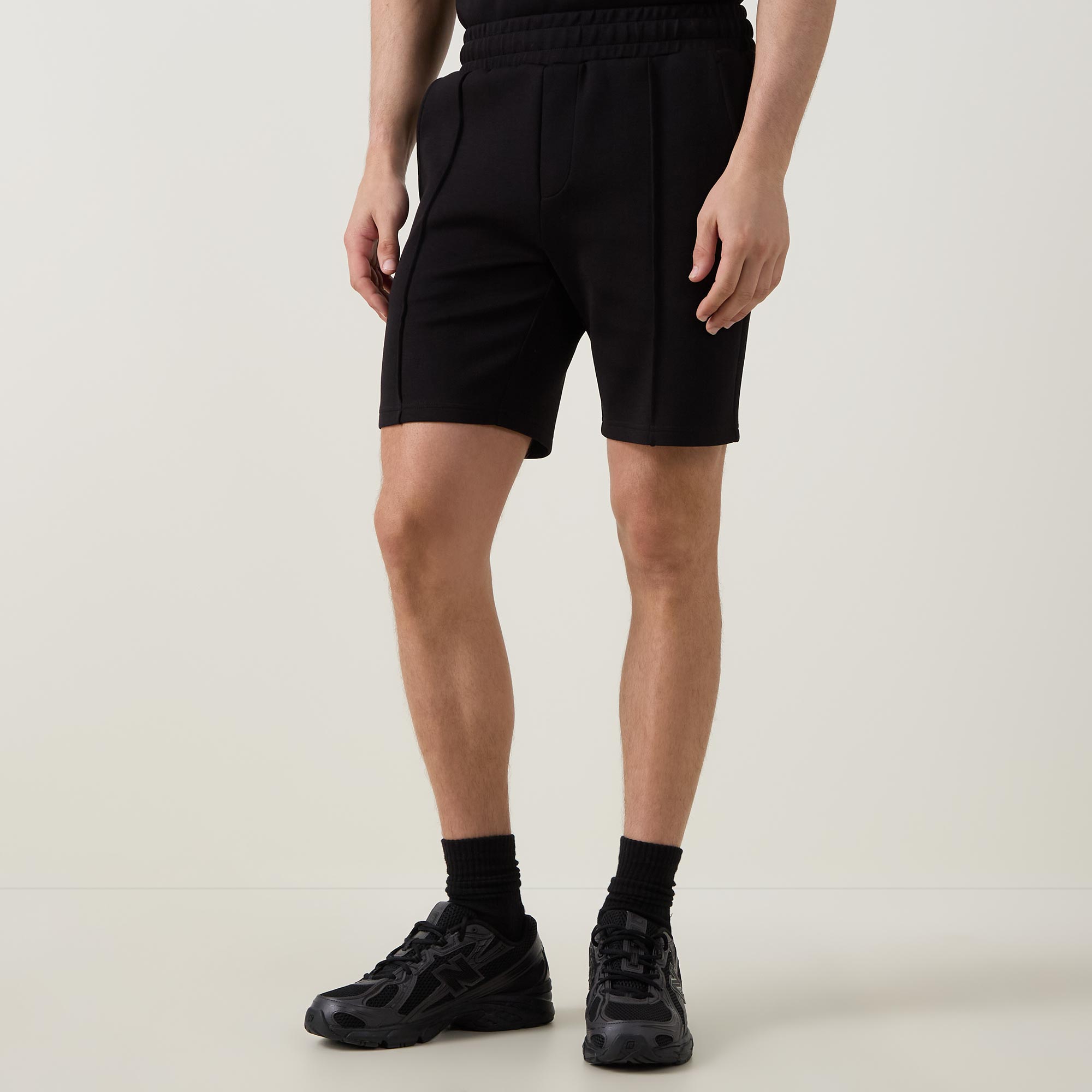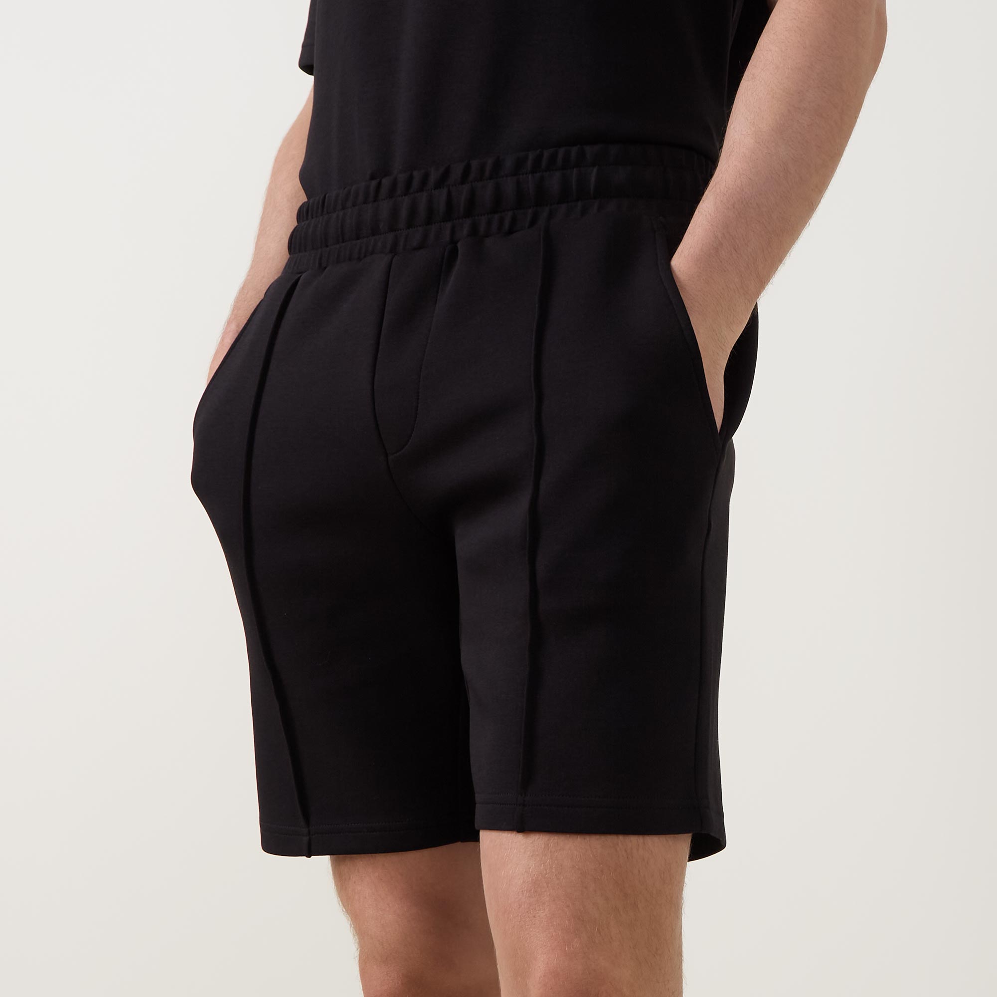 - Mid-rise, straight-leg, above-the-knee length, elasticated waistband, adjustable drawstring fastening, two side entry pockets, one rear welt pocket, straight hems, pin tuck detailing, tonal stitching, ultra soft finish, mid weight fabrication