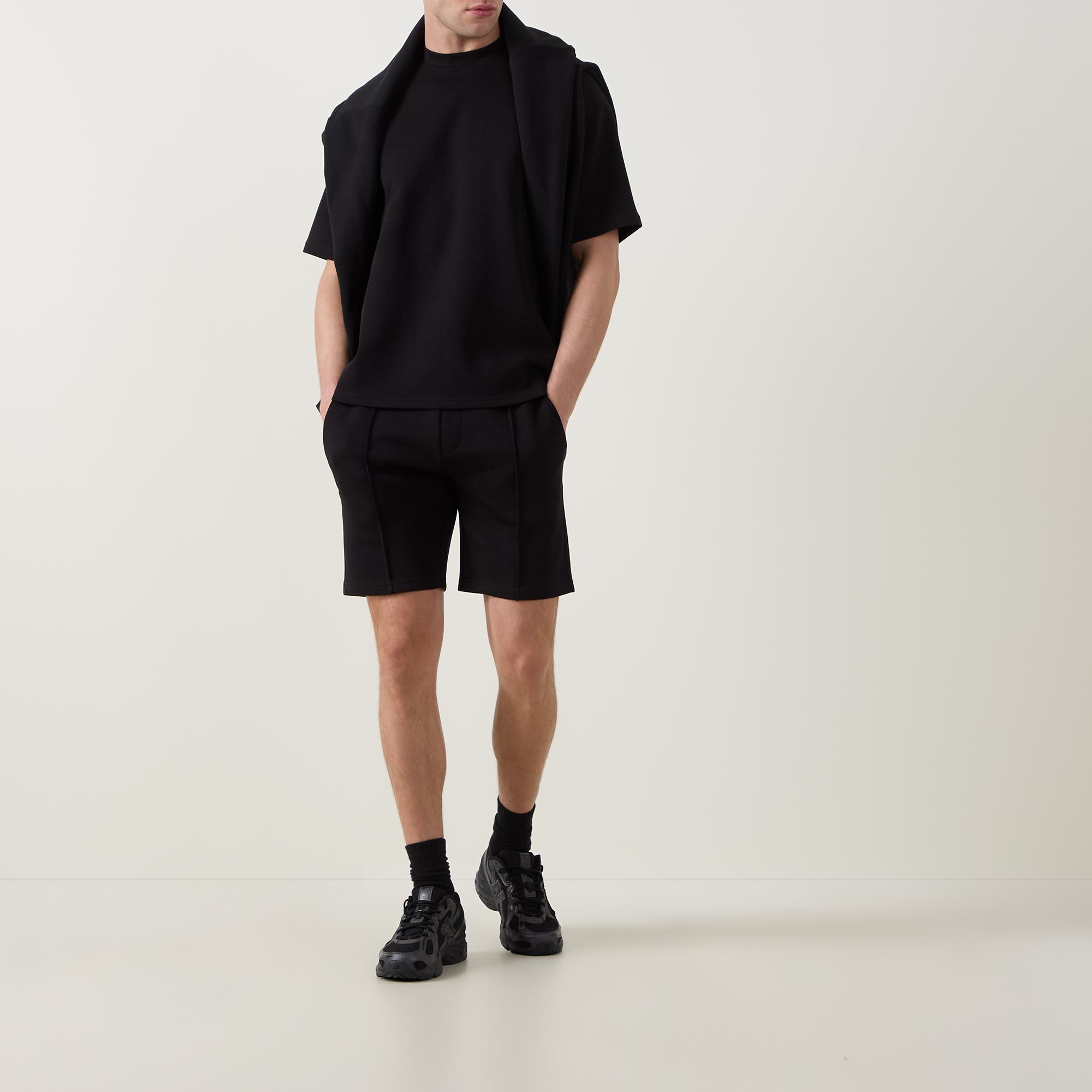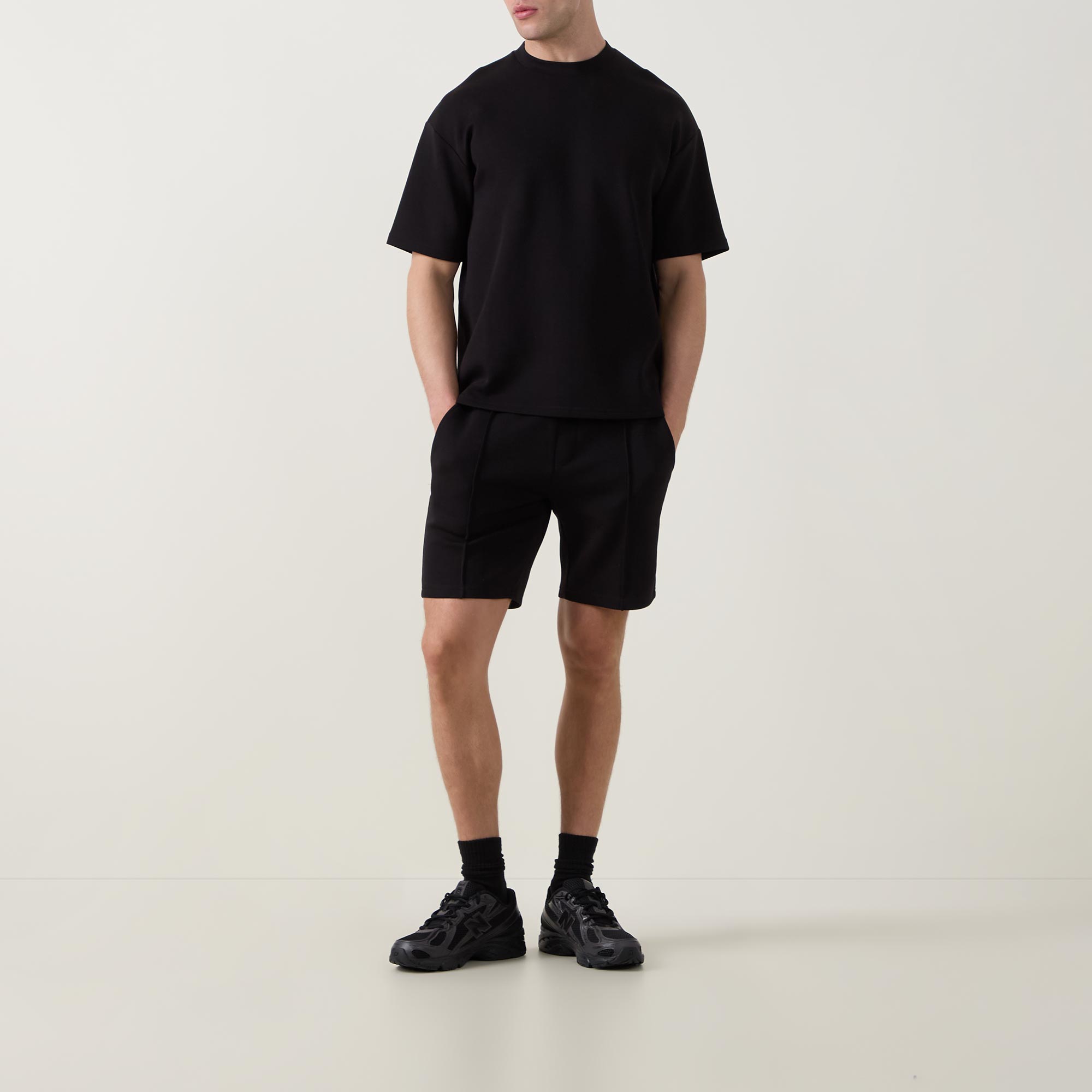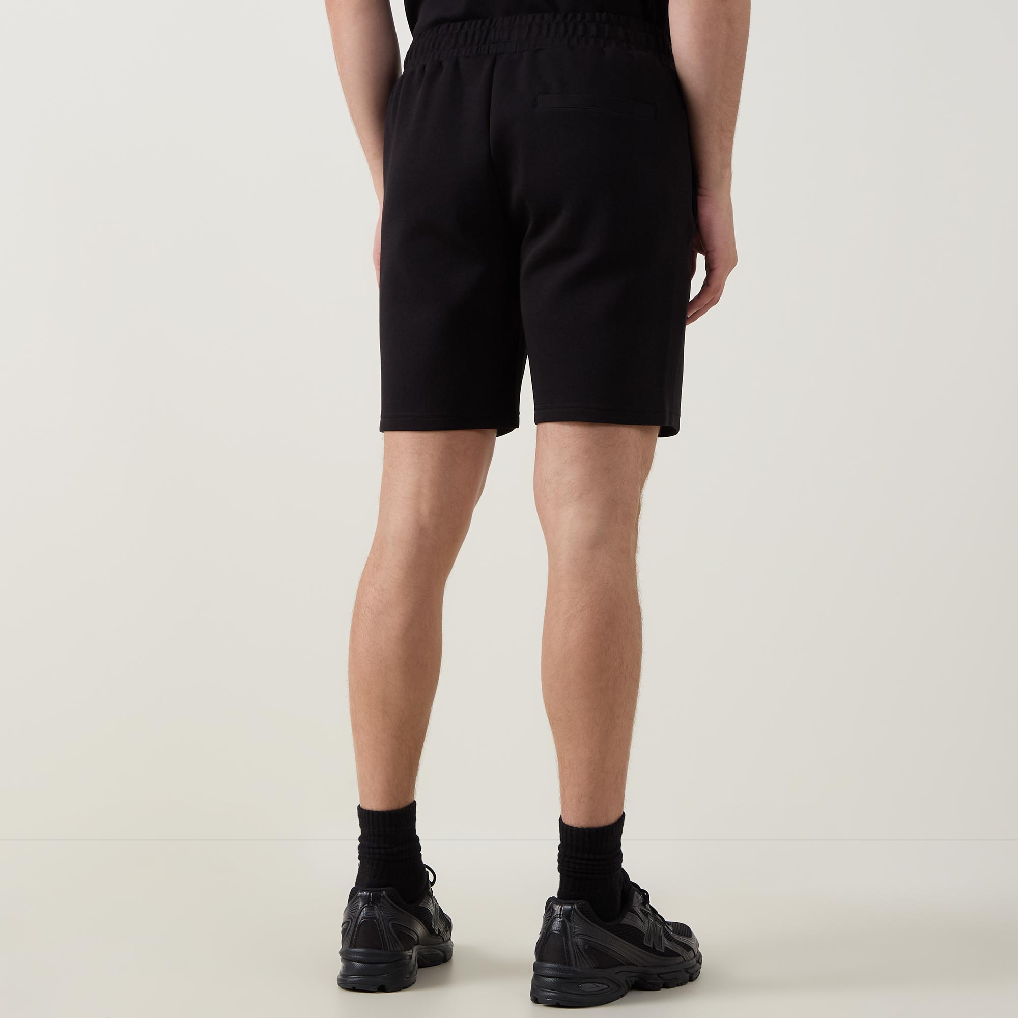- Mid-rise, straight-leg, above-the-knee length, elasticated waistband, adjustable drawstring fastening, two side entry pockets, one rear welt pocket, straight hems, pin tuck detailing, tonal stitching, ultra soft finish, mid weight fabrication