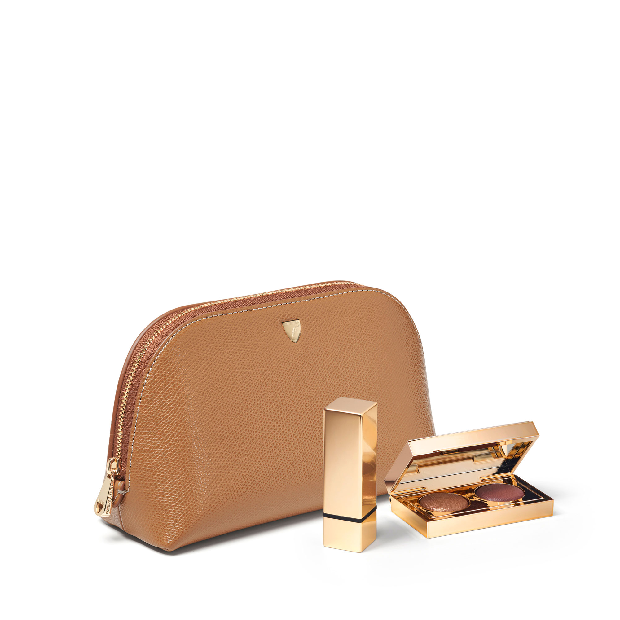 - Makeup case, handcrafted, full-grain leather, water-resistant finish, signature hardware