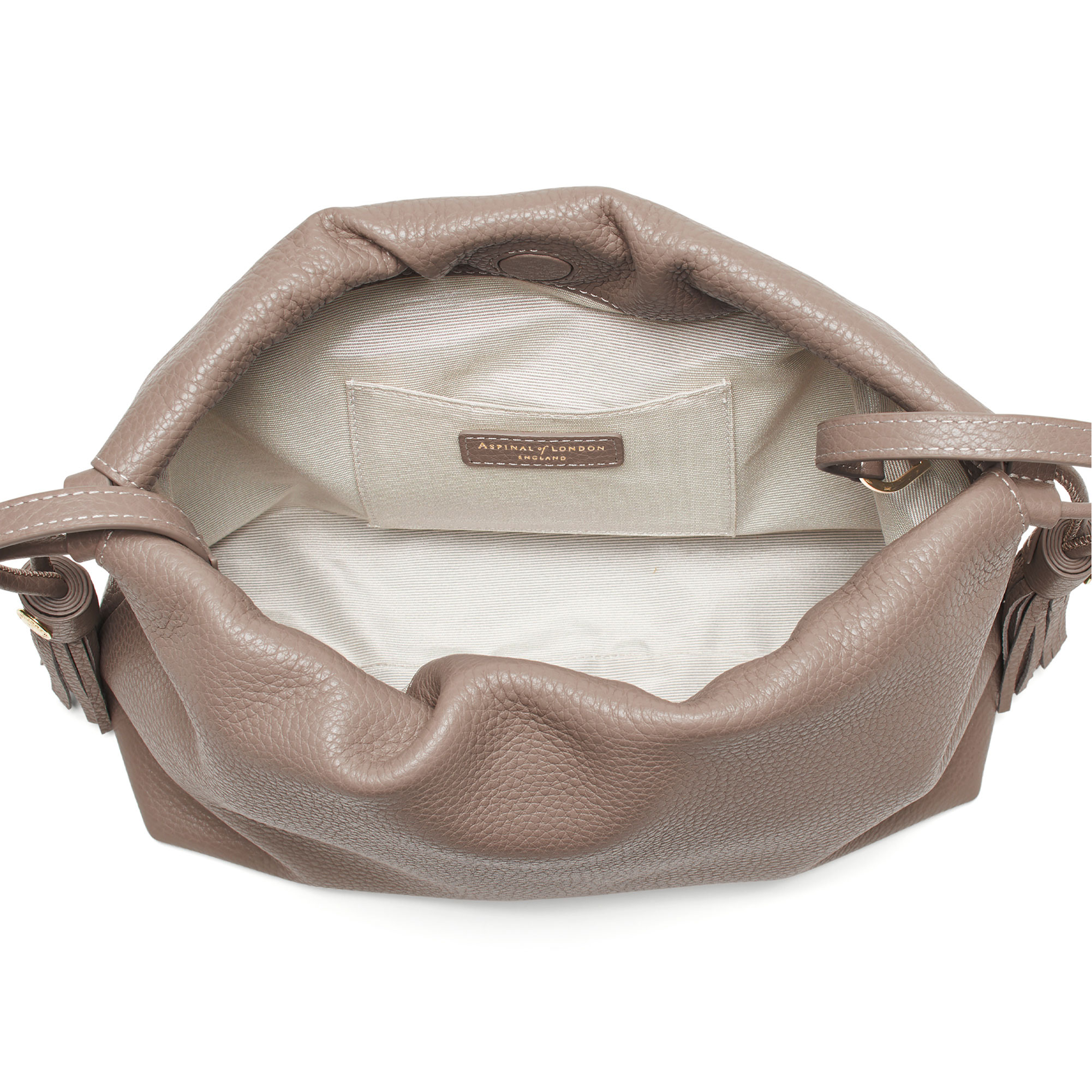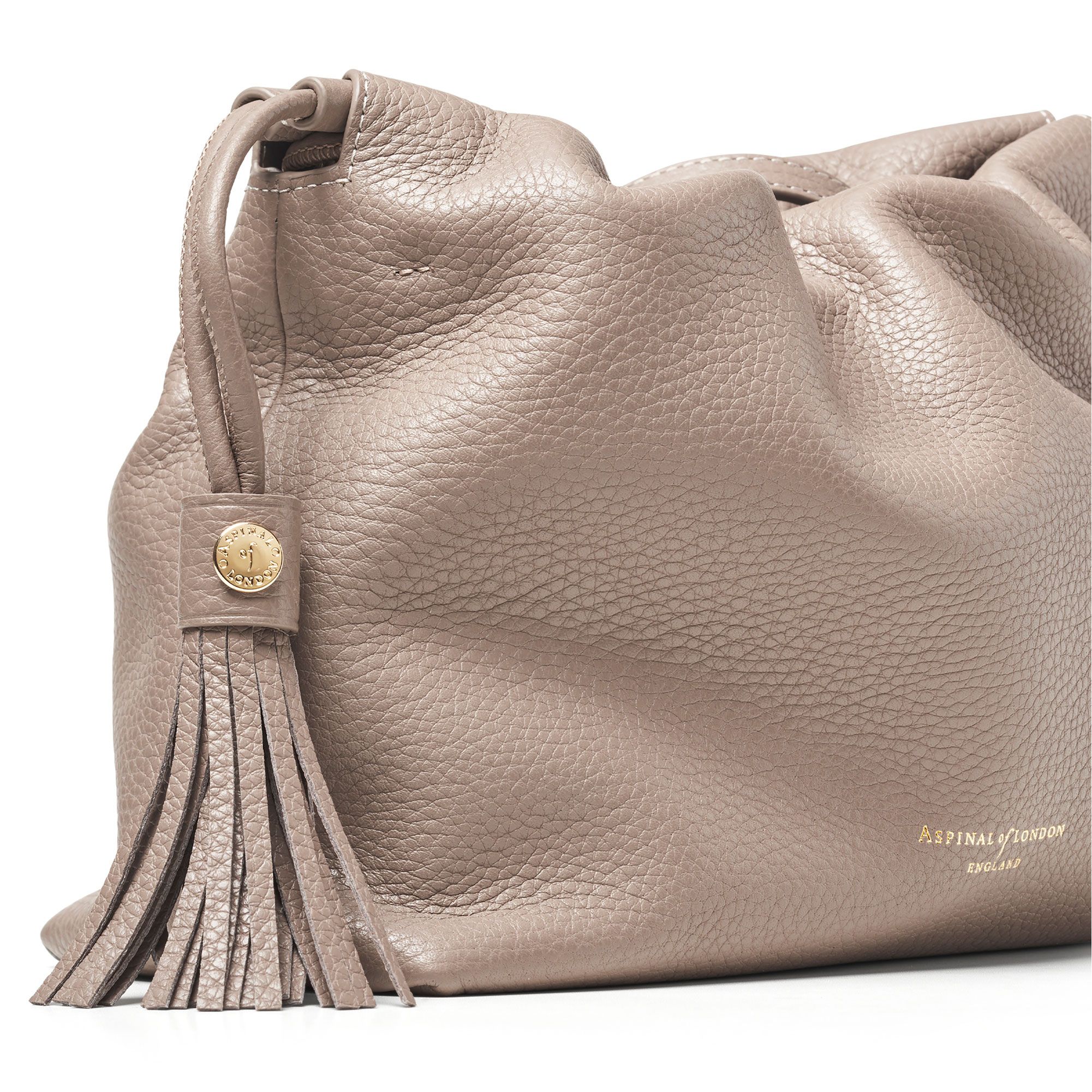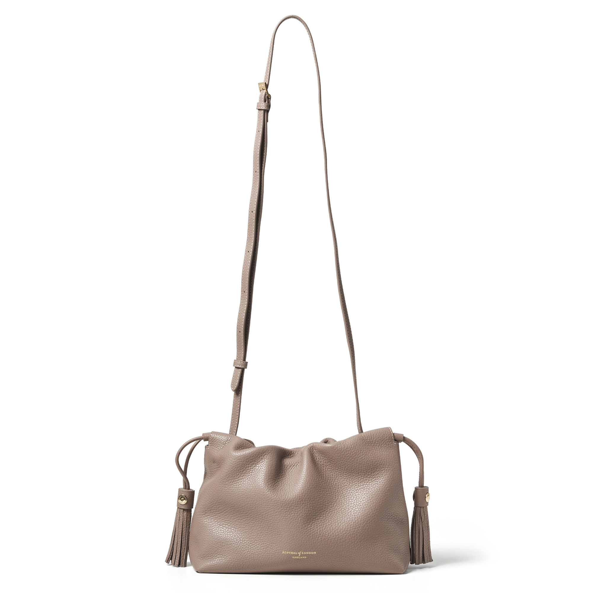 - Handcrafted, small-grain milled pebble leather, relaxed silhouette, pouch style, drawstring closure, dual tassel charms, hidden magnetic fastening, adjustable crossbody strap, signature hardware