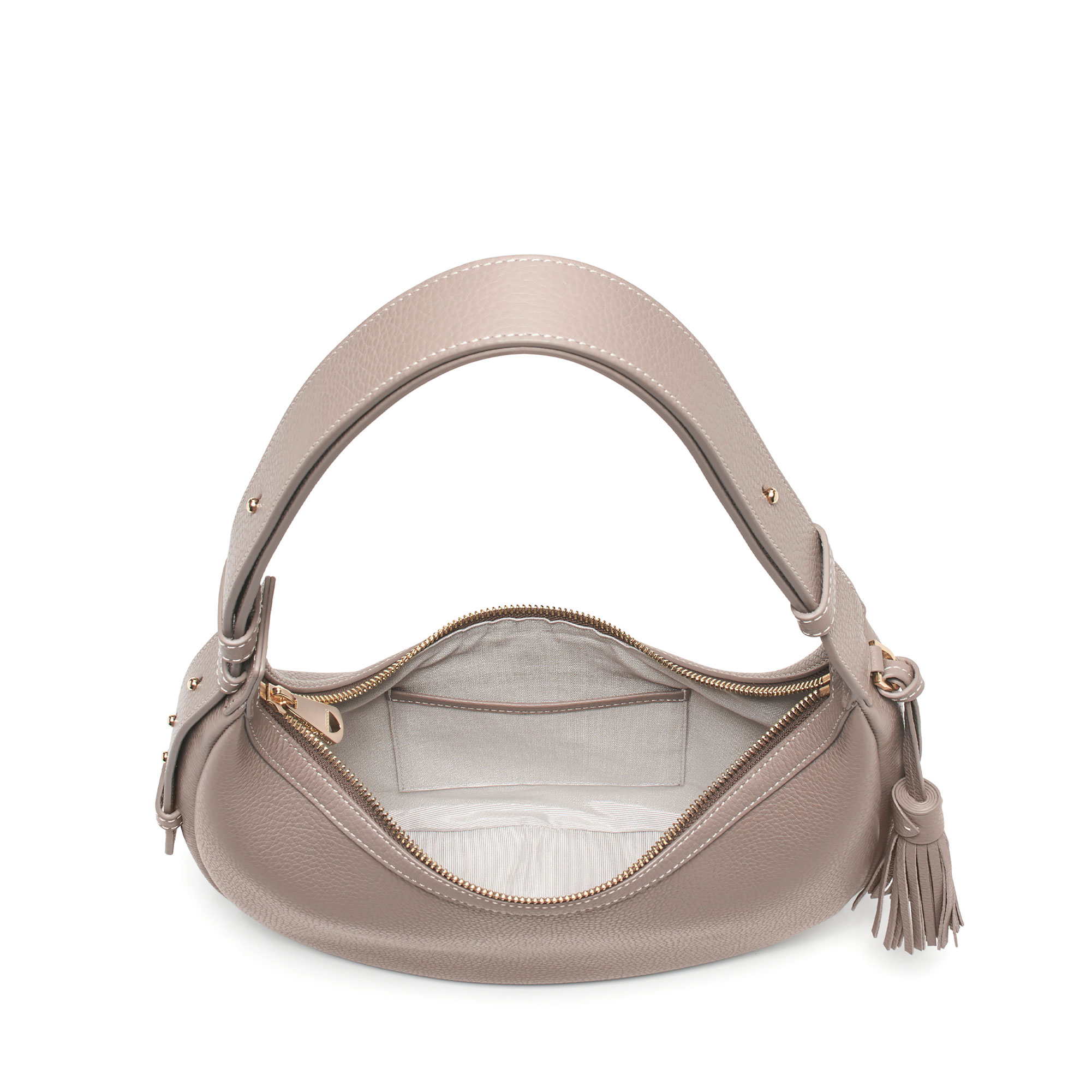 • Handcrafted, soft feel, crescent silhouette, signature hardware, equestrian-inspired bridle stud strap fastening, detachable brand shield plaque charm