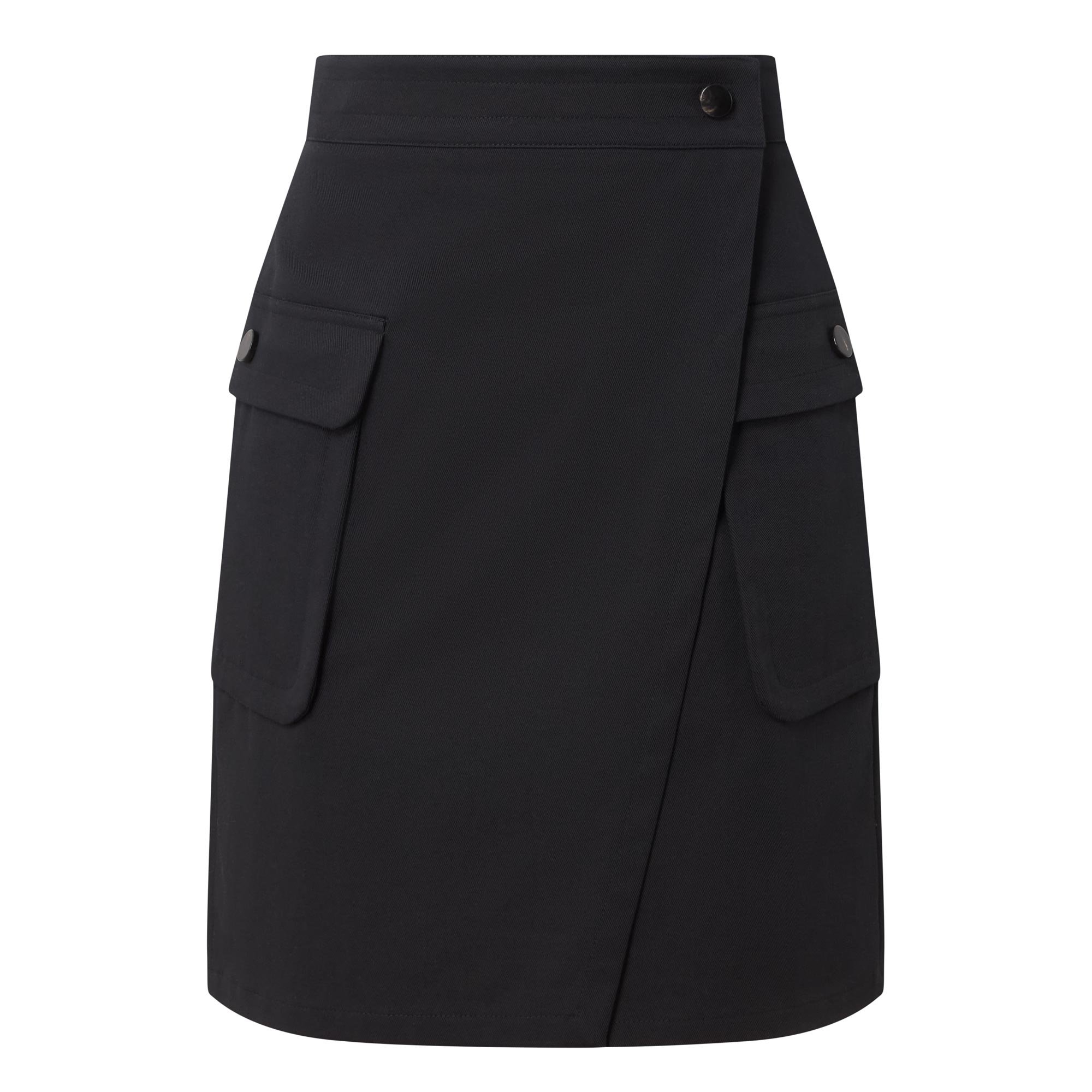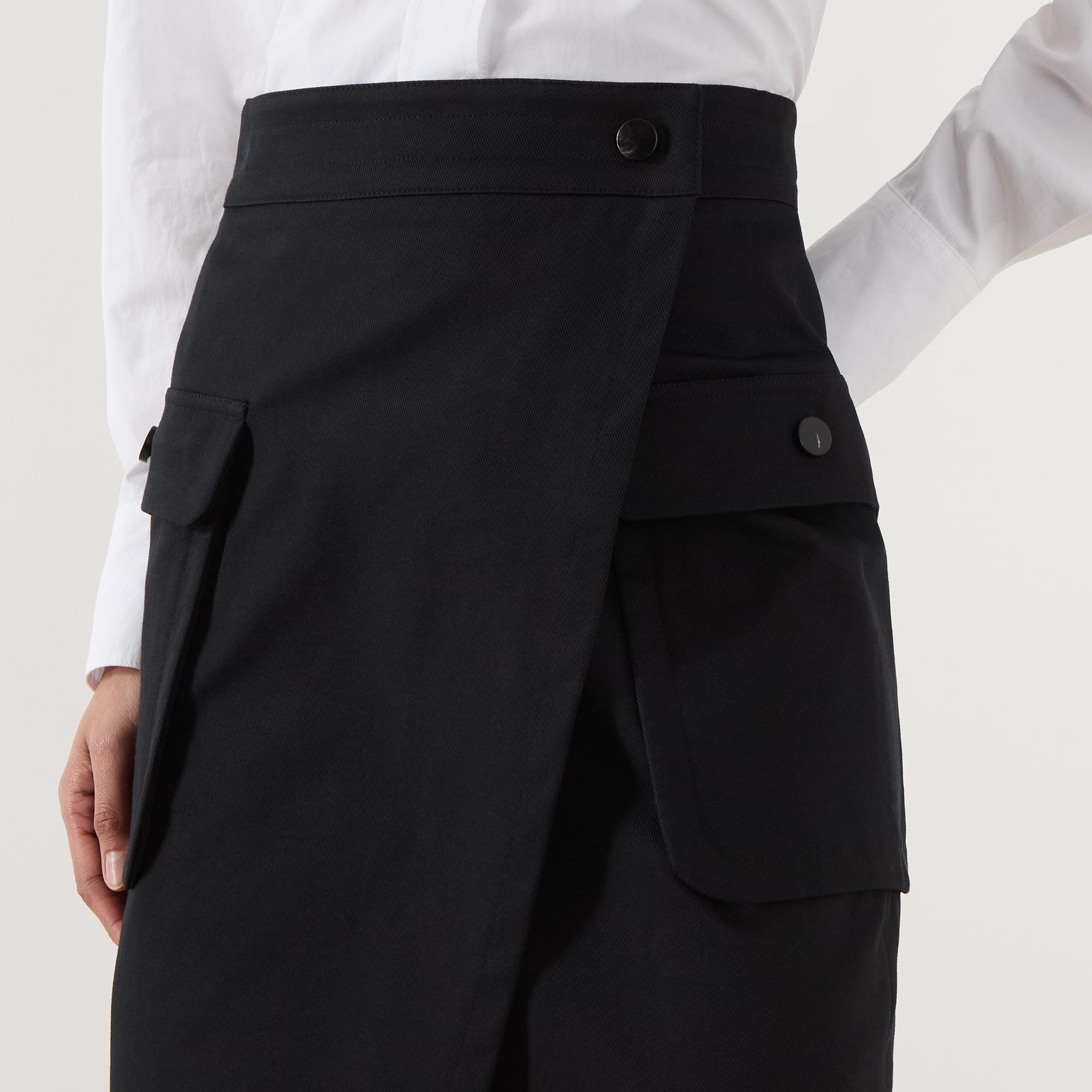 - High rise, wrap-style design, covered waistband, button fastening, two side cargo pockets with button fastenings, straight hem, rear logo badge, mini length