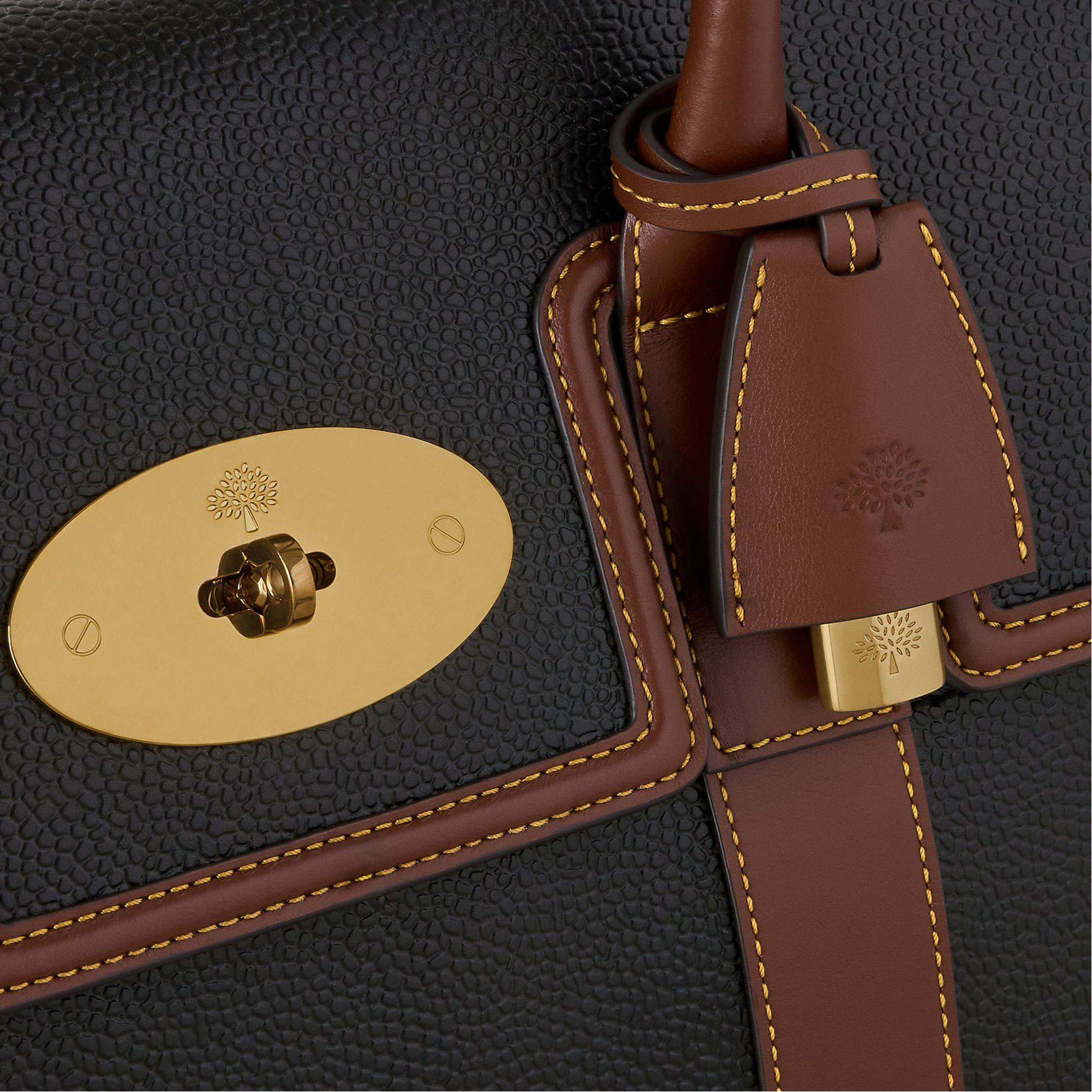- Postman's lock closure, two top handles, one main compartment, one internal zip pocket, two internal slip pockets, hanging leather fob with hidden padlock, brass hardware