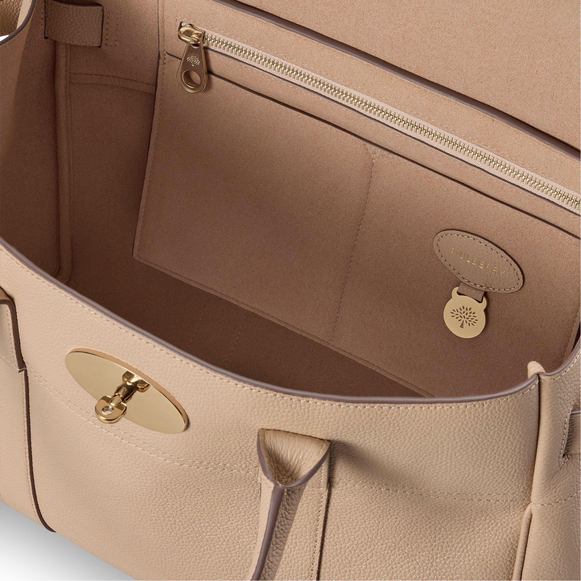 - Postman's lock closure, two top handles, one main compartment, one internal zip pocket, two internal slip pockets, hanging leather fob with hidden padlock, four metal feet on base, soft gold-tone hardware, lined