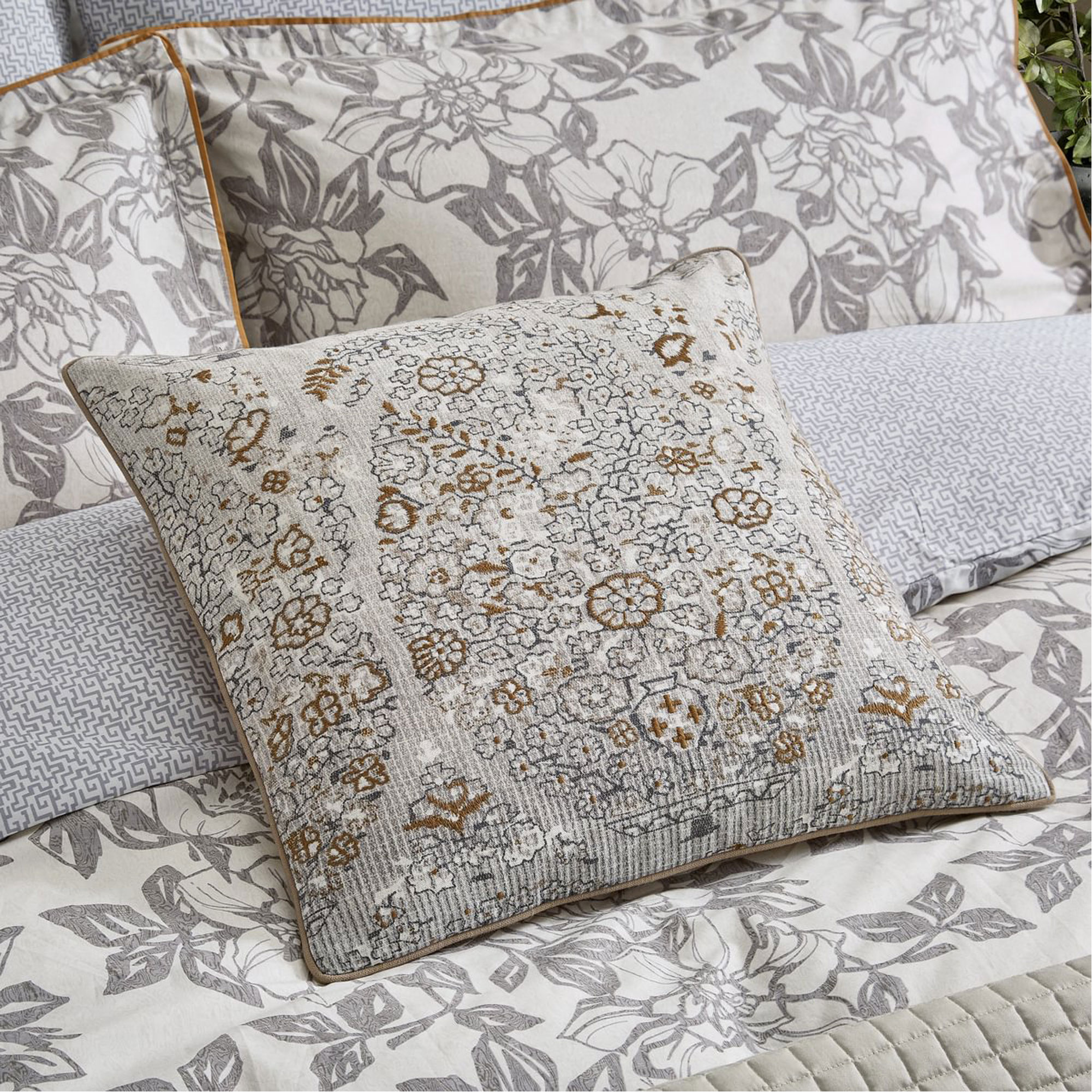 Stripes are timeless, bringing enduring style and sophistication to any bedroom. This design features a multi-width stripe rendered in a neutral palette of charcoal grey, chalk, and tan, printed on smooth 200 thread count cotton percale. The reverse of the duvet cover and coordinating standard pillowcases showcase a delicate pinstripe for a subtle contrast. The linear motif continues with square pillowcases finished with ribbon trim and a beautifully quilted cotton throw. A paisley-patterned cushion, adorned with intricate embroidery, adds the perfect finishing touch to this elegant, layered bed. Duvet Set includes pillowcase(s). These white cotton square pillowcase pairs are adorned with a charcoal grey striped ribbon trim for an elegant finishing touch. Complete the look with the Alba/Maria Cushion and throw in the shade Charcoal, a generously sized quilted cotton throw, perfect for adding comforting layers on cooler nights. Finished with a 10cms bound edge and fully reversible.